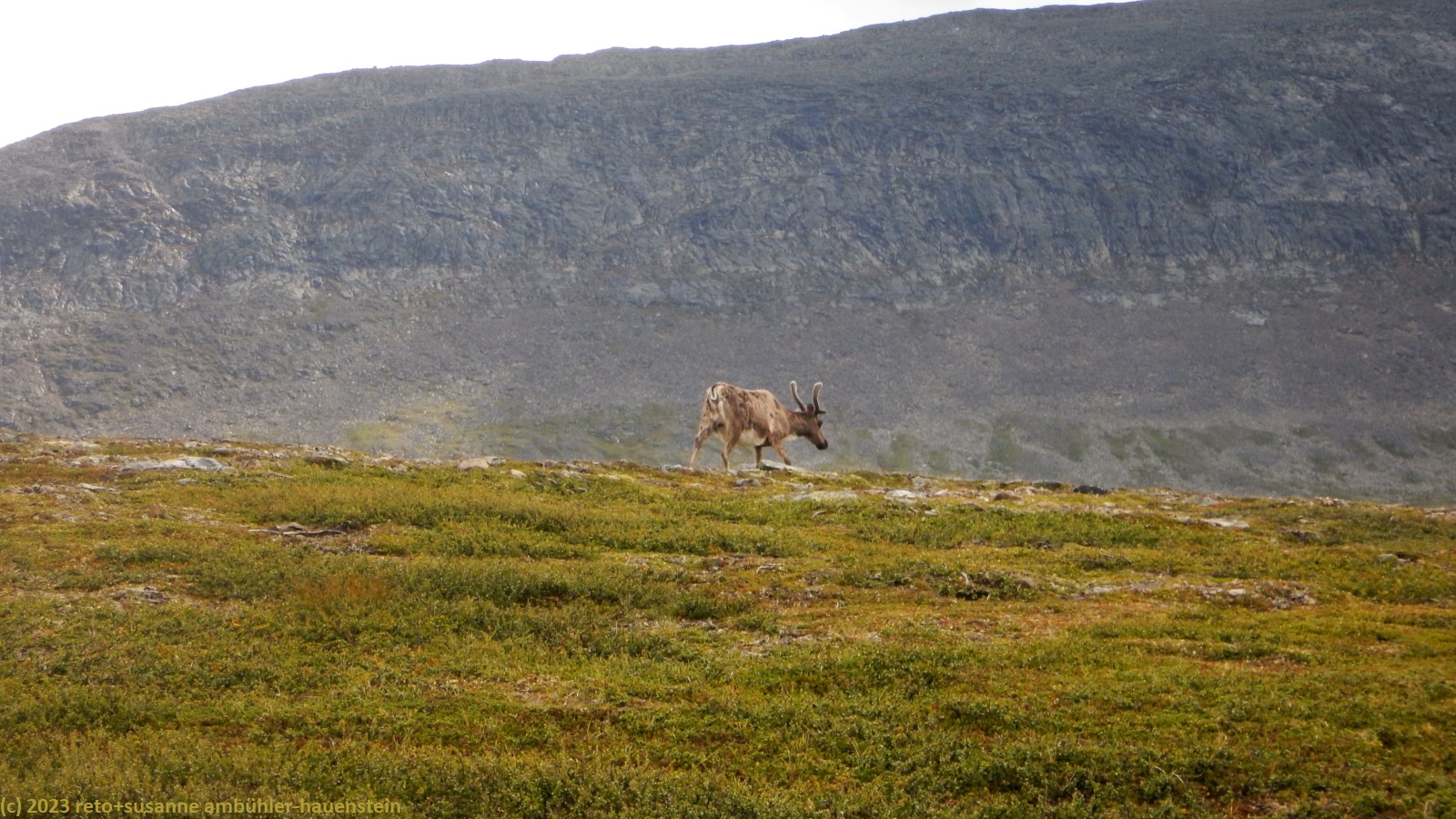 bis zum nachtessen bleibt uns noch eine gute halbe stunde. wir richten uns ein und erfrischen uns unter der dusche, die sauna muss bis nach dem essen warten. das nachtessen findet im üblichen rahmen statt, das heisst, zuerst erzählt jemand aus der küchenmannschaft etwas über die station, dann wird das nachtessen erläutert und das weinangebot präsentiert. heute teilen wir uns den tisch mit fünf schweden. es ist uns schon auf der ganzen wanderung aufgefallen, dass um diese jahreszeit nur ganz wenige ausländer unterwegs sind. gelegentlich hört man leute englisch sprechen, aber kein deutsch, kein schweizerdeutsch und auch kein holländisch. auch heute gibt es vollkornreis, im gegensatz zu gestern aber nicht mit linsen, sondern mit lachs. es schmeckt hervorragend. bevor die ebenfalls äusserst leckere nachspeise serviert wird, singen die köchin und zwei junge damen aus dem küchenteam eine jämtländische volksweise. die köchin hat heute ihren letzten arbeitstag in der fjällstation und hat sich dieses lied zum abschied gewünscht. sie singen erstaunlich schön, entsprechend herzlich ist der applaus. um 19:45 uhr verlassen wir den speisesaal und setzen uns für eine weile in die sauna, das tut gut. den abend verbringen wir in unserem zimmer mit lesen und tagebuch schreiben. draussen giesst es immer wieder. angeblich soll es morgen trocken bleiben, wir sind gespannt. kurz nach 22 uhr löschen wir das licht und legen uns schlafen.
