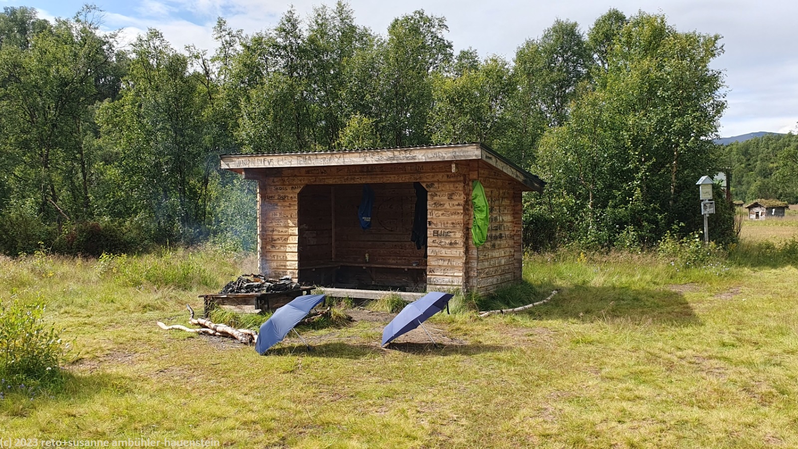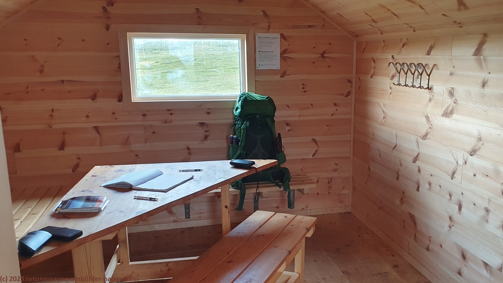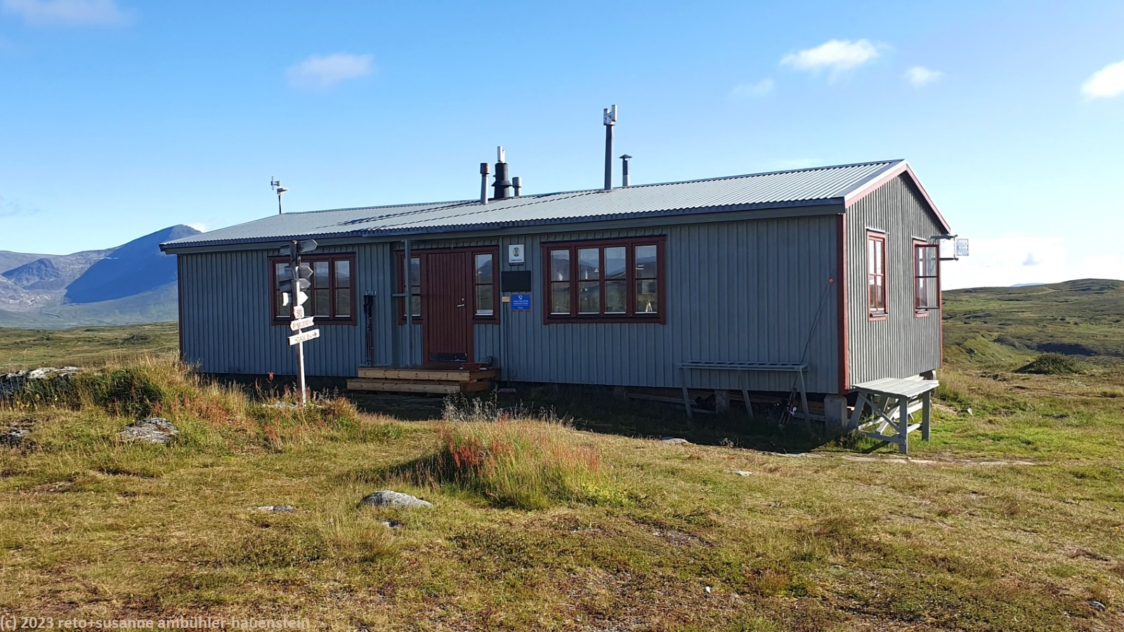 es zeichnet sich aber schon bald eine wetteränderung ab. wenig später ist der himmel wieder mit grauen wolken bedeckt, es bleibt aber vorerst trocken. anfangs ist der weg ziemlich flach und auch heute oft sumpfig. kurz nach 11 uhr erreichen wir die schutzhütte svaaletjahke. keine minute zu früh, denn kaum haben wir die türe hinter uns geschlossen, beginnt es zu regnen. wenig später erhalten wir gesellschaft von einem vater und seiner tochter.