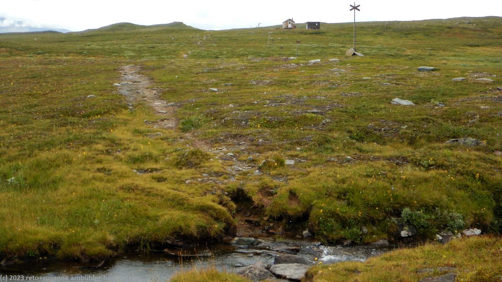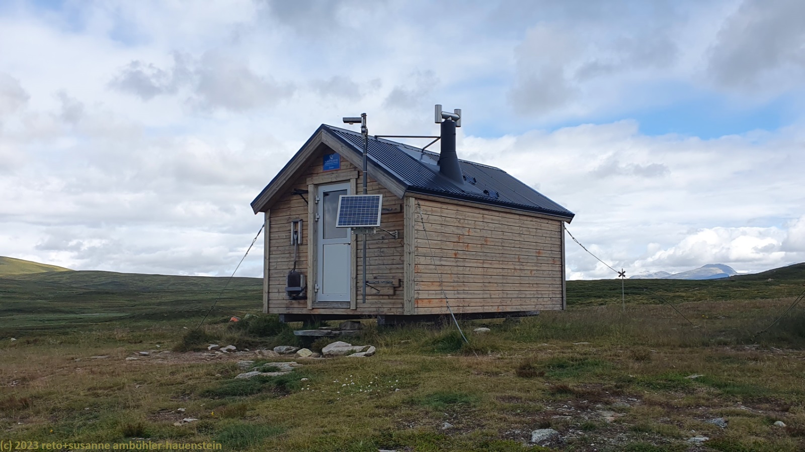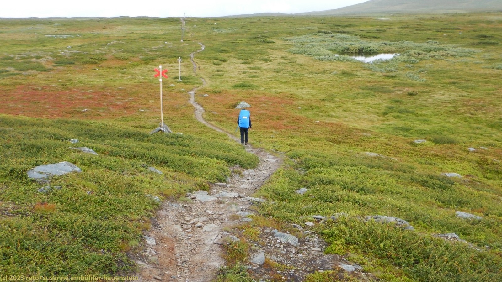 es zeichnet sich aber schon bald eine wetteränderung ab. wenig später ist der himmel wieder mit grauen wolken bedeckt, es bleibt aber vorerst trocken. anfangs ist der weg ziemlich flach und auch heute oft sumpfig. kurz nach 11 uhr erreichen wir die schutzhütte svaaletjahke. keine minute zu früh, denn kaum haben wir die türe hinter uns geschlossen, beginnt es zu regnen. wenig später erhalten wir gesellschaft von einem vater und seiner tochter.