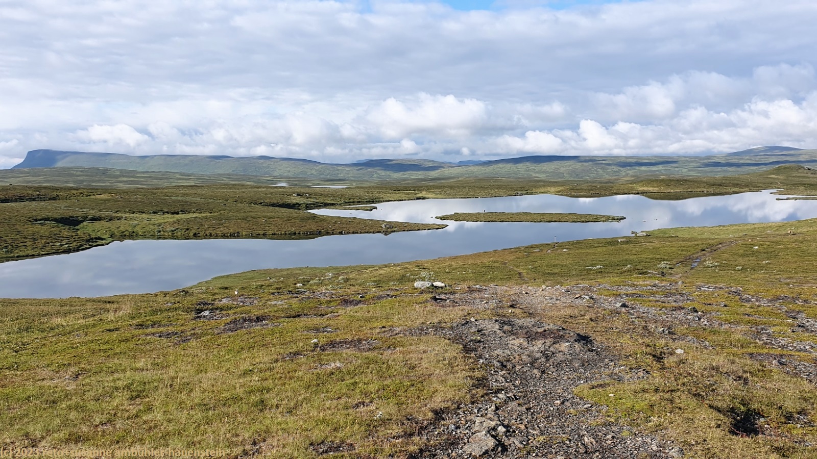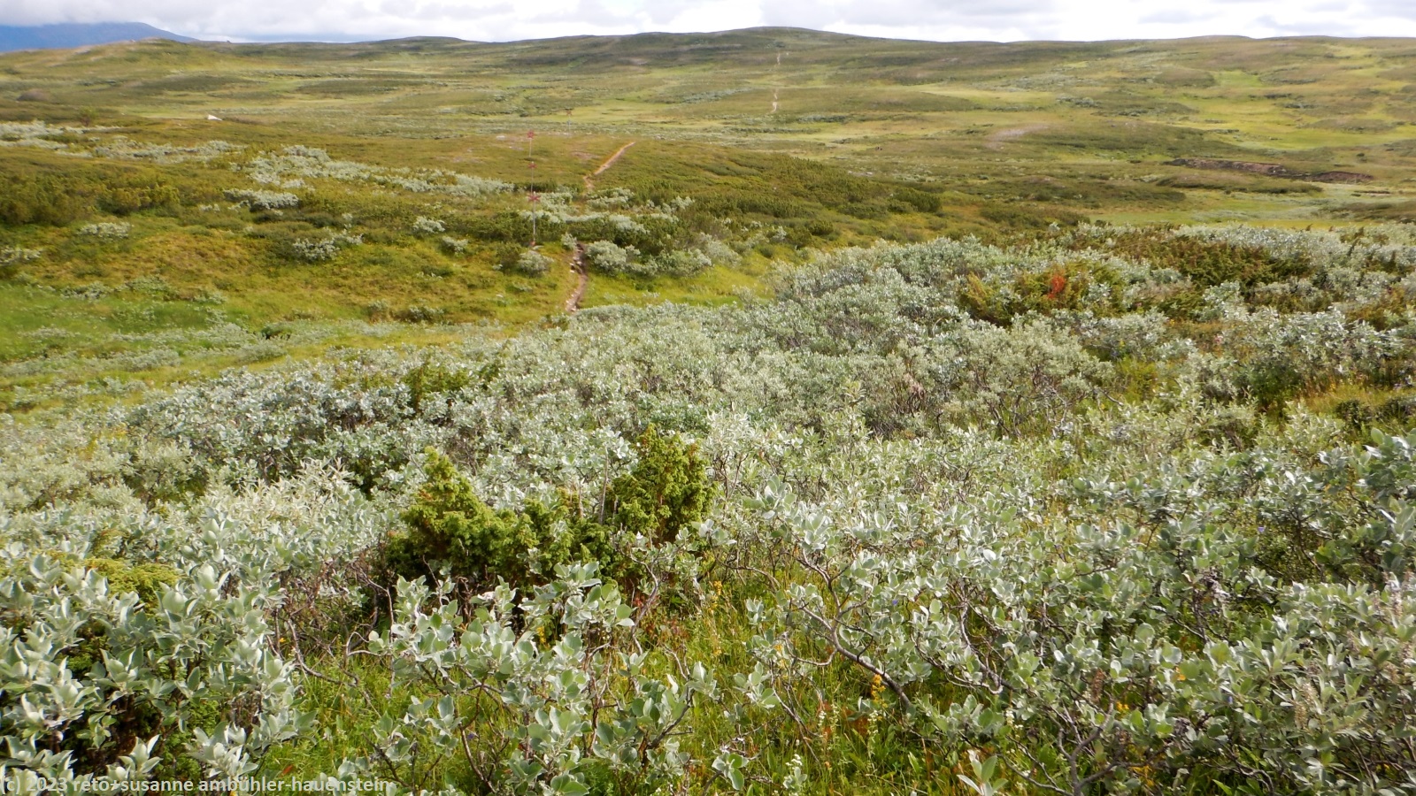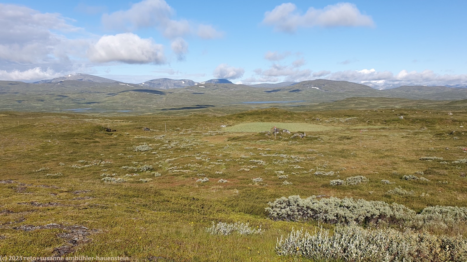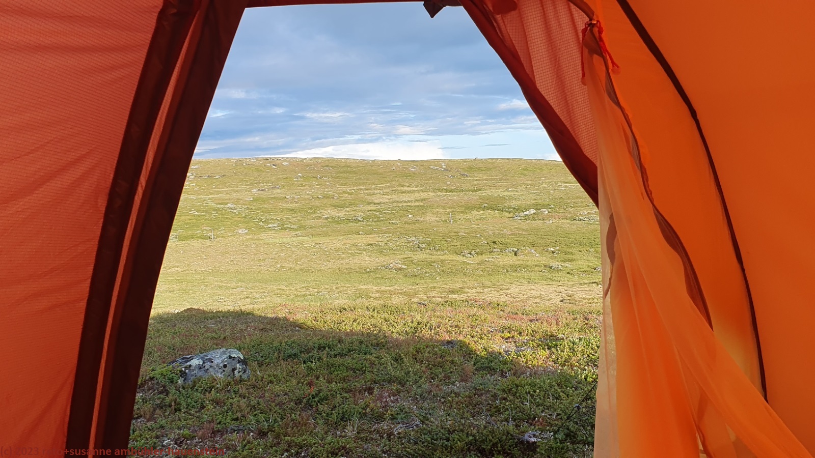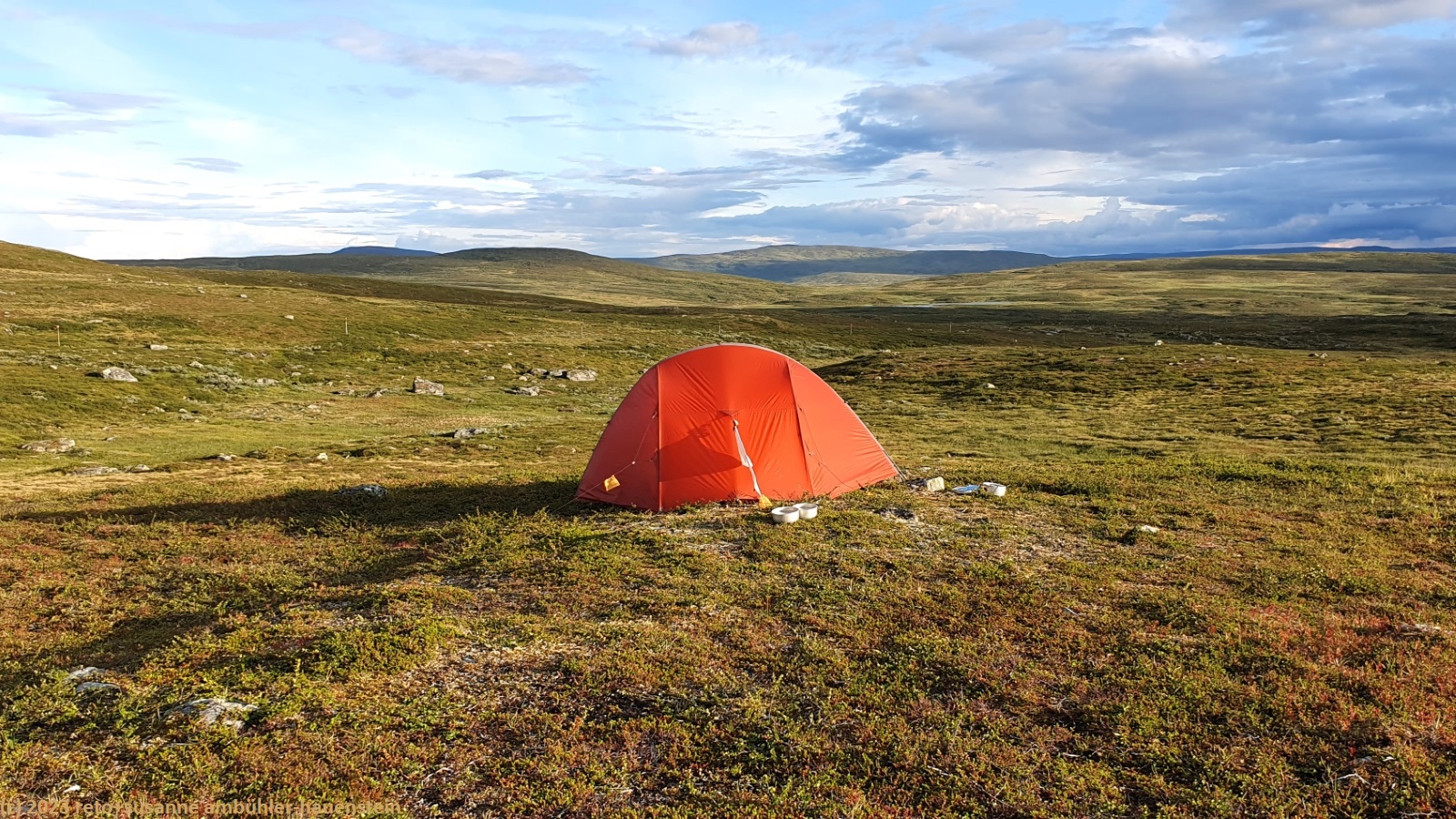 nach einer meiner meinung nach ruhigen nacht erwartet uns heute ein sonniger morgen. als wir um 8:45 uhr vor die hütte treten, ist der himmel zumindest im norden fast wolkenfrei. leider ändert sich das schon bald wieder. während wir südwärts wandern, ziehen immer dunklere wolken auf. wir durchqueren zwei läufe des mittån und erreichen kurz nach 11 uhr die schutzhütte svaaletjahke. gerade rechtzeitig, um schutz vor dem aufziehenden regen zu finden. nach 45 minuten lässt der regen nach und wir setzen unsere wanderung fort. nochmals gilt es flussläufe zu durchwaten, dann führt der pfad hinunter zum ljusnan bei klinken. bei einem windschutz essen wir bei äusserst wechselhaftem wetter zu mittag und trocknen unsere sachen so gut es geht in der feuerstelle. gegen 16:30 uhr überqueren wir den fluss und nehmen den aufstieg richtung klasberget in angriff. nahe des höchsten punktes finden wir in dem überraschend sumpfigen gelände eine trockene stelle für unser zelt. nach einem weiteren regenschauer zeigt sich noch einmal die sonne.