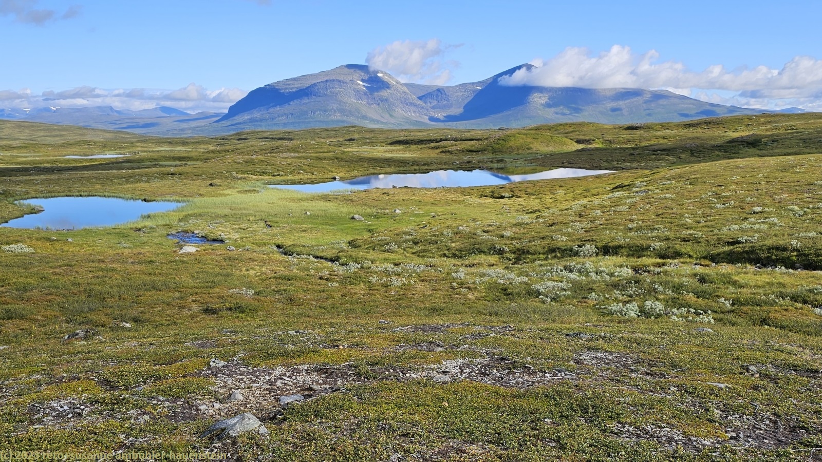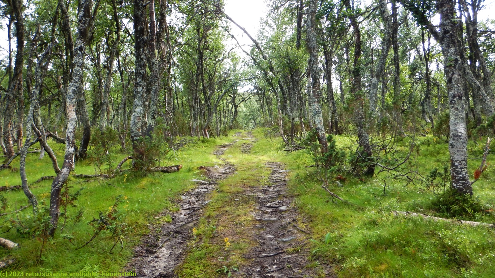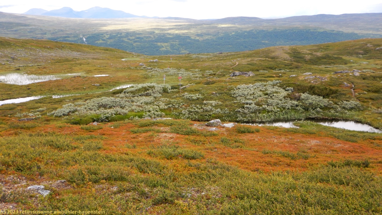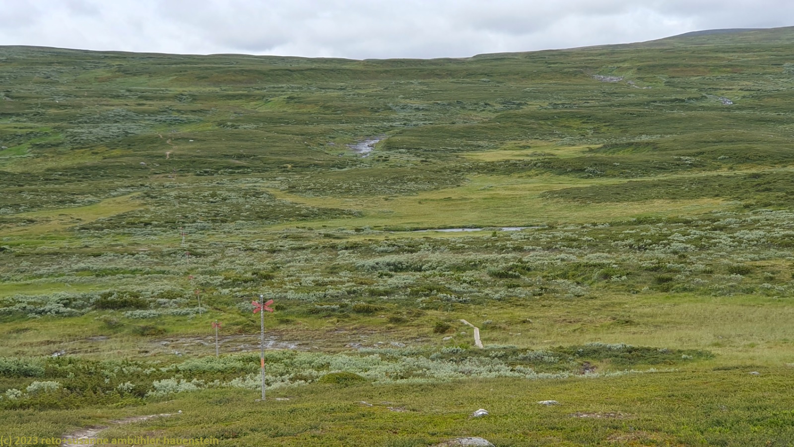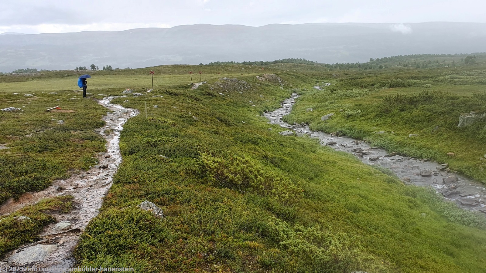 während wir unser mittagessen kochen und verzehren, regnet es immer mal wieder. ursprünglich hatten wir geplant, hier im zelt zu übernachten, aber dann müssten wir morgen fast 20 km bewältigen. zudem hat es hier im wald mehr mücken als oben auf dem fjäll. ausserdem folgt jetzt ein steiler aufstieg und da wir erst 14 km gewandert sind, haben wir noch genug energie dafür. so brechen wir gegen 16:30 uhr wieder auf und überqueren den fluss mittels brücke. dann geht es steil bergauf. wir wandern auf dem ersten kilometern wiederum durch einen sehr schönen wald, dann kommen wir bereits über die baumgrenze. der weg ist sehr nass, oft fliesst wasser wie in einem bach talwärts. das wetter bleibt trüb aber trocken. als wir den höchsten punkt erreicht haben, halten wir ausschau nach einem platz für unser zelt. beim kleinen see am fuss des klasberget führt der weg links am see vorbei, wir versuchen unser glück auf der rechten seite des gewässers. zu unserer überraschung ist der ganze hang sumpfgebiet. trotzdem finden wir schliesslich eine trockene und ebene stelle für die kommende nacht.