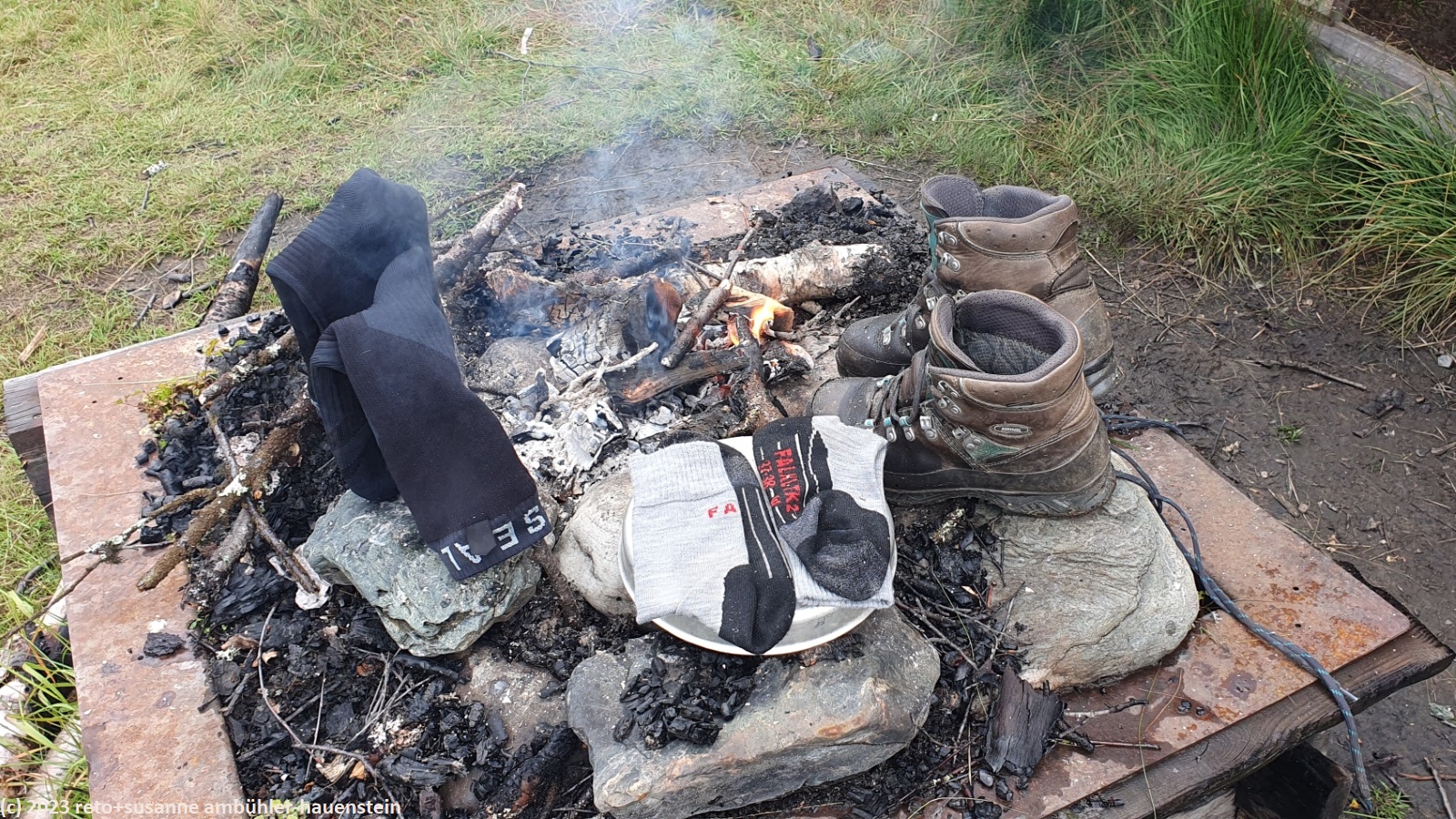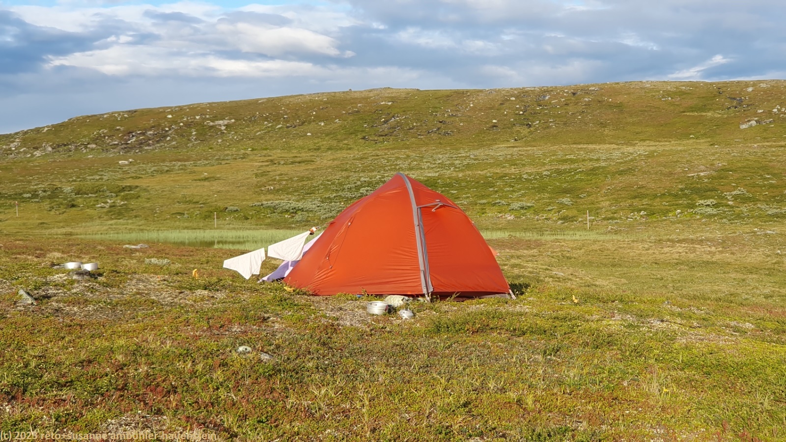 es gelingt uns gerade noch, das zelt aufzubauen, dann folgt der nächste regenguss. als dieser vorüber ist, richten wir uns ein. danach gehen wir zum see hinunter und waschen uns. auch dieser see hat eine erfrischende wassertemperatur. zurück beim zelt geniessen wir das abendessen. eher überraschend zeigt sich noch einmal die sonne, so dass wir unsere sachen wenigsten ein bisschen trocknen können. zudem geniessen wir die tolle aussicht, die wir von unserem platz aus haben.