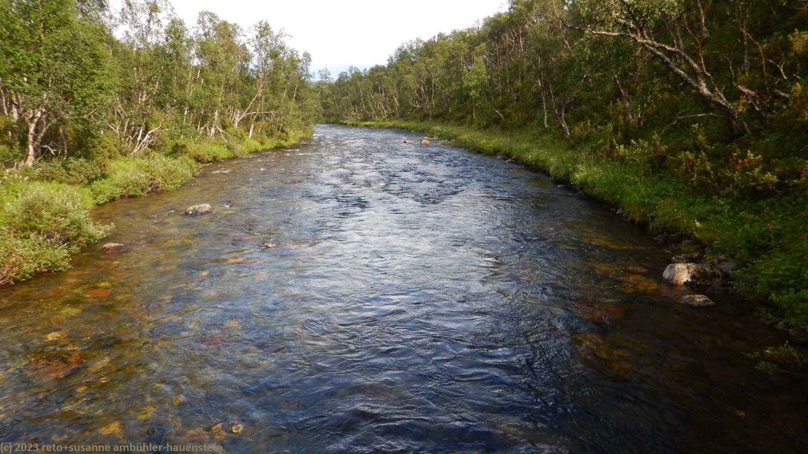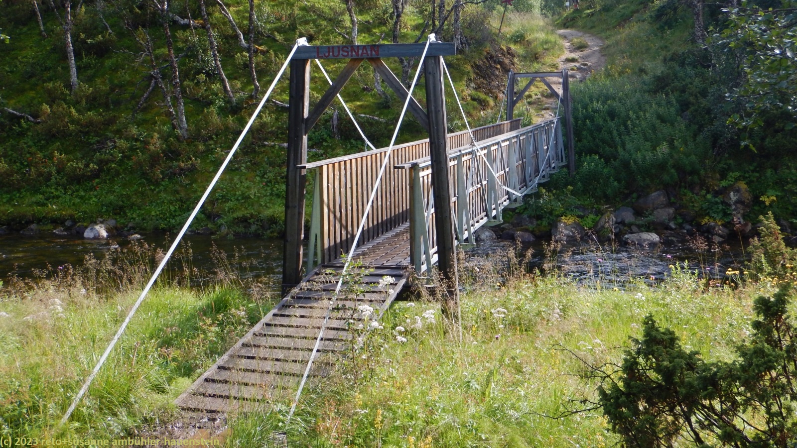 wir warten, bis der regen nachlässt, dann brechen wir wieder auf. etwa zwei kilometer später treffen wir auf einen weiteren fluss ohne brücke. wir schaffen die durchquerung ohne die schuhe ausziehen zu müssen. wenig später gilt es einen zweiten fluss zu durchqueren. diesmal wagen wir es nicht mit den wanderschuhen. susanne zieht ihre wandersandalen an, ich meine wasserdichten socken. so klappt auch diese flussdurchquerung ohne zwischenfall. nun geht es durch einen schönen wald zum ljusnan hinunter. wir erreichen den windschutz gegen 14 uhr. unglücklicherweise ist der unterstand gerade von einer gruppe reiter in beschlag genommen. diese ziehen aber bald weiter und so können wir uns hinsetzen. vor dem unterstand brennt ein feuer, das hilft die mücken zu vertreiben und wir können unsere sachen etwas trocknen.