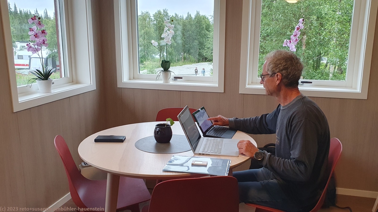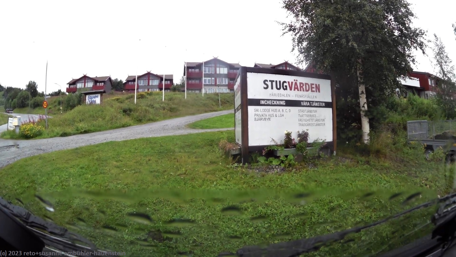 als wir heute morgen erwachen, müssen wir feststellen, dass sich im heck unseres wagens eine kleine wasserlache gebildet hat und unsere matratze nass geworden ist. während wir im jogi frühstücken, legen wir die nassen sachen zum trocknen in den aufenthaltsraum. anschliessend fahren wir in den ort, tanken unseren wagen auf und bringen die schmutzige wäsche zum waschen zu stugvärden. zurück auf dem campingplatz richten wir uns mit unseren computern im aufenthaltsraum ein und erledigen diversen bürokram. nach dem mittagessen fahren wir zum skarvruets högfjällshotell bei tänndalen, finden aber die zufahrt erst im zweiten anlauf. das restaurant ist heute eigentlich geschlossen, wir erhalten aber trotzdem einen kaffee und plaudern angeregt mit der besitzerin. plötzlich fällt der strom aus. die dame vom hotel meint, die infrastruktur sei in dieser gegend etwas marode. schliesslich fahren wir zurück nach funäsdalen, aber auch dieser ort ist vom stromausfall betroffen und unsere wäsche daher noch nicht fertig. bald ist der strom wieder da und unsere wäsche abholbereit. zurück auf dem campingplatz verbringen wir den abend im aufenthaltsraum und recherchieren, wohin die reise bei der aktuellen wetterlage am besten gehen soll. wir beschliessen, morgen nach ramvik zu fahren.