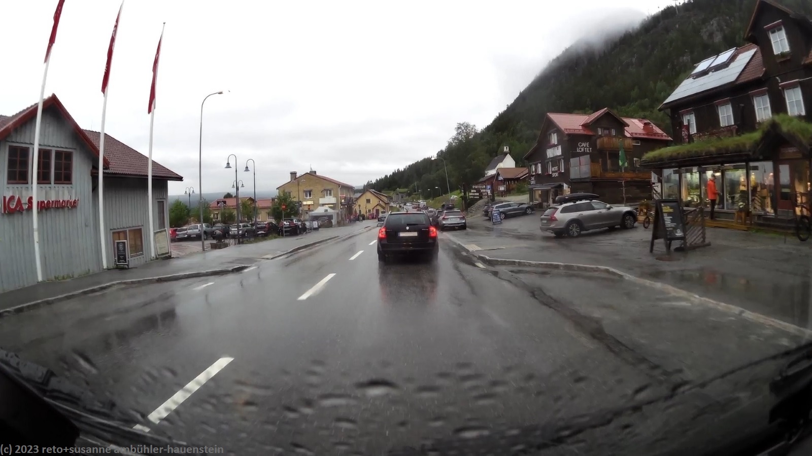 als der kräftige regen gerade kurz etwas nachlässt, machen wir uns auf den rückweg. auch in funäsdalen hat es zur zeit kein strom. wir fragen bei stugvärden nach, wie es um unsere wäsche steht. man erklärt uns, ein teil sei fertig, aber da der strom weg ist, noch nicht alles. wir warten im jogi, bis der regen etwas nachlässt und spazieren durch den ort. in den häusern sind die lampen wieder angegangen, offenbar ist der strom wieder da. während wir bis zum fjällmuseum spazieren, regnet es nur mässig. unterwegs besuchen wir ein geschäft, in welchem verschiedene handwerkskunst angeboten wird. auf dem rückweg bleibt das wetter unverändert. beim ICA möchten wir etwas einkaufen, aber wegen dem stromausfall haben sich an den beiden kassen lange schlangen gebildet, so lassen wir es bleiben. zurück bei stugvärden sind unsere kleider nun abholbereit.