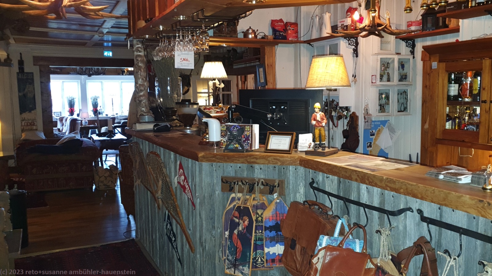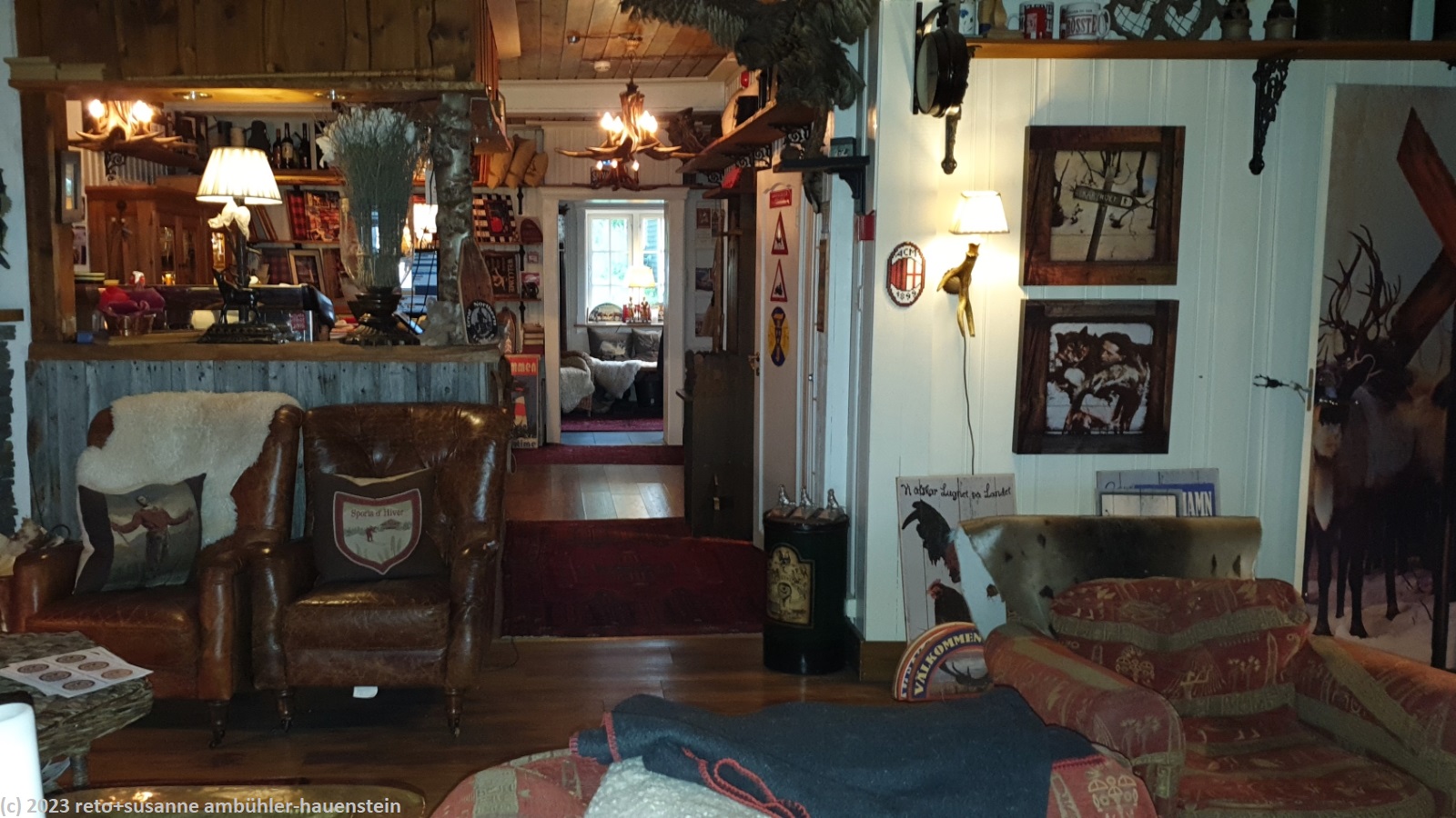 da im laufe des vormittages der regen nachgelassen hat, haben wir das hochdach wieder geöffnet. gegen 13 uhr nimmt der regen plötzlich wieder stark zu. bis ich das dach schliesse, tropft es schon wieder an verschiedenen stellen. wir essen im aufenthaltsraum zu mittag. danach fahren wir ins benachbarte tänndalen, wo wir im skarvruets högfjällshotell einen kaffee trinken möchten. da wir die abzweigung verpassen, wenden wir im ort, auf der rückfahrt sehen wir die abzweigung. eine schmale, steile und unbefestigte stichstrasse bringt uns zum hotel. wir treten in einen reich dekorierten raum, das haus scheint aber völlig verlassen. im ebenso üppig ausgestatteten aufenthaltsbereich sitzt eine dame, die uns vorerst völlig ignoriert. erst als susanne sie fragt, ob sie hier der host sei, spricht sie mit uns. sie meint, am montag sei hier ruhetag, aber als wir wieder gehen wollen, sagt sie, einen kaffee könnten wir schon bekommen. mit zwei tassen frischem kaffee setzt sie sich zu uns und beginnt mit uns zu plaudern. sie erzählt, dass sie eigentlich künstlerin sei und weil alle gäste wegen dem schlechten wetter abgereist seien, würde sie sich nun ihrer kunst widmen. während wir uns unterhalten, fällt plötzlich der strom aus. die dame meint, die infrastruktur sei hier in einem ziemlich schlechten zustand. wir diskutieren auch ein wenig über die unterschiedliche mentalität der norweger, schweden und finnen. auch sie meint, dass die norweger seit etwa 30 jahren ein eher arrogantes volk geworden sind und lieber die andern - will in erster linie heissen die schweden - für sich arbeiten lassen.