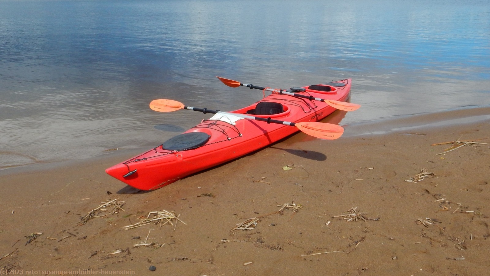 wieder hat es in der nacht mehrmals geregnet. als uns unser handy um 7:30 uhr weckt, ist das wetter eher unfreundlich, der himmel ist stark bewölkt. die wolken haben alle farben von fast weiss bis dunkelgrau. dazwischen gibt es winzig kleine löcher, durch die man etwas blauen himmel sehen kann. der wind fühlt sich zwar nicht kalt an, aber es ist auch nicht wirklich warm. kurz nach 9 uhr erhalte ich eine SMS mit der fachnummer und dem code für das schloss des kayakomat. nach dem frühstück machen wir uns auf den weg zum nordhafen. als wir um 9:50 uhr versuchen, das schloss am kayakomat zu öffnen, klappt das nicht. offenbar hat das schloss eine uhr und "weiss", dass es noch zu früh ist, um das kajak freizugeben. wir ziehen uns deshalb erst um und versuchen dann kurz nach 10 uhr nochmals, das zahlenschloss zu öffen. nun funktioniert es. das doppelkajak macht einen ordentlichen eindruck, die ausrüstung ist vollständig. im boot hat es zwei paddel, zwei schwimmwesten und zwei spritzdecken. den vorhandenen drybag brauchen wir nicht, wir haben unsere eigenen.