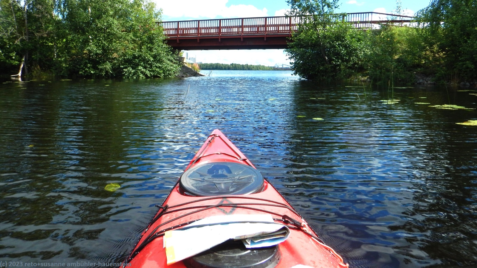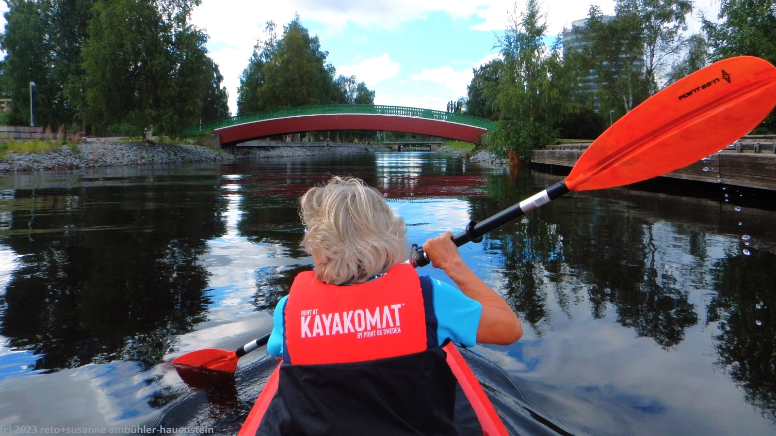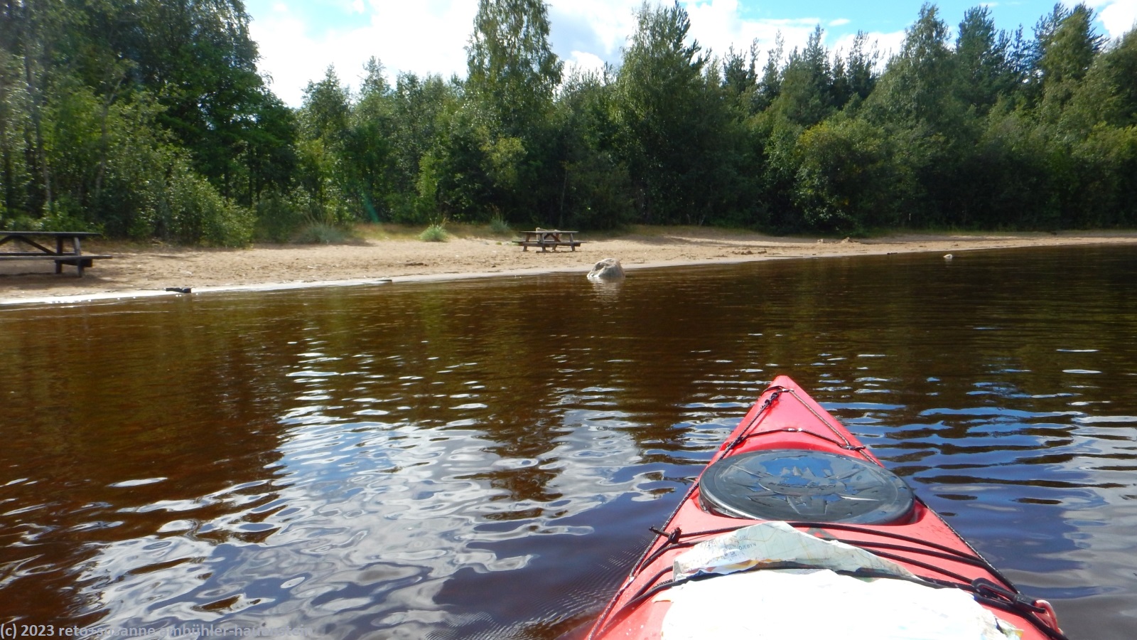 wir bringen das boot bei der nahen rampe ins wasser und paddeln durch den kanal quer durch die stadt richtung südhafen. nun ist das wasser offener und ziemlich unruhig. ein kräftige wind bläst aus süden. wir folgen dem nordufer des inrefjärden vorbei an einer papierfabrik. das wasser hat eine temperatur wie in einer badewanne. ich habe gelesen, dass die fabriken warmes abwasser in den piteälven einfliessen lassen und dadurch den fluss erwärmen. dies soll eine grosse artenvielfalt an wasservögel und fischen bewirken, aber ich bin da nicht so überzeugt. bezüglich fische kann ich die aussage natürlich nicht überprüfen, aber ich habe nicht den eindruck, dass es hier besonders viele wasservögel hat. wir unterqueren erst eine hängebrücke für fussgänger und dann die E4. unmittelbar nach der brücke führt ein tunnel in einen kleinen see und ein weiterer in den etwas grösseren bullerviken. hier gibt es blühende seerosen und sehr hübscher häuser entlang des ufers. wir paddeln bis zum ende des sees und wieder zurück. durch das tunnel geht es wieder in den kleinen see. von hier führt ein weiteres tunnel zum killingholmen. in diesem tunnel hängt ein rohr an der decke, durch dieses führt ein schmaler holzsteg. wir vermuten, dass dieser steg kleinen tieren dient, die strasse zu unterqueren. wir folgen nun dem südlichen ufer des inrefjärden bis tingsholmen. auf diesem abschnitt ist das wasser ganz ruhig, den wir befinden uns im windschatten. wir folgen dem ufer noch ein stück weiter, dann überqueren wir den hortlaxviken um dem südlichen ufer der insel fingermanholmen zu folgen. wir umrunden die südspitze und finden etwas weiter nördlich eine kleine bucht mit einem sandstrand und einem picknicktisch.