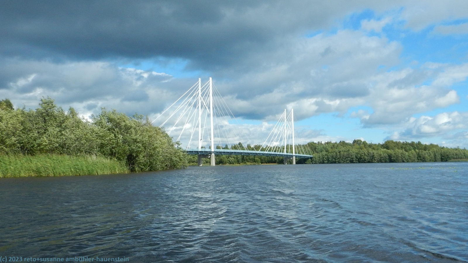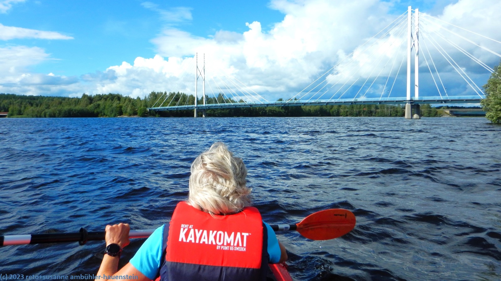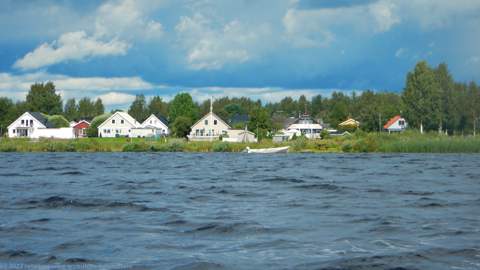 wir bringen das boot bei der nahen rampe ins wasser und paddeln durch den kanal quer durch die stadt richtung südhafen. nun ist das wasser offener und ziemlich unruhig. ein kräftige wind bläst aus süden. wir folgen dem nordufer des inrefjärden vorbei an einer papierfabrik. das wasser hat eine temperatur wie in einer badewanne. ich habe gelesen, dass die fabriken warmes abwasser in den piteälven einfliessen lassen und dadurch den fluss erwärmen. dies soll eine grosse artenvielfalt an wasservögel und fischen bewirken, aber ich bin da nicht so überzeugt. bezüglich fische kann ich die aussage natürlich nicht überprüfen, aber ich habe nicht den eindruck, dass es hier besonders viele wasservögel hat. wir unterqueren erst eine hängebrücke für fussgänger und dann die E4. unmittelbar nach der brücke führt ein tunnel in einen kleinen see und ein weiterer in den etwas grösseren bullerviken. hier gibt es blühende seerosen und sehr hübscher häuser entlang des ufers. wir paddeln bis zum ende des sees und wieder zurück. durch das tunnel geht es wieder in den kleinen see. von hier führt ein weiteres tunnel zum killingholmen. in diesem tunnel hängt ein rohr an der decke, durch dieses führt ein schmaler holzsteg. wir vermuten, dass dieser steg kleinen tieren dient, die strasse zu unterqueren. wir folgen nun dem südlichen ufer des inrefjärden bis tingsholmen. auf diesem abschnitt ist das wasser ganz ruhig, den wir befinden uns im windschatten. wir folgen dem ufer noch ein stück weiter, dann überqueren wir den hortlaxviken um dem südlichen ufer der insel fingermanholmen zu folgen. wir umrunden die südspitze und finden etwas weiter nördlich eine kleine bucht mit einem sandstrand und einem picknicktisch.