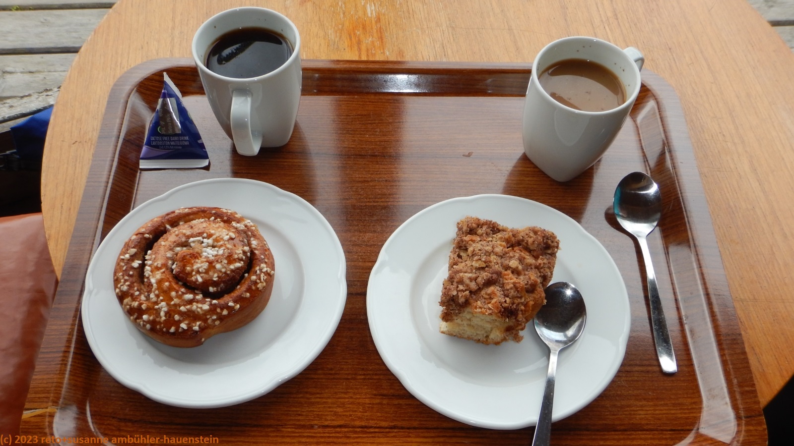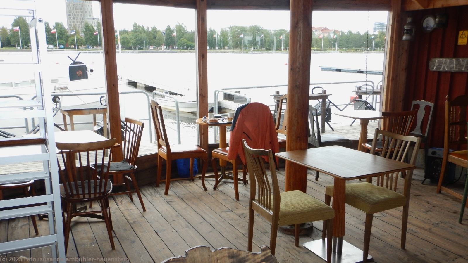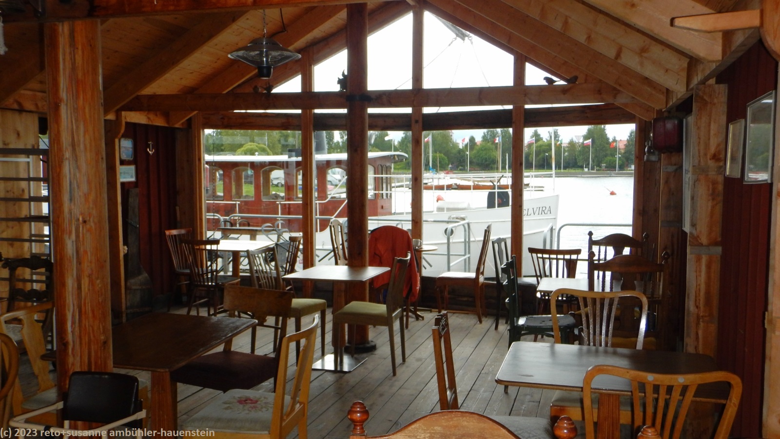 das wetter hat sich in der letzten stunde gebessert, immer wieder scheint die sonne. das gilt auch noch, als wir beim picknicktisch unsere brote auspacken. dann aber tauchen plötzlich dunkle wolken auf und noch ehe wir fertig sind mit essen beginnt es zu regnen. nicht besonders heftig, aber doch eher unangenehm. zum glück hat susanne die regenjacken eingepackt, so bleiben wir ziemlich trocken. als der regenguss vorbei ist, setzen wir unsere tour fort. wir paddeln zum gegenüberliegenden ufer und folgen diesem nordwärts bis zum kleinboothafen von klubbgärdet. ich dachte, ich hätte hier auf dem GPS ein restaurant gesehen, muss nun aber feststellen, dass dieses beim südlicher gelegenen hafen gewesen wäre. da wieder sehr dunkle wolken aufziehen, wollen wir nicht nochmals südwärts paddeln, sondern weiter nordwärts. beim südhafen von piteå hat es gemäss karte ebenfalls ein cafe. an einer weiteren fabrik vorbei paddeln wir zum gästhamn, wo es tatsächlich ein sehr hübsches cafe hat. wir sind keine minute zu früh, denn während wir im skeppscafe kaffee und etwas süsses geniessen, giesst es draussen wieder einmal wie aus kübeln.