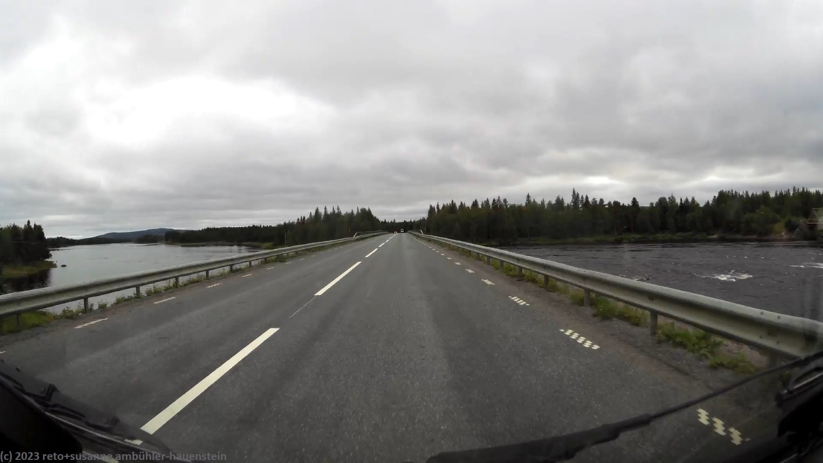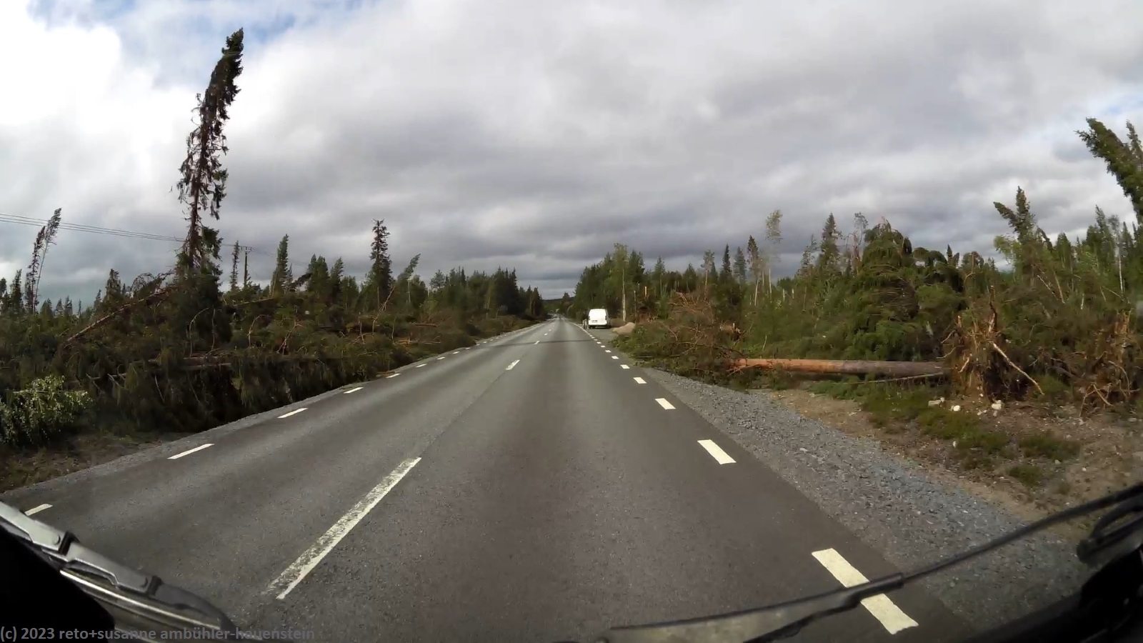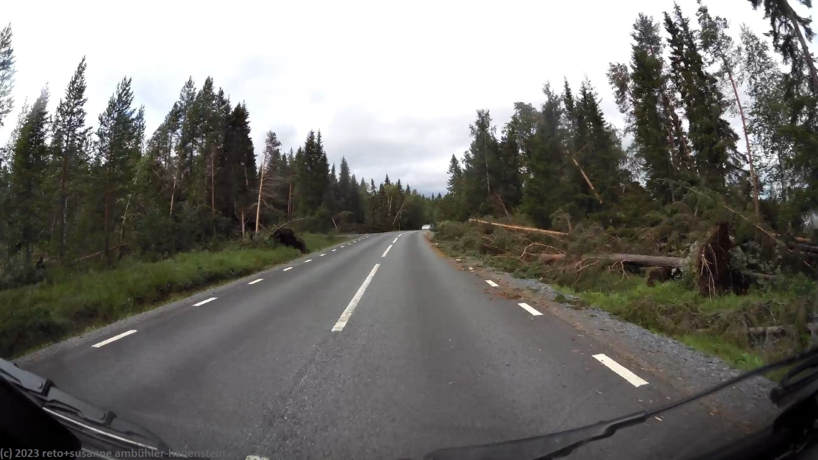 für einmal ist es meine frau, die am morgen etwas länger schläft und so ist es schon fast 9 uhr, als wir aufstehen. der himmel ist auch heute grau, aber der wind hat deutlich nachgelassen, so dass wir im freien frühstücken können. anschliessend packen wir zusammen und machen uns auf dem weg. bei der tankstelle am eingang des campingplatzes tanken wir noch unseren wagen auf, dann geht es los. wir folgen der E4 bis zum südlichen stadtrand von piteå, dann wechseln wir auf die strasse 373. wir fahren über die beiden tunnel, durch die wir gestern gepaddelt sind. die fahrt verläuft superangenehm, wir haben die strasse weitgehend für uns alleine. zwei oder drei mal müssen wir sie mit einigen rentieren teilen, ansonsten geht es ungehindert vorwärts. im weiteren verlauf fahren wir durch einen wald, in welchem hunderte von bäumen vom sturm von letzter woche umgeworfen wurden. es sieht fürchterlich aus. die aufräumarbeiten sind so weit fortgeschritten, dass die strasse wieder frei ist, aber neben der strasse liegen die bäume kreuz und quer. kurz nach 14 uhr erreichen wir storuman.