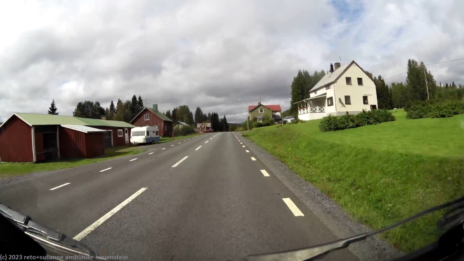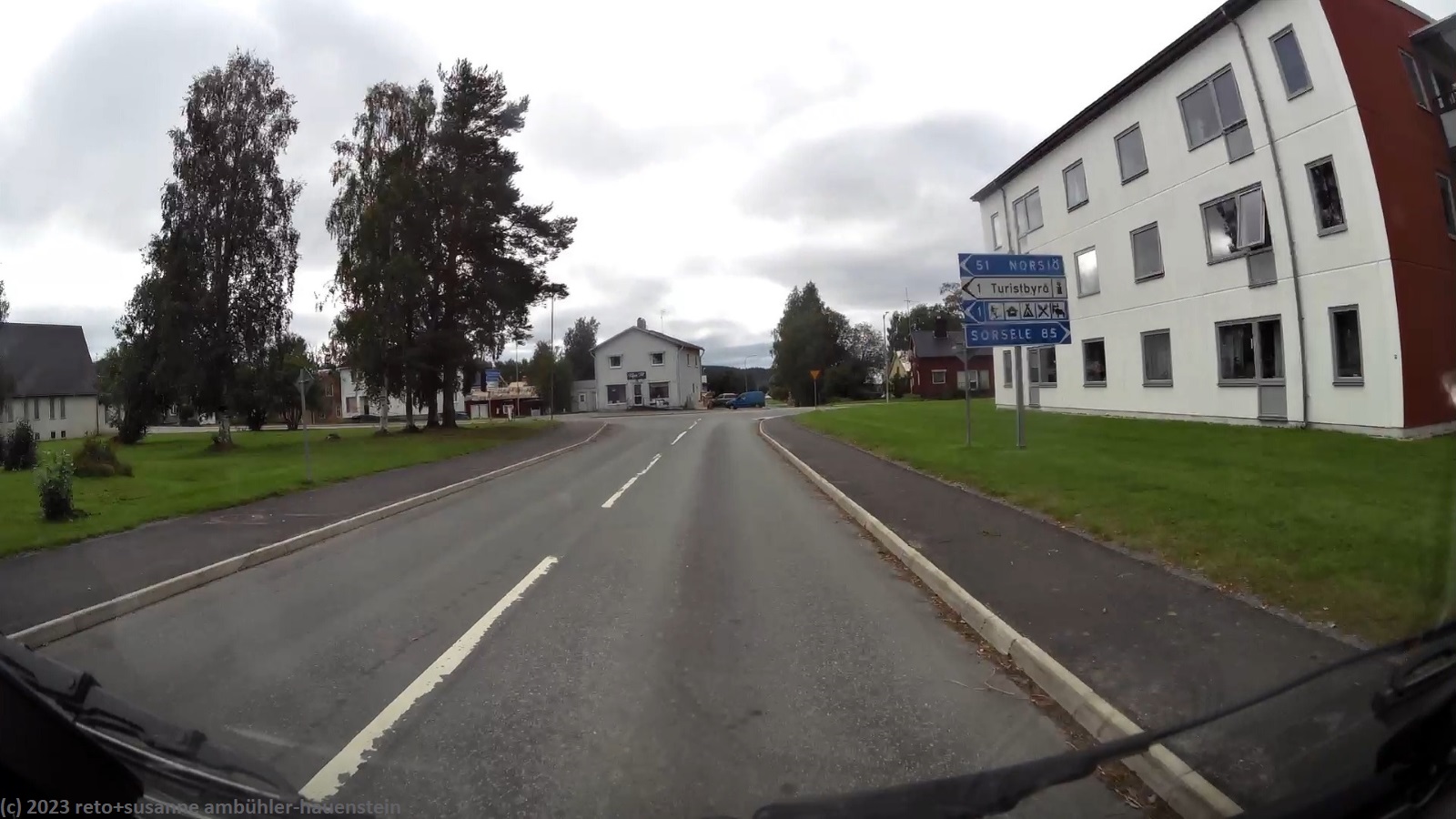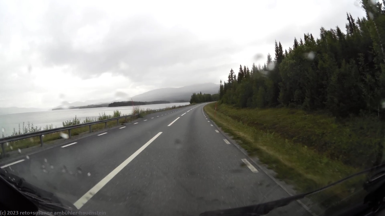 im äusserst hübschen lappland deli essen wir zu mittag. die dame hinter der theke ist schweizerin. wir bestellen zwei lunchpakete. diese bestehen aus einem sandwich, bzw. einem stück wähe, dazu dürfen wir uns am salatbuffet bedienen. auch der kaffee ist im preis eingeschlossen. das essen schmeckt hervorragend - dieses lokal ist ein echter glücksfall. wir verabschieden uns von der freundlichen landsfrau und kaufen im nahen ICA für die nächsten tage lebensmittel ein. um 15:45 uhr brechen wir wieder auf. ausgangs storuman tanken wir nochmals unseren wagen auf, dann geht es weiter westwärts. die fahrt über die E12 verläuft genau so entspannt wie die reise bisher. das wetter wird etwas freundlicher, die sonne zeigt sich nun öfters. aber noch bevor wir unser tagesziel erreichen, zieht die nächste regenfront auf und schon giesst es wieder.