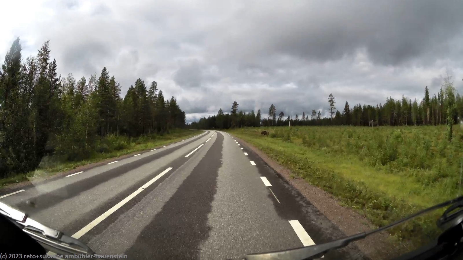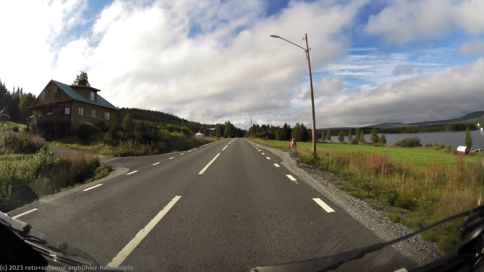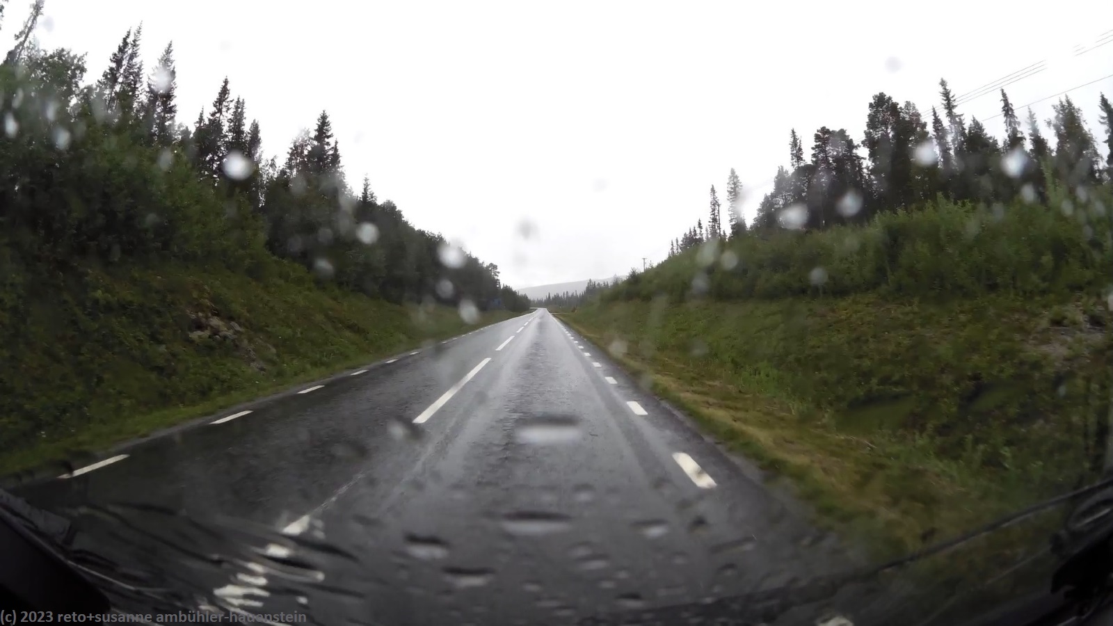 im äusserst hübschen lappland deli essen wir zu mittag. die dame hinter der theke ist schweizerin. wir bestellen zwei lunchpakete. diese bestehen aus einem sandwich, bzw. einem stück wähe, dazu dürfen wir uns am salatbuffet bedienen. auch der kaffee ist im preis eingeschlossen. das essen schmeckt hervorragend - dieses lokal ist ein echter glücksfall. wir verabschieden uns von der freundlichen landsfrau und kaufen im nahen ICA für die nächsten tage lebensmittel ein. um 15:45 uhr brechen wir wieder auf. ausgangs storuman tanken wir nochmals unseren wagen auf, dann geht es weiter westwärts. die fahrt über die E12 verläuft genau so entspannt wie die reise bisher. das wetter wird etwas freundlicher, die sonne zeigt sich nun öfters. aber noch bevor wir unser tagesziel erreichen, zieht die nächste regenfront auf und schon giesst es wieder.