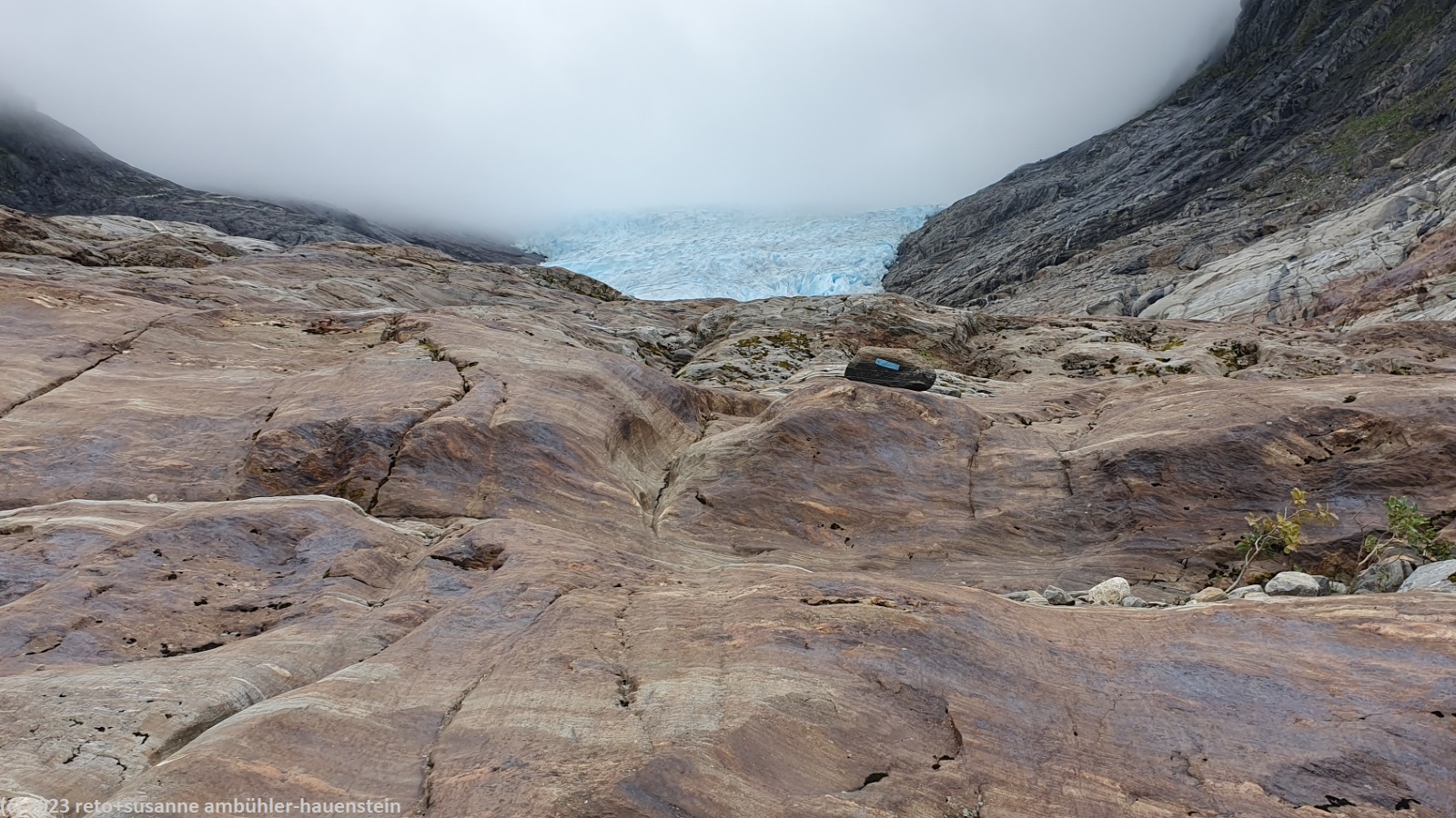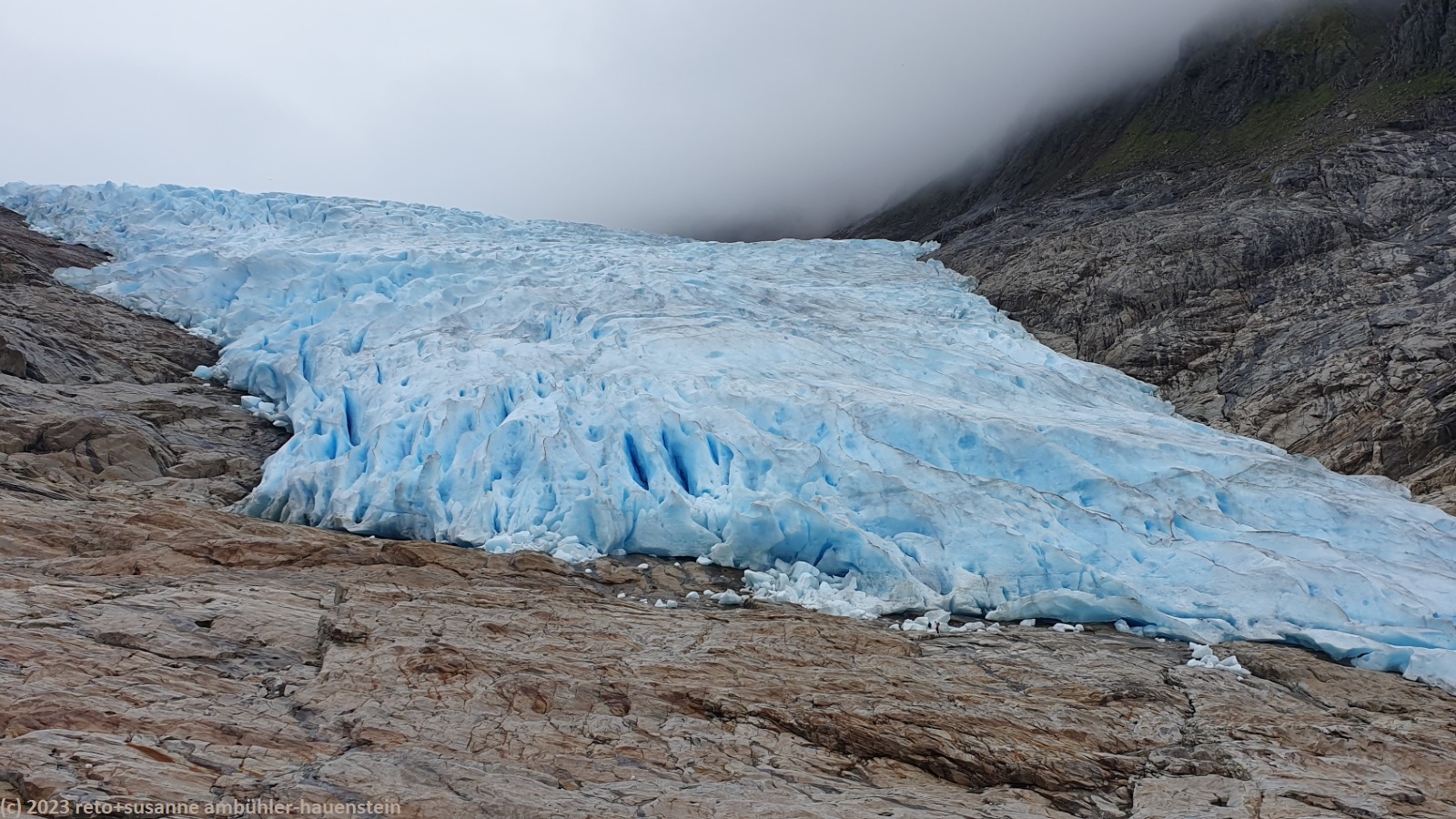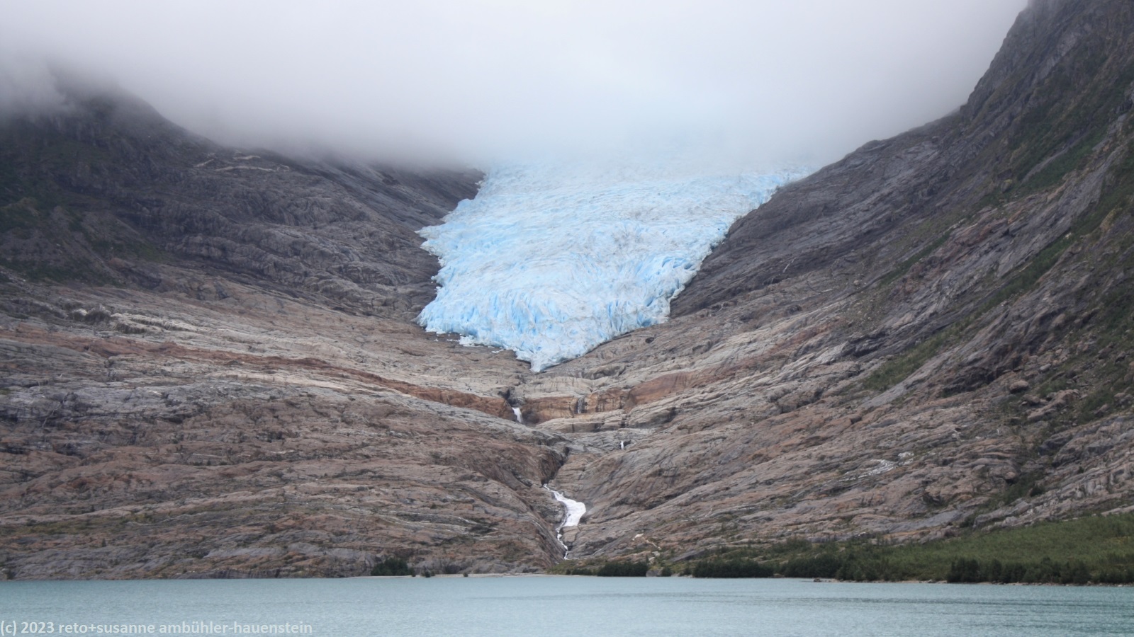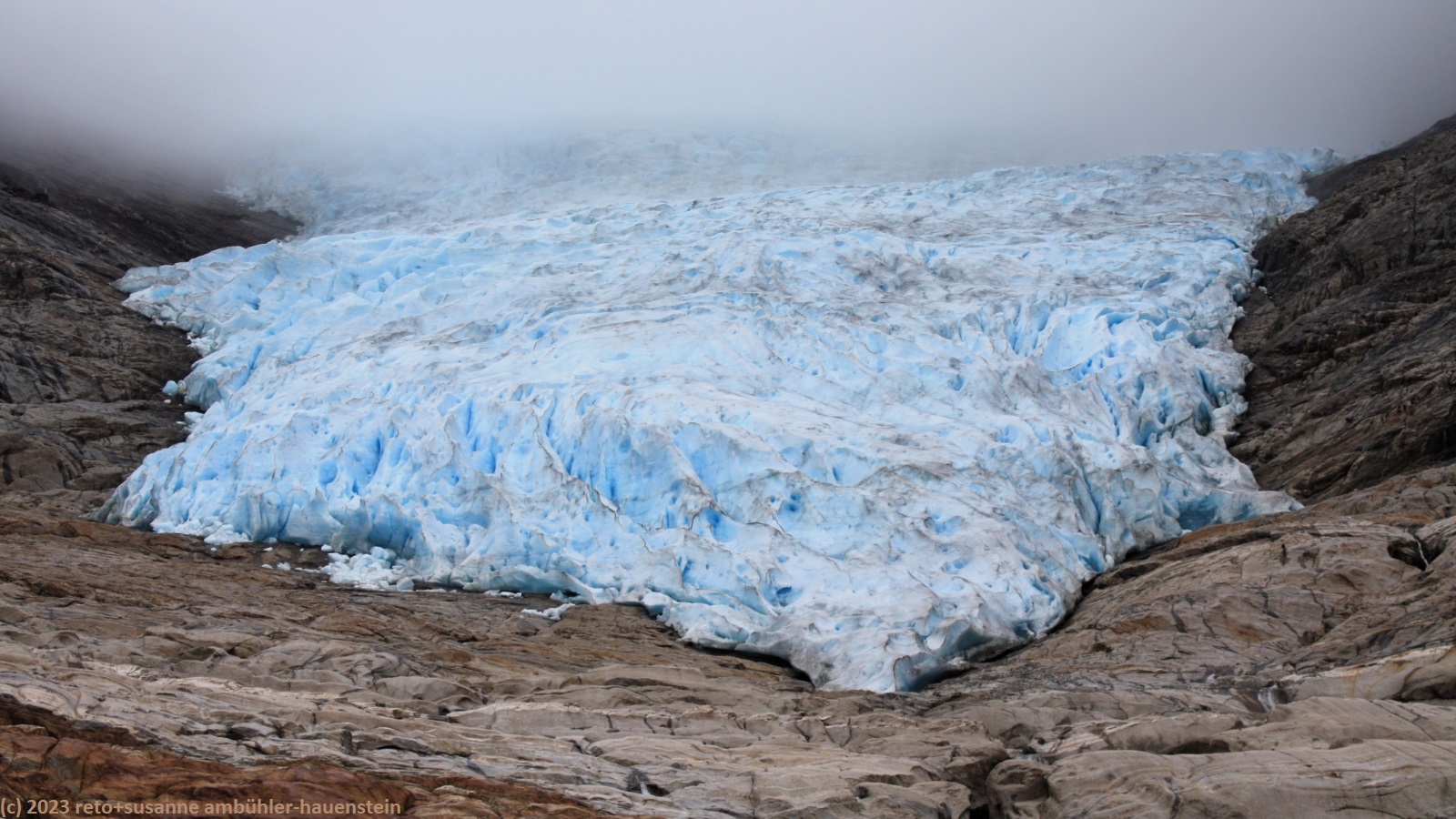 unser handy weckt uns um 8 uhr. eher enttäuschend ist der himmel grau und es fällt ein hauch von nieselregen. wir frühstücken daher im jogi. kurz vor 10 uhr machen wir uns auf den weg nach holandsvika. unterwegs wechseln sich regen und trockene phasen ab. auf dem parkplatz beim bootssteg stehen schon einige wagen. wir versichern uns, dass das boot auch wirklich um 11 uhr fährt, dann ziehen wir die wanderausrüstung an. nach kurzer wartezeit dürfen wir an bord gehen. wir wundern uns, als der bootsführer schon nach vielleicht 20 passagieren das tor schliesst, denn auf dem schiff haben 40 personen platz. das rätsel löst sich, als ein überlandbus hält und eine grössere gruppe aussteigt. diese hat offenbar eine geführte tour gebucht und wird nun ebenfalls auf unserem boot untergebracht. 10 minuten vor der geplanten abfahrt legt das boot bereits ab. die übrigen passagiere werden mit einem anderen boot transportiert. die überfahrt verläuft angenehm. die gruppe wird mit einem kleinbus zum nahen restaurant gefahren, wir bewältigen die strecke zu fuss. beim restaurant haben wir eine tolle aussicht auf den gletscher. wir folgen ein kurzes stück dem pfad am seeufer, dann geht es über einen forstweg bis zum ende des sees. hier beginnt der aufstieg zum gletscher. der weg ist gut markiert und führt über die rotbraunen felsen. trittsicherheit und gutes schuhwerk sind für diese wanderung hilfreich. trotz des eher trüben wetters sind zahlreiche menschen unterwegs. das bläuliche eis bildet einen wunderschönen kontrast zu dem rötlichen gestein. um 12:50 uhr erreichen wir das ende des markierten weges. wir sind aber immer noch etwa 250 meter vom eis entfernt. über den geschliffenen felsen steigen wir noch etwas höher, bis wir die kälte des gletschers deutlich spüren. wir machen ein paar fotos, dann steigen wir bis zum wegende hinunter, wo wir unter einem felsvorsprung picknicken.