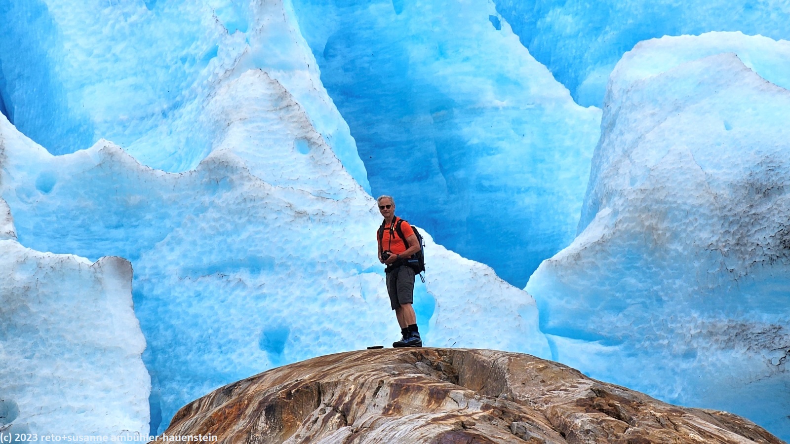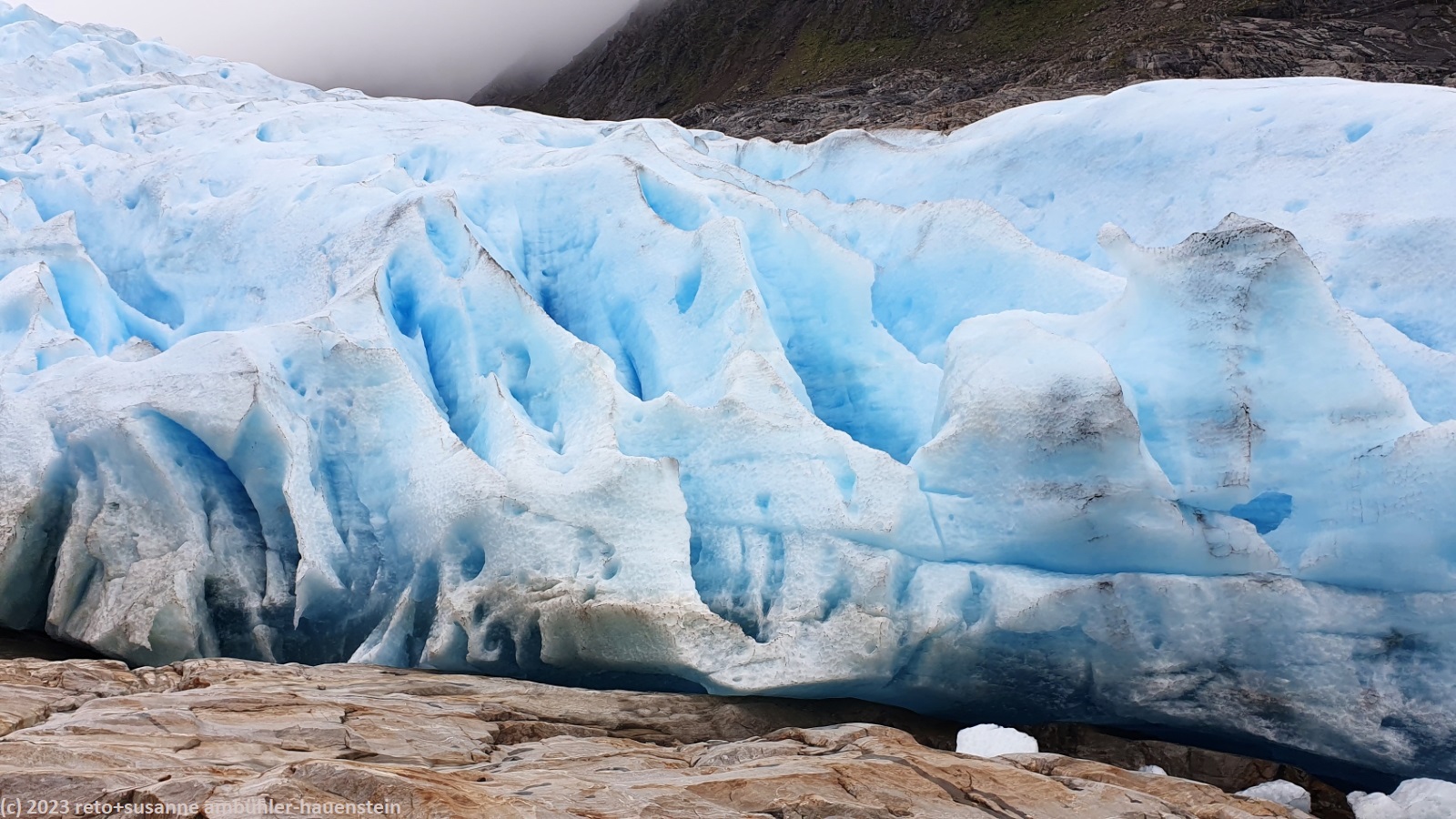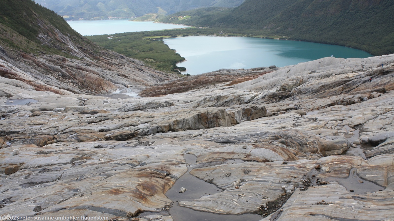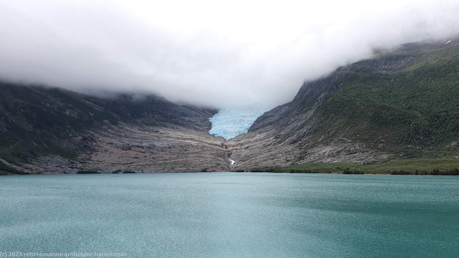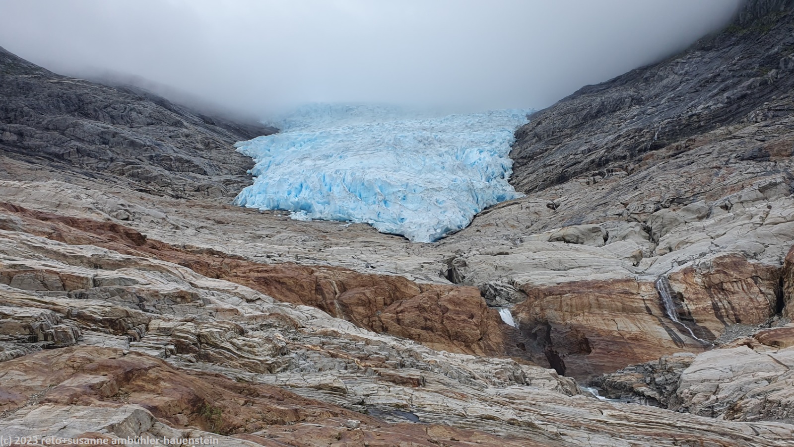 unser handy weckt uns um 8 uhr. eher enttäuschend ist der himmel grau und es fällt ein hauch von nieselregen. wir frühstücken daher im jogi. kurz vor 10 uhr machen wir uns auf den weg nach holandsvika. unterwegs wechseln sich regen und trockene phasen ab. auf dem parkplatz beim bootssteg stehen schon einige wagen. wir versichern uns, dass das boot auch wirklich um 11 uhr fährt, dann ziehen wir die wanderausrüstung an. nach kurzer wartezeit dürfen wir an bord gehen. wir wundern uns, als der bootsführer schon nach vielleicht 20 passagieren das tor schliesst, denn auf dem schiff haben 40 personen platz. das rätsel löst sich, als ein überlandbus hält und eine grössere gruppe aussteigt. diese hat offenbar eine geführte tour gebucht und wird nun ebenfalls auf unserem boot untergebracht. 10 minuten vor der geplanten abfahrt legt das boot bereits ab. die übrigen passagiere werden mit einem anderen boot transportiert. die überfahrt verläuft angenehm. die gruppe wird mit einem kleinbus zum nahen restaurant gefahren, wir bewältigen die strecke zu fuss. beim restaurant haben wir eine tolle aussicht auf den gletscher. wir folgen ein kurzes stück dem pfad am seeufer, dann geht es über einen forstweg bis zum ende des sees. hier beginnt der aufstieg zum gletscher. der weg ist gut markiert und führt über die rotbraunen felsen. trittsicherheit und gutes schuhwerk sind für diese wanderung hilfreich. trotz des eher trüben wetters sind zahlreiche menschen unterwegs. das bläuliche eis bildet einen wunderschönen kontrast zu dem rötlichen gestein. um 12:50 uhr erreichen wir das ende des markierten weges. wir sind aber immer noch etwa 250 meter vom eis entfernt. über den geschliffenen felsen steigen wir noch etwas höher, bis wir die kälte des gletschers deutlich spüren. wir machen ein paar fotos, dann steigen wir bis zum wegende hinunter, wo wir unter einem felsvorsprung picknicken.