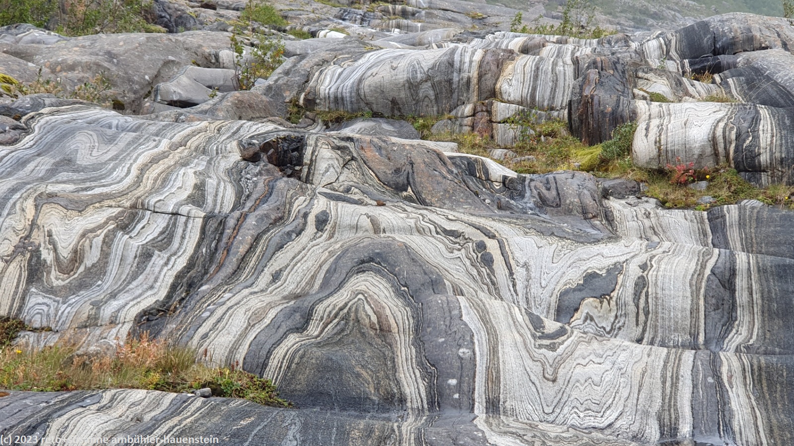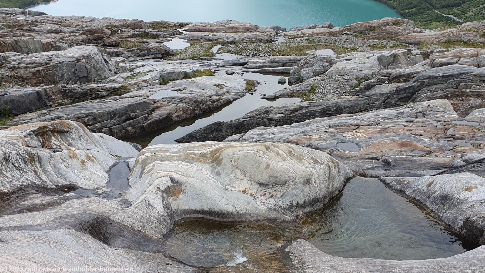 bei eher unfreundlichem wetter frühstücken wir im jogi. auf dem weg nach holandsvika wechseln sich regen und trockene phasen ab. an bord des isprins fahren wir über den holandsfjorden nach svartis. vom bootssteg wandern wir erst zum restaurant brestua am nördlichen ufer des svartisvatnet, danach folgen wir dem weg entlang des östlichen ufers. am südende des sees beginnt der aufstieg zum engabreen. der gut markierte pfad führt über meist blanken fels und endet etwa 250 meter vor dem eis. wir steigen noch etwas höher, bis wir so nah am gletscher sind, dass wir die kälte des eises spüren. beim ende des markierten wanderweges essen wir zu mittag, wobei ein leichter nieselregen fällt. unser plan, den svartisvatnet zu umrunden, scheitert am ausfluss des gletschers. der fluss ist so tief, dass wir uns nicht trauen, diesen zu durchwaten. bei sonnigem wetter hätten wir es vielleicht gewagt, aber bei dem trüben und vorallem kühlen wetter lassen wir es bleiben. so kehren wir auf dem weg zurück, den wir gekommen sind. auf der terrasse des restaurant brestua geniessen wir kaffee, kuchen und die fantastische aussicht auf den gletscher. um 16:45 uhr bringt uns das boot zurück nach holandsvika. auf dem rückweg zum campingplatz kaufen wir noch einige lebensmittel. das nachtessen geniessen wir im jogi, wo wir auch den abend verbringen.