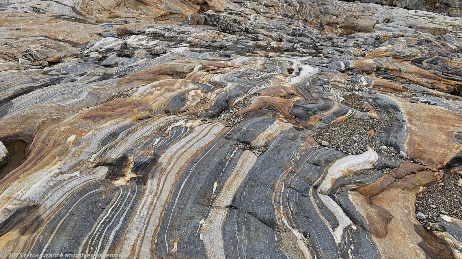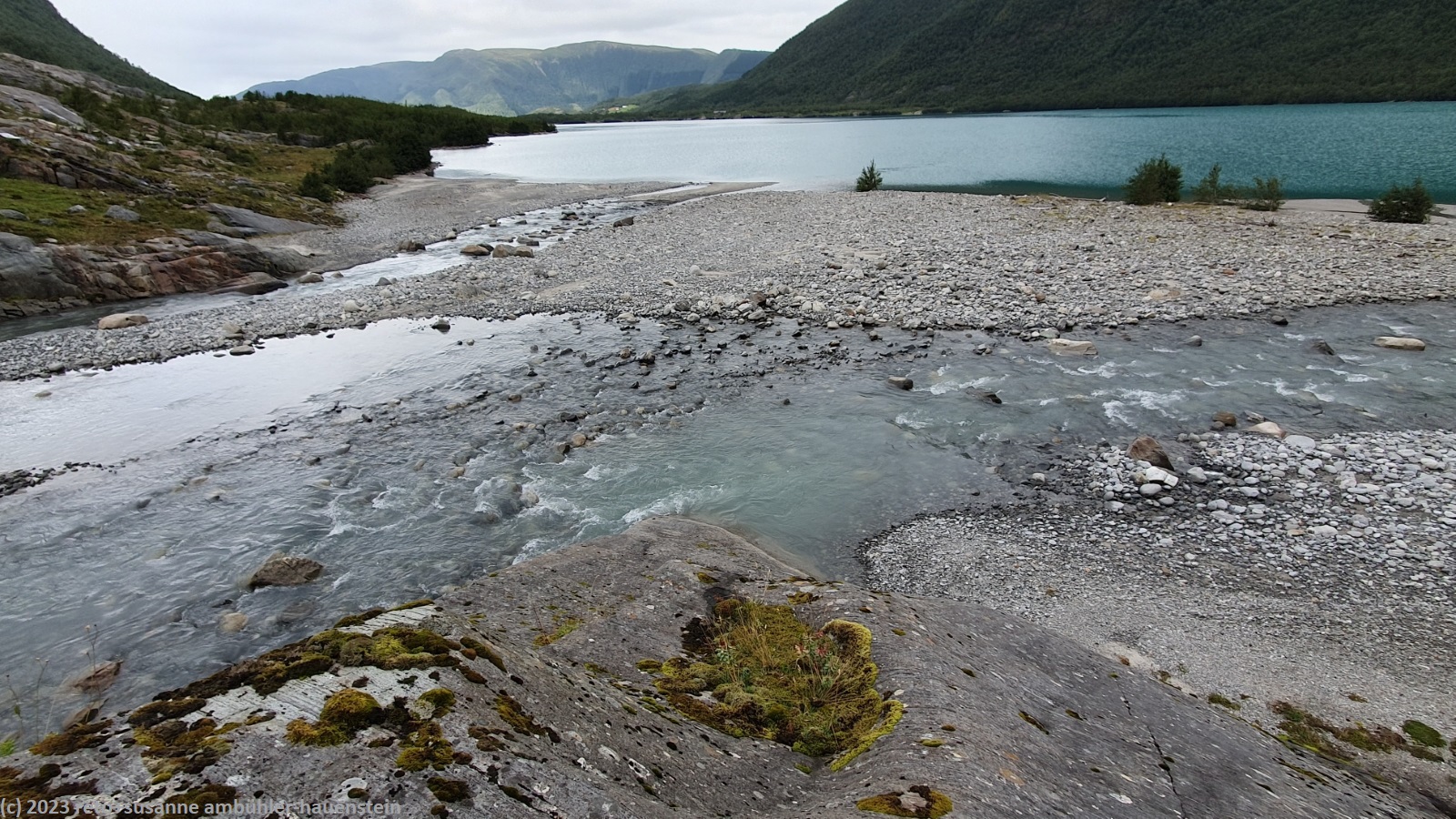 es sieht zwar anfangs so aus, als ob die sonne ein bisschen scheinen möchte, aber stattdessen beginnt es zu nieseln. wir brauchen aber den regenschutz nicht. unser ursprüngliche plan war, auf der anderen seeseite zurück zu gehen, aber der ausfluss aus dem gletscher erweist sich für uns als unüberwindlich. trocken fusses ist eine flussdurchquerung sowieso unmöglich, aber selbst mit sandalen oder trockensocken wäre es sehr schwierig. die minimale wassertiefe ist schwer abzuschätzen, wird aber vermutlich mindestens 50 cm betragen. wir beschliessen daher, den gleichen weg zurück zu gehen, den wir gekommen sind.