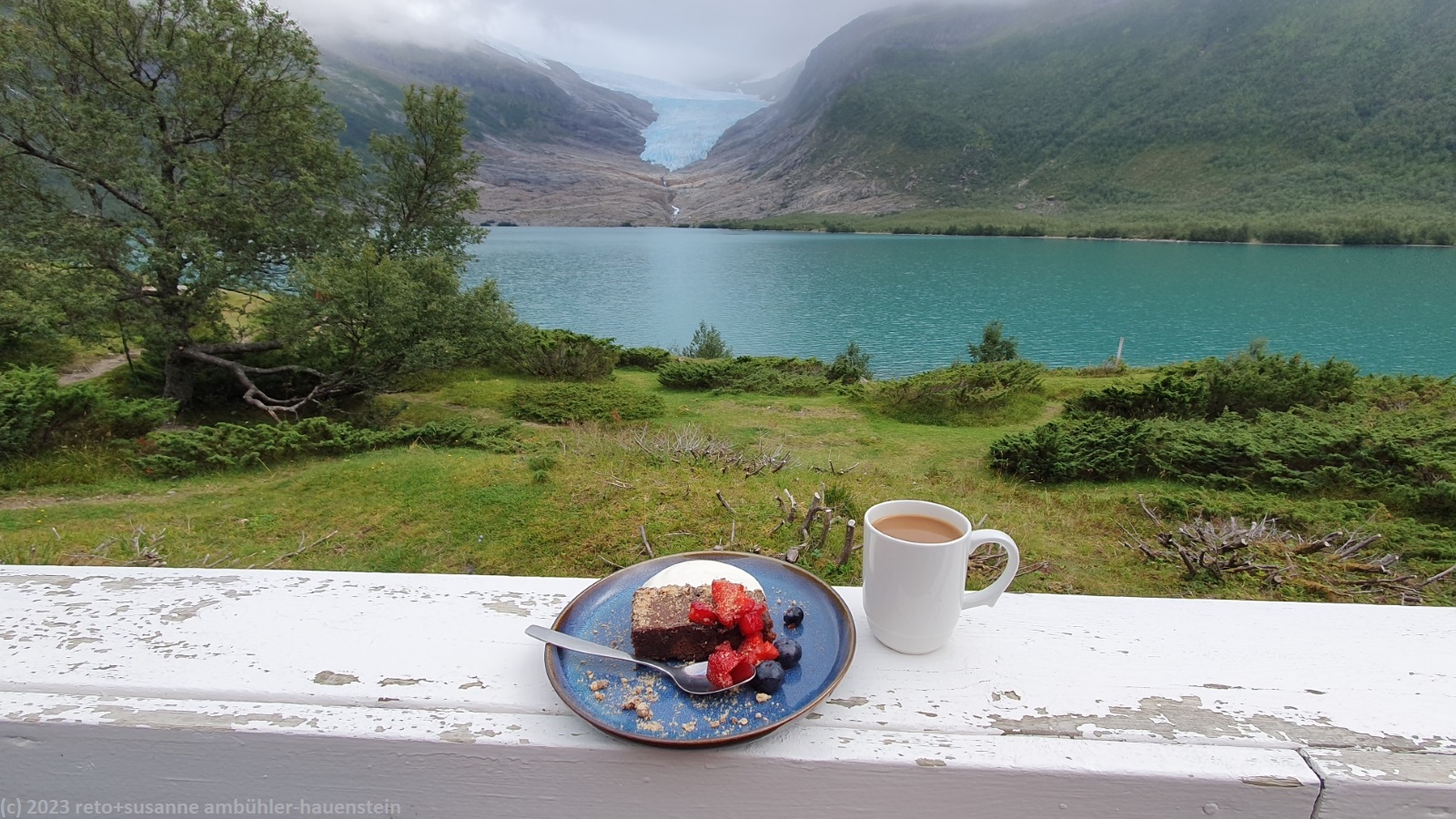 kurz nach 15:30 uhr sind wir beim restaurant brestua. auf der terrasse geniessen wir einen kaffee bzw. tee sowie ein stück köstlichen schokoladekuchen mit frischen beeren. dazu haben wir nochmals eine tolle aussicht auf den gletscher. inzwischen ist es frisch geworden, wir setzen uns daher noch eine halbe stunde ins warme restaurant, danach nehmen wir den kurzen weg zum bootssteg unter die füsse. 30 minuten später legen wir ab.
