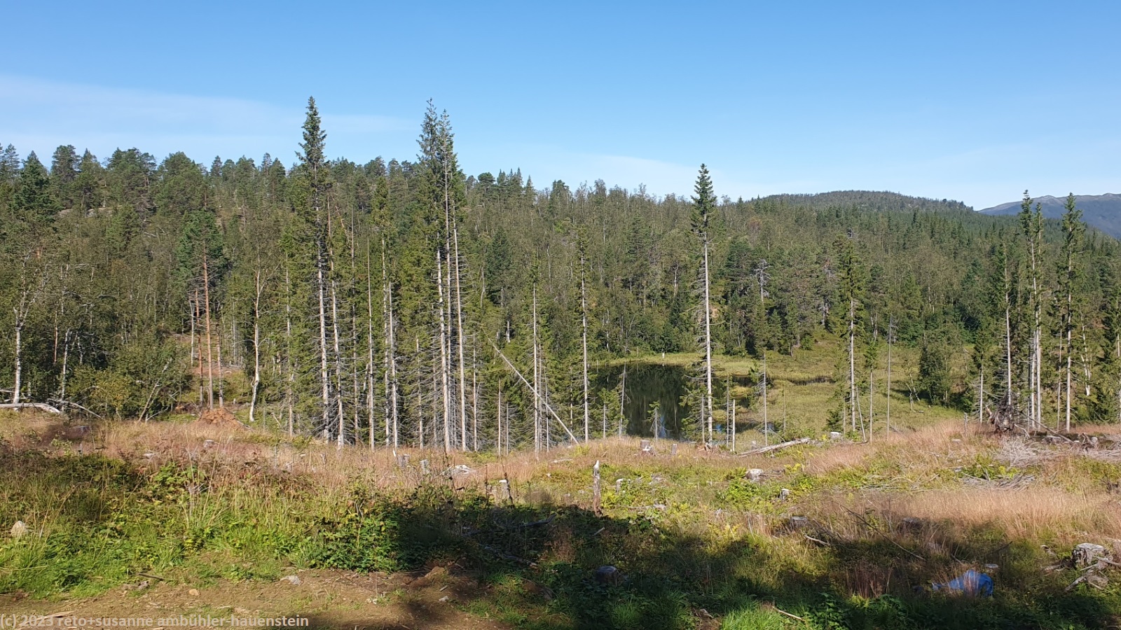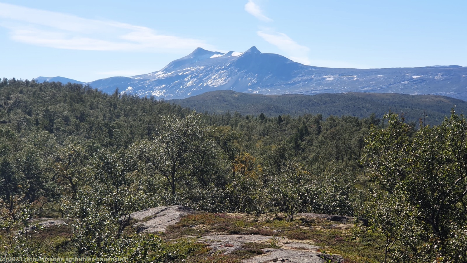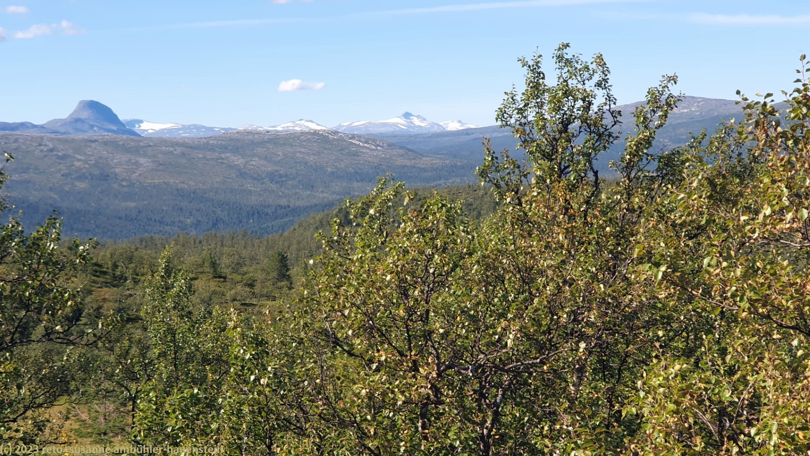 dann steigen wir noch auf den nahen hügel, von hier aus haben wir eine atemberaubende rundsicht. auf etwa 500 m.ü.m hat es immer noch einzelne kleine schneefelder. der boden wirkt aber wesentlich weniger nass als in schweden. auf dem hügel essen wir zu mittag. zum ersten mal seit sehr langer zeit, können wir das essen geniessen, ohne von einem regenguss überrascht zu werden. es ist warm und sonnig, richtig schön !