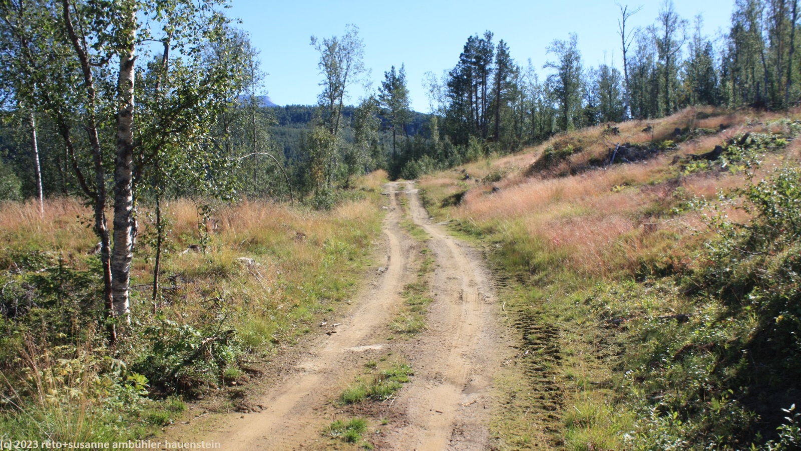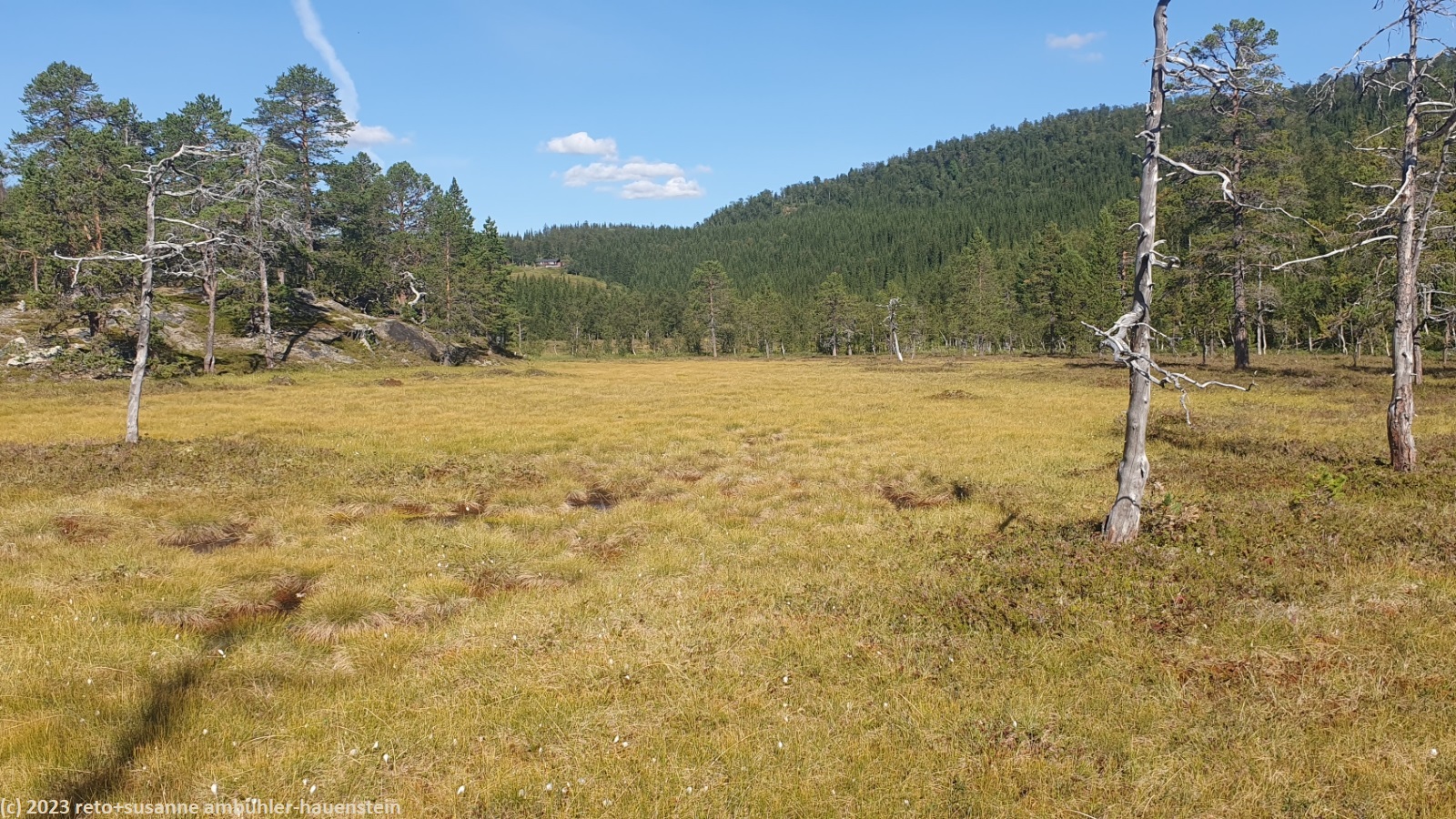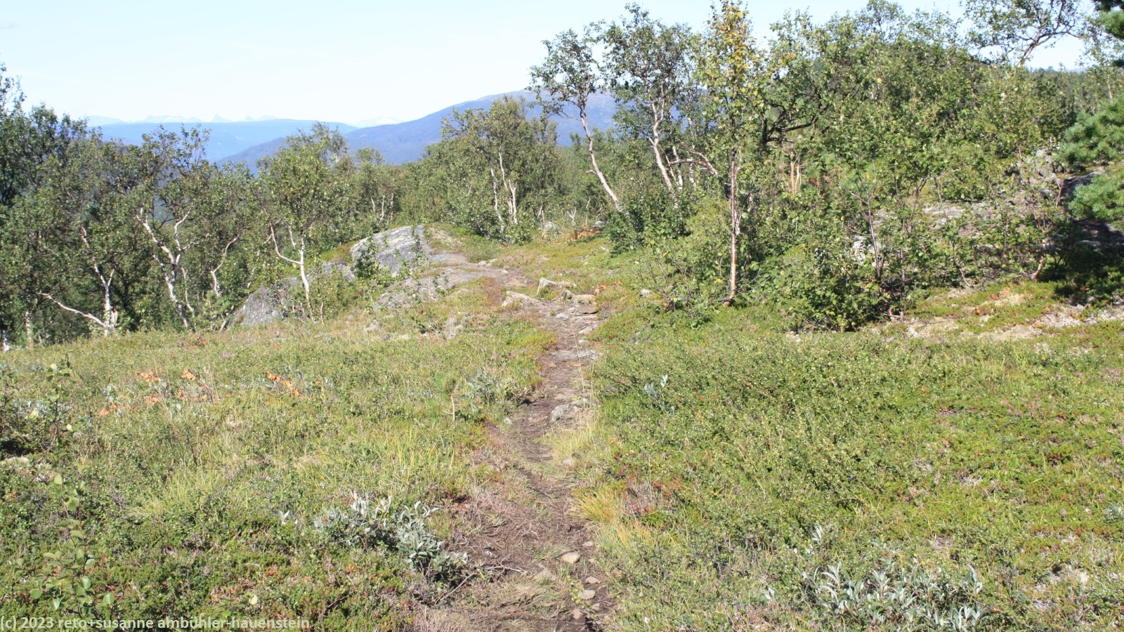 dann steigen wir noch auf den nahen hügel, von hier aus haben wir eine atemberaubende rundsicht. auf etwa 500 m.ü.m hat es immer noch einzelne kleine schneefelder. der boden wirkt aber wesentlich weniger nass als in schweden. auf dem hügel essen wir zu mittag. zum ersten mal seit sehr langer zeit, können wir das essen geniessen, ohne von einem regenguss überrascht zu werden. es ist warm und sonnig, richtig schön !