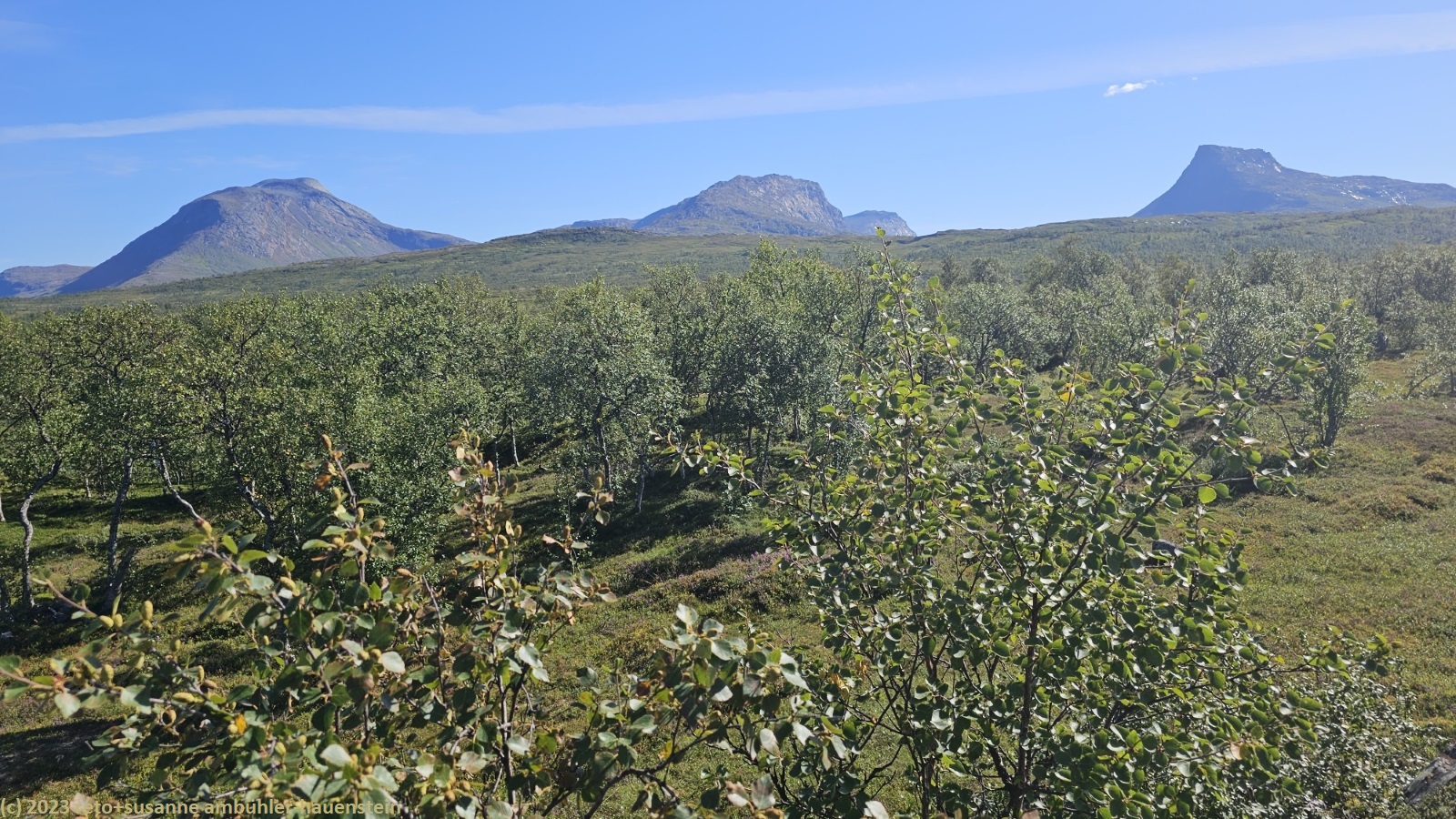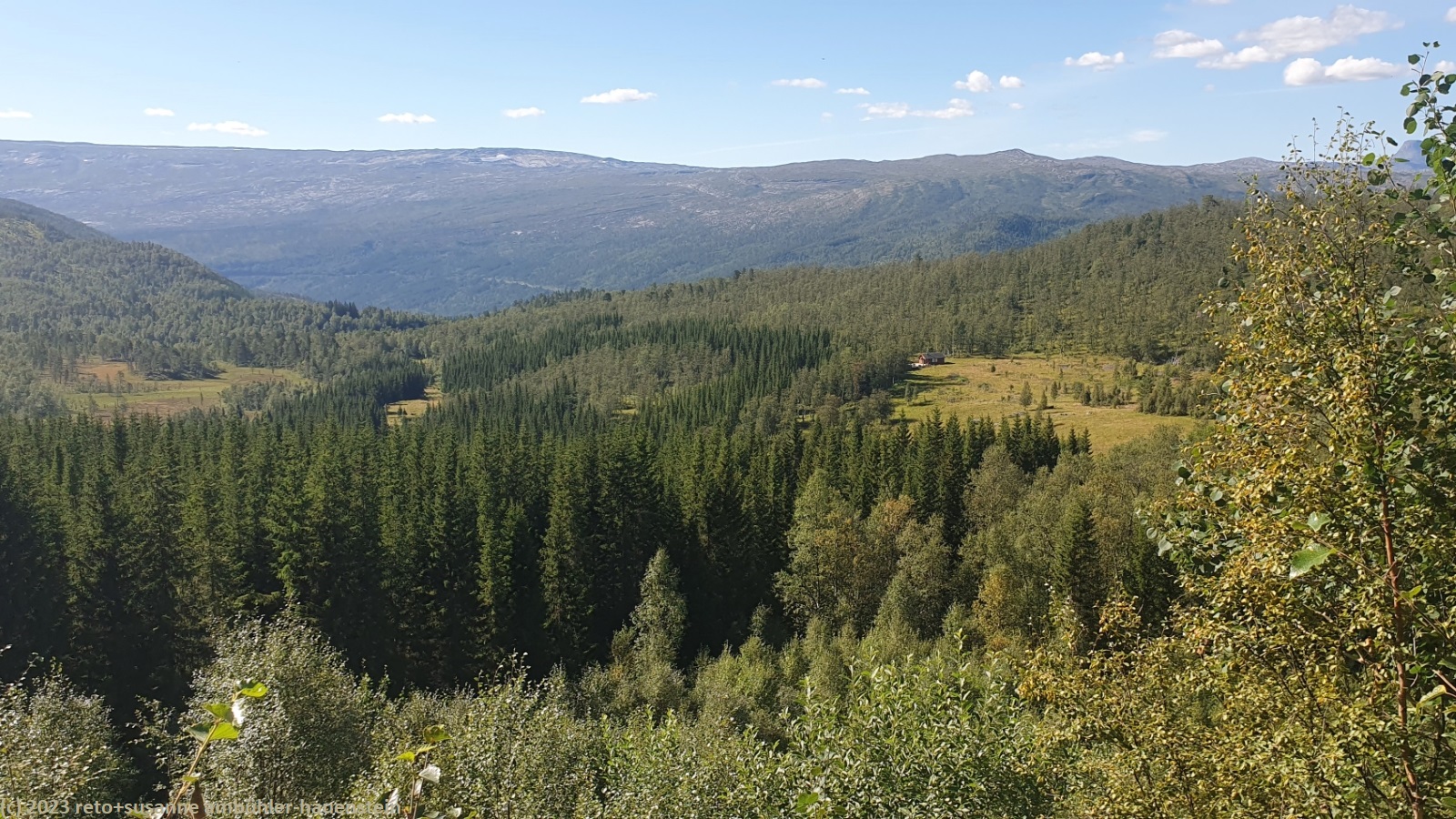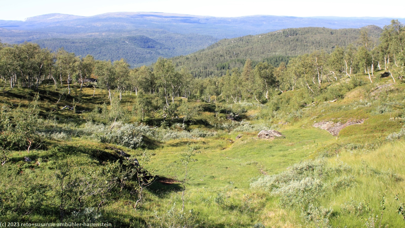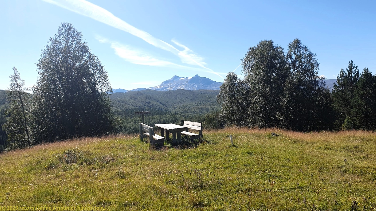 so packen wir den rucksack, ziehen die wanderschuhe an und brechen auf. das wetter ist wunderschön und es ist ungewohnt warm. auf einer steilen forststrasse erklimmen wir das nordnesfjell hinter dem campingplatz. im wald herrscht eine angenehme temperatur. auf etwa 400 m.ü.m sind wir schon ziemlich nahe an der waldgrenze. hier wachsen vorallem niedrige birken. auf der alp hat es schafe, einige hütten und einen picknicktisch mit fantastischer aussicht. obwohl mittag längst vorbei ist, hat susanne noch überhaupt keinen hunger. ich aber schon und so esse ich eines meiner brote und wir geniessen die aussicht.