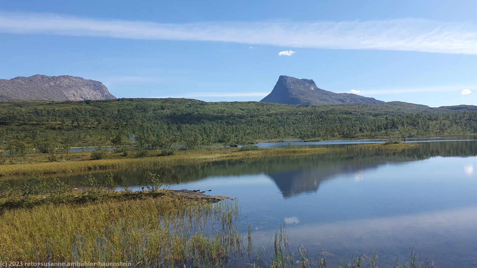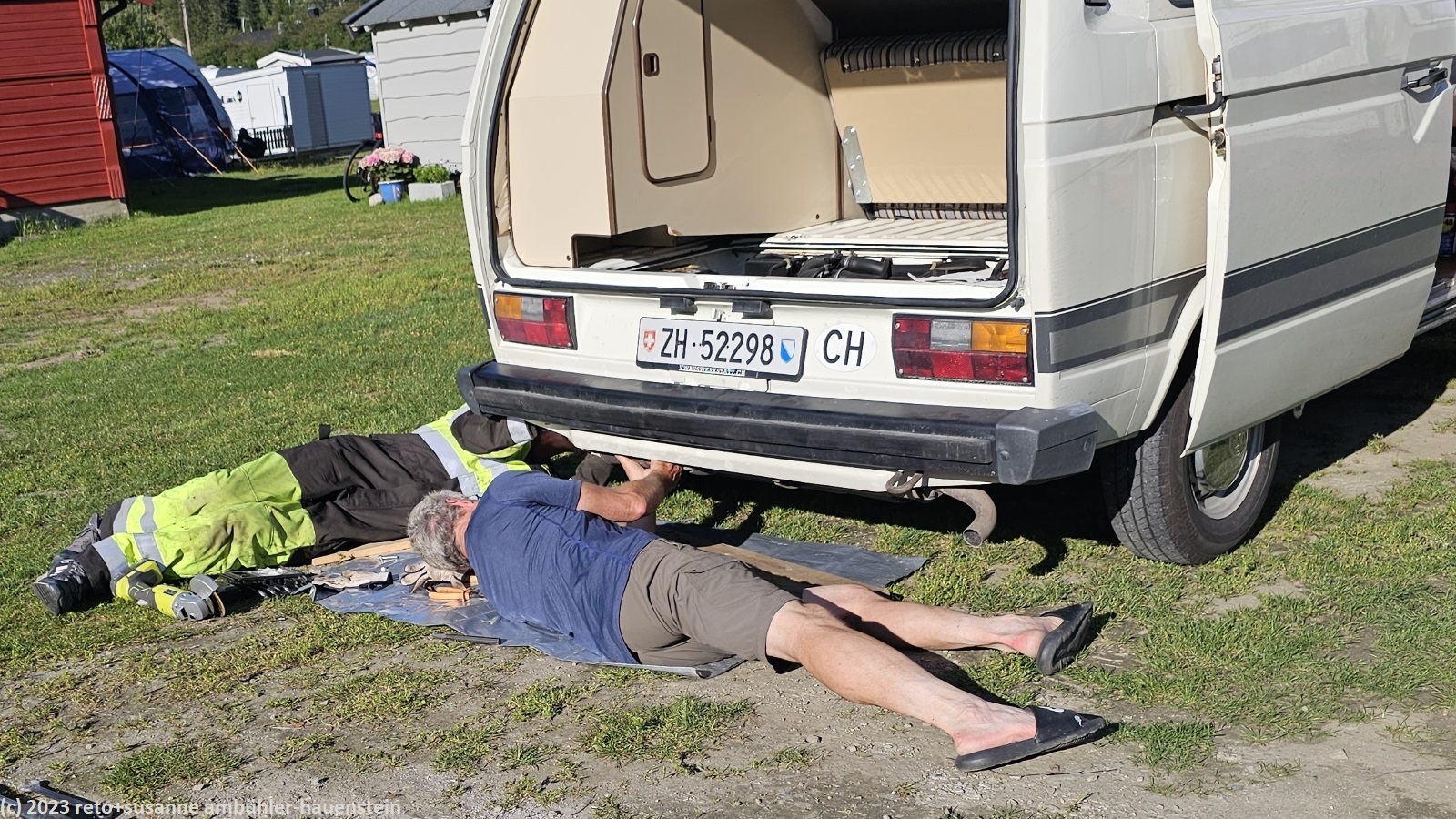 wir stehen kurz nach 8 uhr auf und frühstücken im freien, auch wenn es trotz wolkenlosem himmel noch ziemlich kühl ist. als ich mich dann den sechs schrauben an unserem katalisator annehme, ist es schon recht warm. es gelingt mir, drei davon zu öffnen, die anderen drei sitzen dagegen so fest, dass ich keine chance habe, diese zu lösen. als wir uns überlegen, im ort entsprechendes werkzeug zu kaufen, bietet uns ein nachbar seine hilfe an. da er das nötige werkzeug erst im laufe des nachmittages besorgen kann, starten wir zur geplanten wanderung auf das nordnesfjell. wir erwischen einen äusserst sonnigen tag und geniessen die herrliche berglandschaft in vollen zügen. um 15:40 uhr sind wir zurück auf dem campingplatz. da unser helfer noch nicht da ist, trinken wir im restaurant eine tasse kaffee. der nachbar, lastwagenfahrer von beruf, erscheint im überkleid und hat die drei schrauben im nu mit einer kleinen trennscheibe entfernt. wir schütteln die losen keramikstücke aus dem katalisator und setzen diesen wieder ein. die anschliessende probefahrt ist ein voller erfolg, das schlimme geräusch ist verschwunden und der motor gibt wieder die gewohnte leistung ab. wir bedanken uns für die hilfe, eine entschädigung lehnt der freundliche helfer entschieden ab. das nachtessen geniessen wir im freien, den abend verbringen im wagen. so wie es aussieht, können wir unsere reise wie geplant fortsetzen, das hätten wir gestern kaum zu hoffen gewagt.