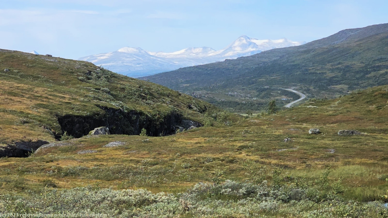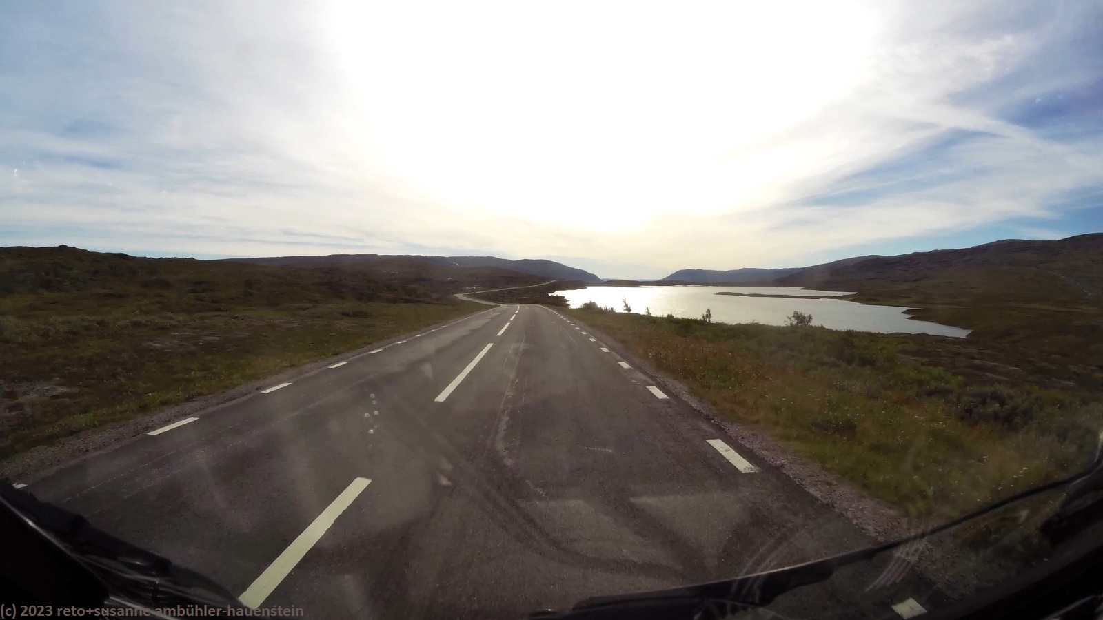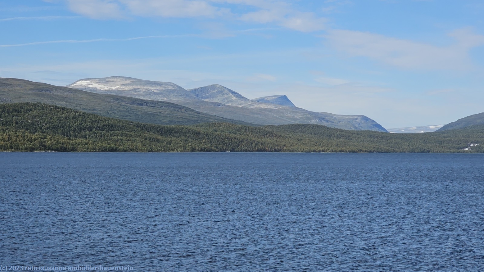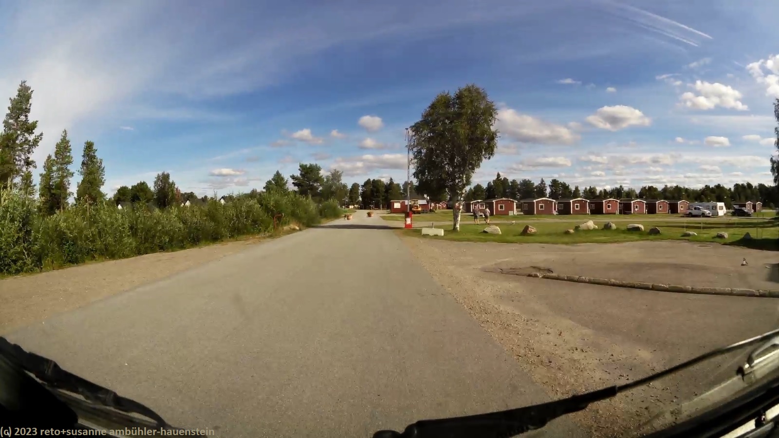 wir stehen gegen 9 uhr auf und freuen uns über das freundliche wetter. anfangs ist es zwar wieder ziemlich kühl, aber im laufe des tages wird es richtig warm. klar, dass wir im freien frühstücken. danach packen wir zusammen und verlassen nordnes ziemlich genau um 10 uhr. gut 10 km folgen wir der E6 südwärts, dann biegen wir auf die strasse 77 ab. hier beginnt der aufstieg auf das bis über 700 meter über meer gelegene fjäll. die beiden motorhomes, die anfangs unsere fahrt etwas bremsen, haben wir bald hinter uns und auf dem ganzen weg bis arjeplog gibt es keine weiteren verkehrshindernisse mehr. kurz nach 10:30 uhr überqueren wir die grenze, nun sind wir wieder in schweden. hier trägt die strasse die nummer 95, ansonsten ändert sich gar nichts. wir fahren durch eine faszinierende hochgebirgslandschaft, gelegentlich mit einem kleineren oder grösseren see angereichert. unser wagen läuft fantastisch, so wie wir uns das gewohnt sind. vorbei sind die albträume von reiseabbruch und horrenden rechnungen für ein neues getriebe. gut, der katalisator muss natürlich ersetzt werden, aber solange wir ohne sorgen fahren können, ist das ein klacks. kurz vor mittag erreichen wir den uns wohlbekannten campingplatz kraja bei arjeplog.