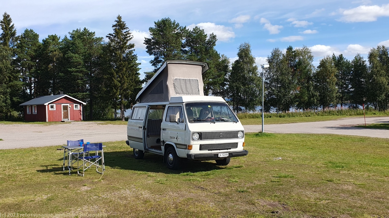der platz ist fast leer. wir werden freundlich empfangen und erhalten einen stellplatz gerade beim servicegebäude. das ist sehr praktisch, denn heute ist ein waschtag geplant. während susanne die erste maschine startet, tische ich für das mittagessen. dieses geniessen wir bei sonnenschein im freien. allerdings frischt der wind gelegentlich etwas auf und fegt leere behälter vom tisch. trotzdem ist es sehr warm, für mein empfinden schon an der grenze zu heiss. im restaurant geniessen wir kaffee und kanelbulle, danach unterhalte ich mich mit hermann. dieses mal klappt es bestens, kein stromausfall in augsburg unterbricht unsere session. im gegenteil, die internetverbindung ist hervorragend, kein ruckeln und keine unterbrüche.