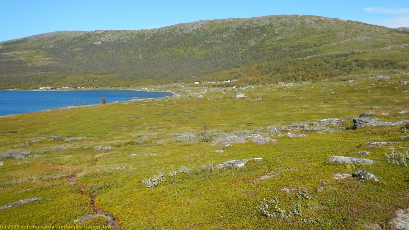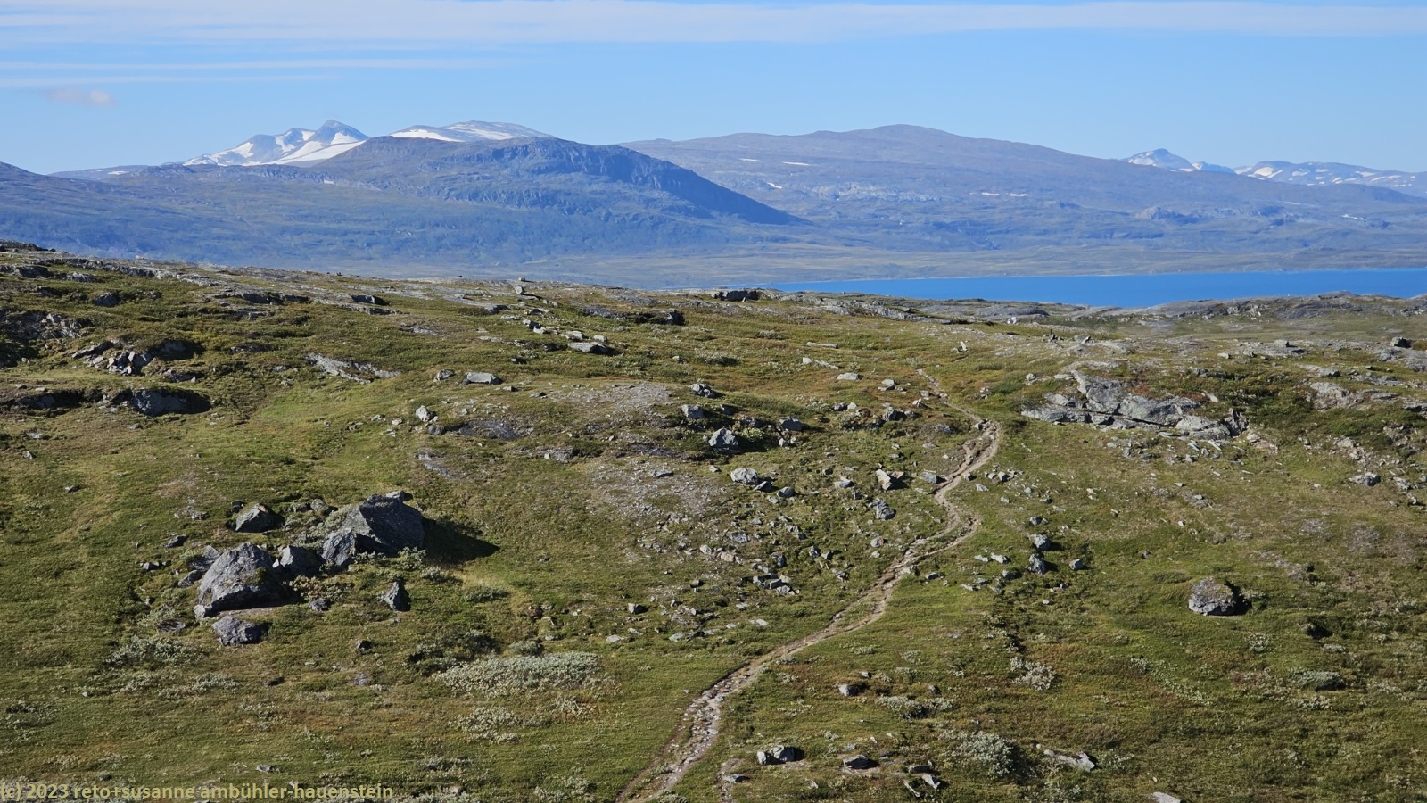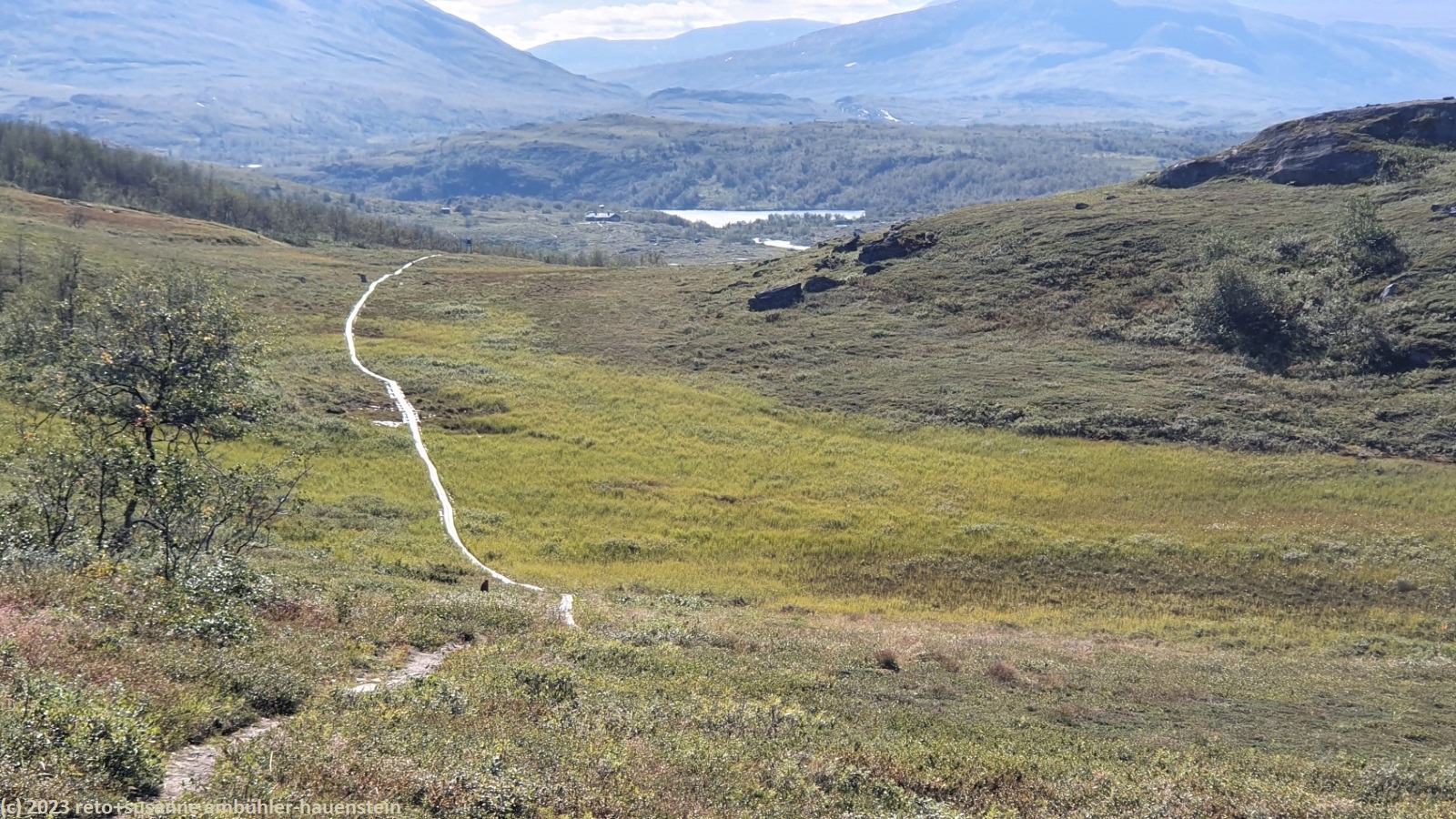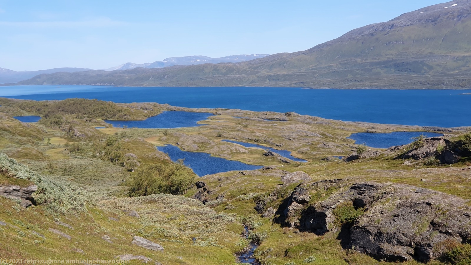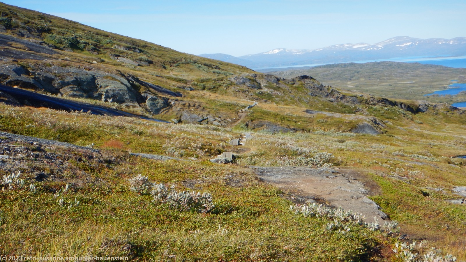 als wir um 7 uhr erwachen ist der himmel noch immer wolkenlos. auch in der nacht war es sternenklar. wir frühstücken in unserer gemütlichen hütte. danach packen wir unsere rucksäcke und machen sauber. um 8:45 uhr starten wir. heute liegt nur eine kurze etappe vor uns. auf den ersten 4 km steigt der weg meistens sanft an. an einigen stellen ist es ein bisschen steiler oder wir müssen zumindest einen grossen schritt machen. die aussicht ist fantastisch und wird mit jedem schritt noch spektakulärer. zum einen leuchtet der virihaure auch heute in einem unglaublichen blau, zum anderen tauchen unter uns immer wieder kleine seelein auf. dahinter ragen die mit schnee bedeckten gipfel in den stahlblauen himmel. was für ein tag in was für einer fantastischen landschaft ! als wir den höchsten punkt unserer wanderung erreicht haben, geht es durch eine wunderschöne felslandschaft, die mit kleinen tümpeln und sümpfen durchsetzt ist. auf halbem weg machen wir kurz pause. wir befinden uns in einer senke zwischen zwei hügeln. ein steifer wind bläst schon den ganzen tag. sobald man sich hinsetzt, wird es frisch. nun steigt der weg noch einmal etwas an, dann geht es für längere zeit der höhenlinie entlang. wir blicken jetzt ins tal des jållevare. der pfad senkt sich unter die baumgrenze und wir gehen durch einen lichten birkenwald. es folgen einige längere holzstege, danach nähern wir uns dem seeufer. rund um die bucht sind kleine häuser weit verstreut. um 12:20 uhr erreichen wir staloluokta.