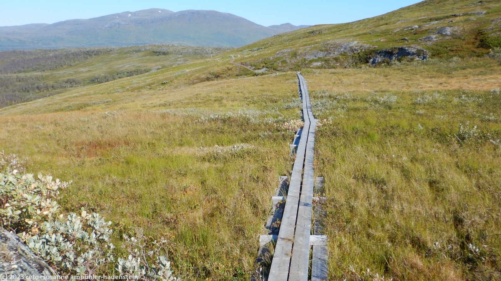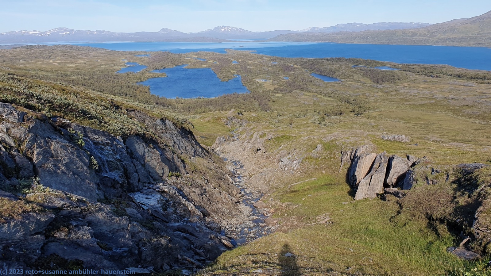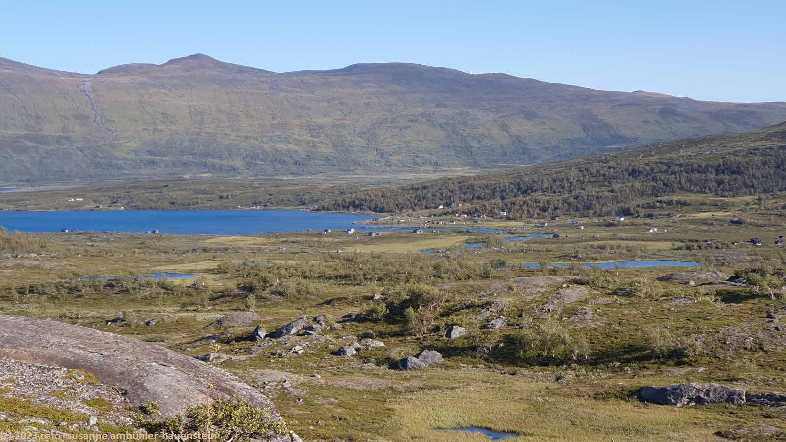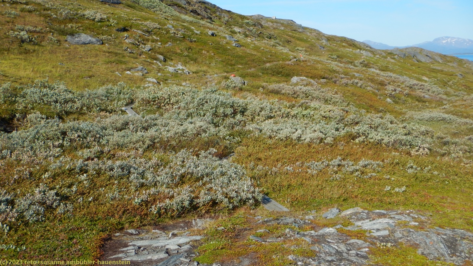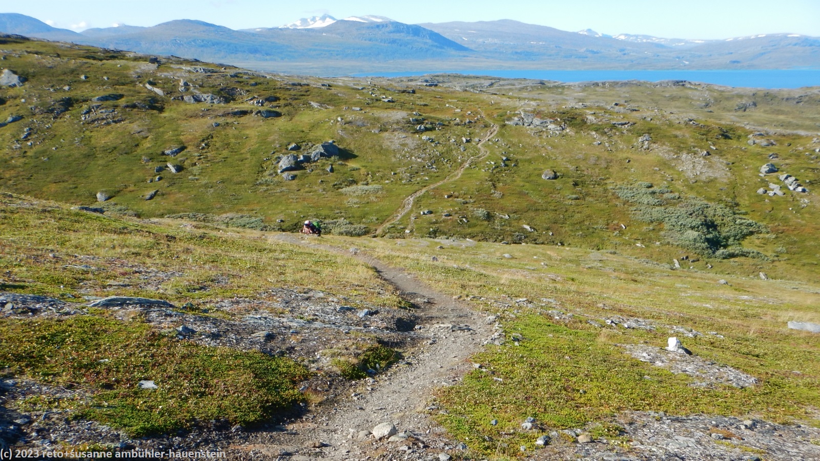 als wir um 7 uhr erwachen ist der himmel noch immer wolkenlos. auch in der nacht war es sternenklar. wir frühstücken in unserer gemütlichen hütte. danach packen wir unsere rucksäcke und machen sauber. um 8:45 uhr starten wir. heute liegt nur eine kurze etappe vor uns. auf den ersten 4 km steigt der weg meistens sanft an. an einigen stellen ist es ein bisschen steiler oder wir müssen zumindest einen grossen schritt machen. die aussicht ist fantastisch und wird mit jedem schritt noch spektakulärer. zum einen leuchtet der virihaure auch heute in einem unglaublichen blau, zum anderen tauchen unter uns immer wieder kleine seelein auf. dahinter ragen die mit schnee bedeckten gipfel in den stahlblauen himmel. was für ein tag in was für einer fantastischen landschaft ! als wir den höchsten punkt unserer wanderung erreicht haben, geht es durch eine wunderschöne felslandschaft, die mit kleinen tümpeln und sümpfen durchsetzt ist. auf halbem weg machen wir kurz pause. wir befinden uns in einer senke zwischen zwei hügeln. ein steifer wind bläst schon den ganzen tag. sobald man sich hinsetzt, wird es frisch. nun steigt der weg noch einmal etwas an, dann geht es für längere zeit der höhenlinie entlang. wir blicken jetzt ins tal des jållevare. der pfad senkt sich unter die baumgrenze und wir gehen durch einen lichten birkenwald. es folgen einige längere holzstege, danach nähern wir uns dem seeufer. rund um die bucht sind kleine häuser weit verstreut. um 12:20 uhr erreichen wir staloluokta.