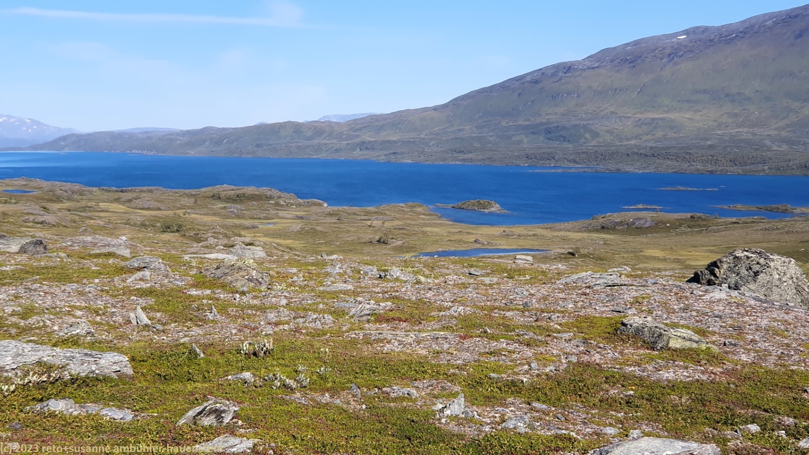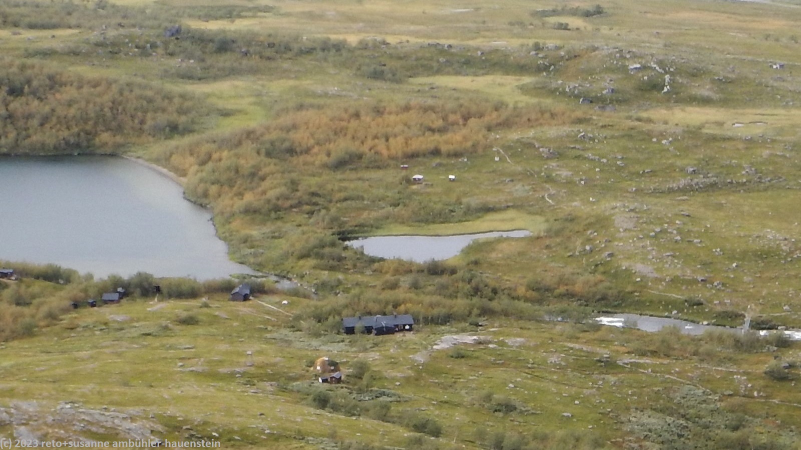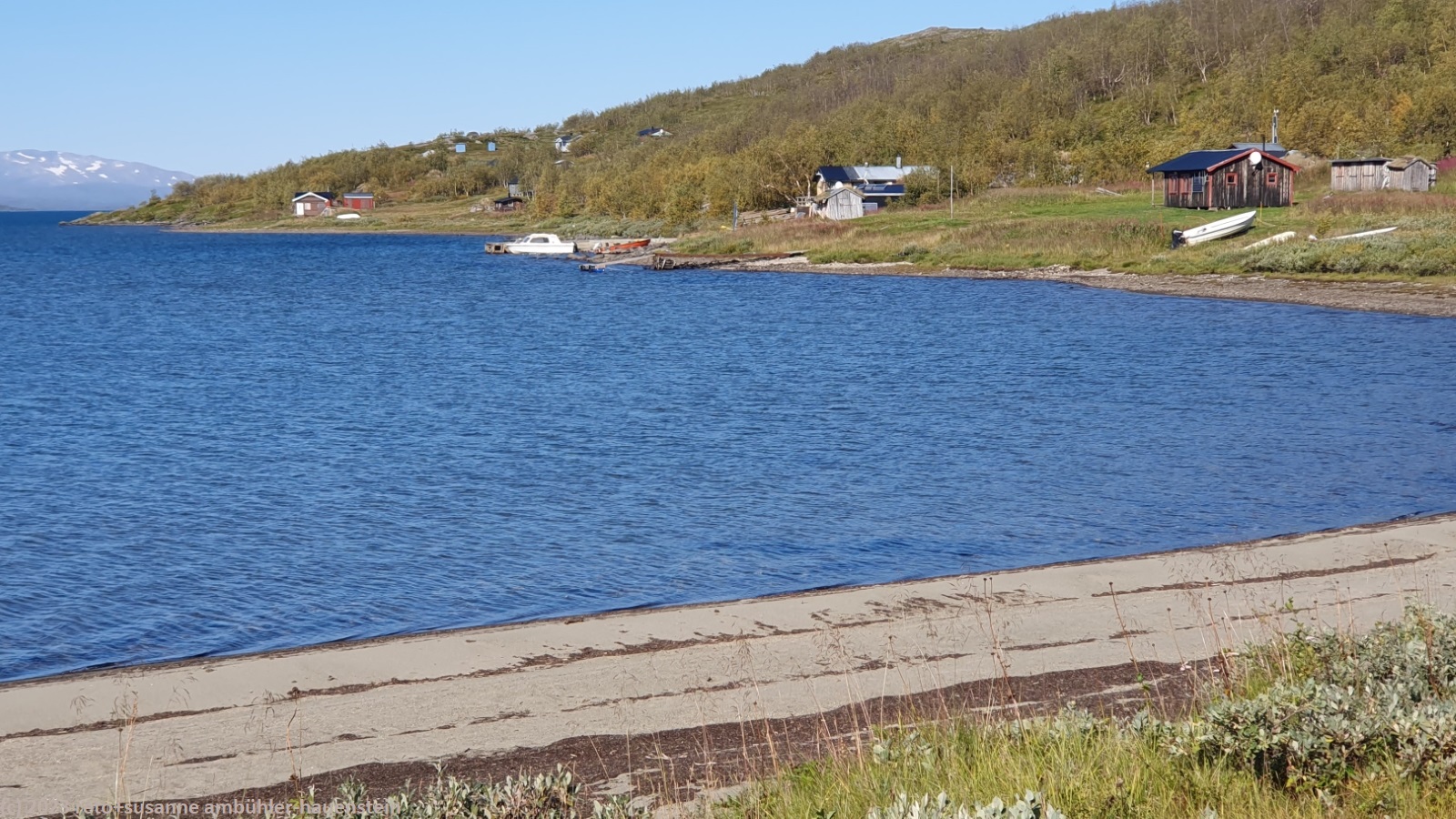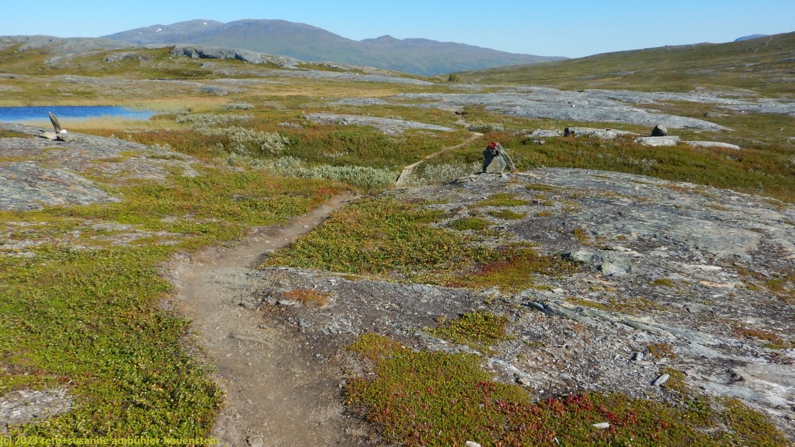 als wir um 7 uhr erwachen ist der himmel noch immer wolkenlos. auch in der nacht war es sternenklar. wir frühstücken in unserer gemütlichen hütte. danach packen wir unsere rucksäcke und machen sauber. um 8:45 uhr starten wir. heute liegt nur eine kurze etappe vor uns. auf den ersten 4 km steigt der weg meistens sanft an. an einigen stellen ist es ein bisschen steiler oder wir müssen zumindest einen grossen schritt machen. die aussicht ist fantastisch und wird mit jedem schritt noch spektakulärer. zum einen leuchtet der virihaure auch heute in einem unglaublichen blau, zum anderen tauchen unter uns immer wieder kleine seelein auf. dahinter ragen die mit schnee bedeckten gipfel in den stahlblauen himmel. was für ein tag in was für einer fantastischen landschaft ! als wir den höchsten punkt unserer wanderung erreicht haben, geht es durch eine wunderschöne felslandschaft, die mit kleinen tümpeln und sümpfen durchsetzt ist. auf halbem weg machen wir kurz pause. wir befinden uns in einer senke zwischen zwei hügeln. ein steifer wind bläst schon den ganzen tag. sobald man sich hinsetzt, wird es frisch. nun steigt der weg noch einmal etwas an, dann geht es für längere zeit der höhenlinie entlang. wir blicken jetzt ins tal des jållevare. der pfad senkt sich unter die baumgrenze und wir gehen durch einen lichten birkenwald. es folgen einige längere holzstege, danach nähern wir uns dem seeufer. rund um die bucht sind kleine häuser weit verstreut. um 12:20 uhr erreichen wir staloluokta.