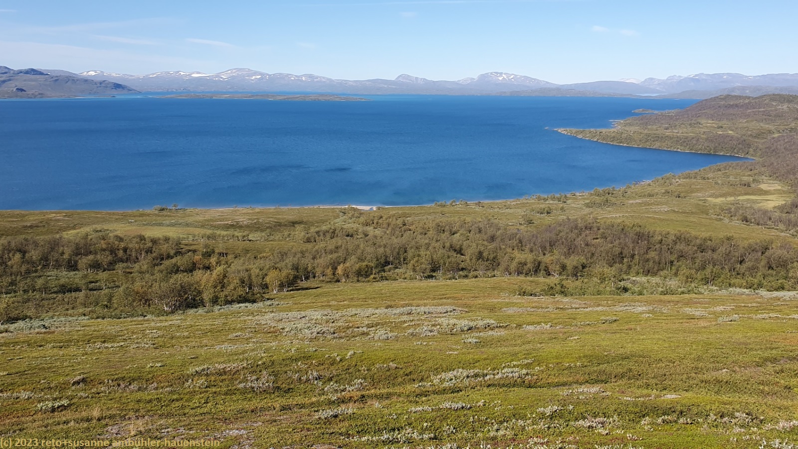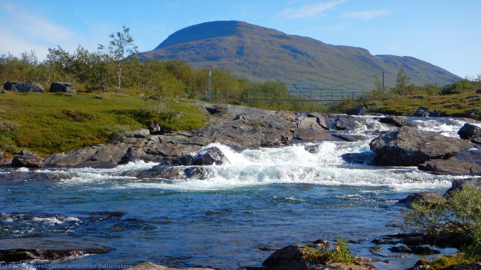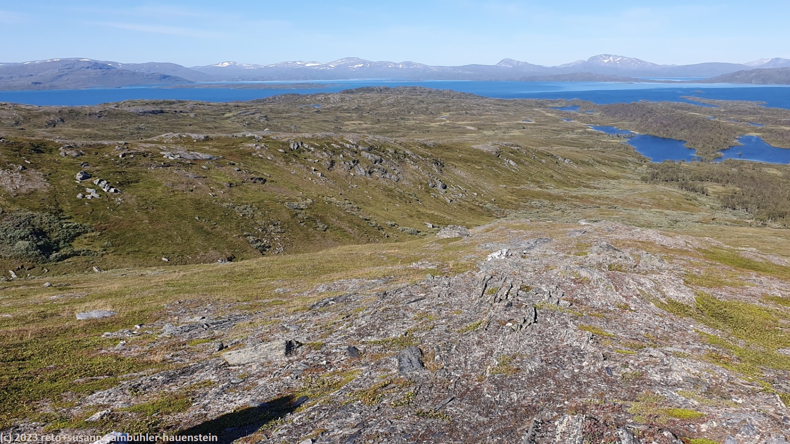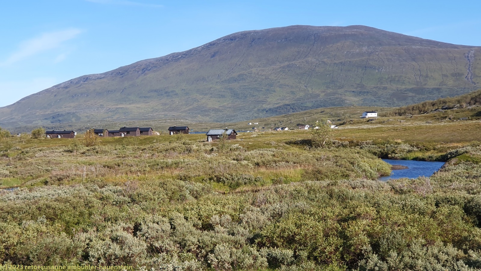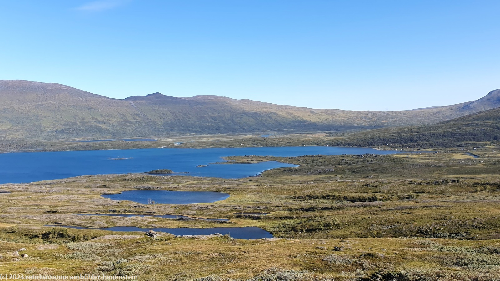 als wir um 7 uhr erwachen ist der himmel noch immer wolkenlos. auch in der nacht war es sternenklar. wir frühstücken in unserer gemütlichen hütte. danach packen wir unsere rucksäcke und machen sauber. um 8:45 uhr starten wir. heute liegt nur eine kurze etappe vor uns. auf den ersten 4 km steigt der weg meistens sanft an. an einigen stellen ist es ein bisschen steiler oder wir müssen zumindest einen grossen schritt machen. die aussicht ist fantastisch und wird mit jedem schritt noch spektakulärer. zum einen leuchtet der virihaure auch heute in einem unglaublichen blau, zum anderen tauchen unter uns immer wieder kleine seelein auf. dahinter ragen die mit schnee bedeckten gipfel in den stahlblauen himmel. was für ein tag in was für einer fantastischen landschaft ! als wir den höchsten punkt unserer wanderung erreicht haben, geht es durch eine wunderschöne felslandschaft, die mit kleinen tümpeln und sümpfen durchsetzt ist. auf halbem weg machen wir kurz pause. wir befinden uns in einer senke zwischen zwei hügeln. ein steifer wind bläst schon den ganzen tag. sobald man sich hinsetzt, wird es frisch. nun steigt der weg noch einmal etwas an, dann geht es für längere zeit der höhenlinie entlang. wir blicken jetzt ins tal des jållevare. der pfad senkt sich unter die baumgrenze und wir gehen durch einen lichten birkenwald. es folgen einige längere holzstege, danach nähern wir uns dem seeufer. rund um die bucht sind kleine häuser weit verstreut. um 12:20 uhr erreichen wir staloluokta.