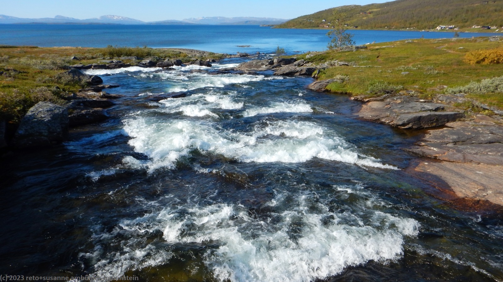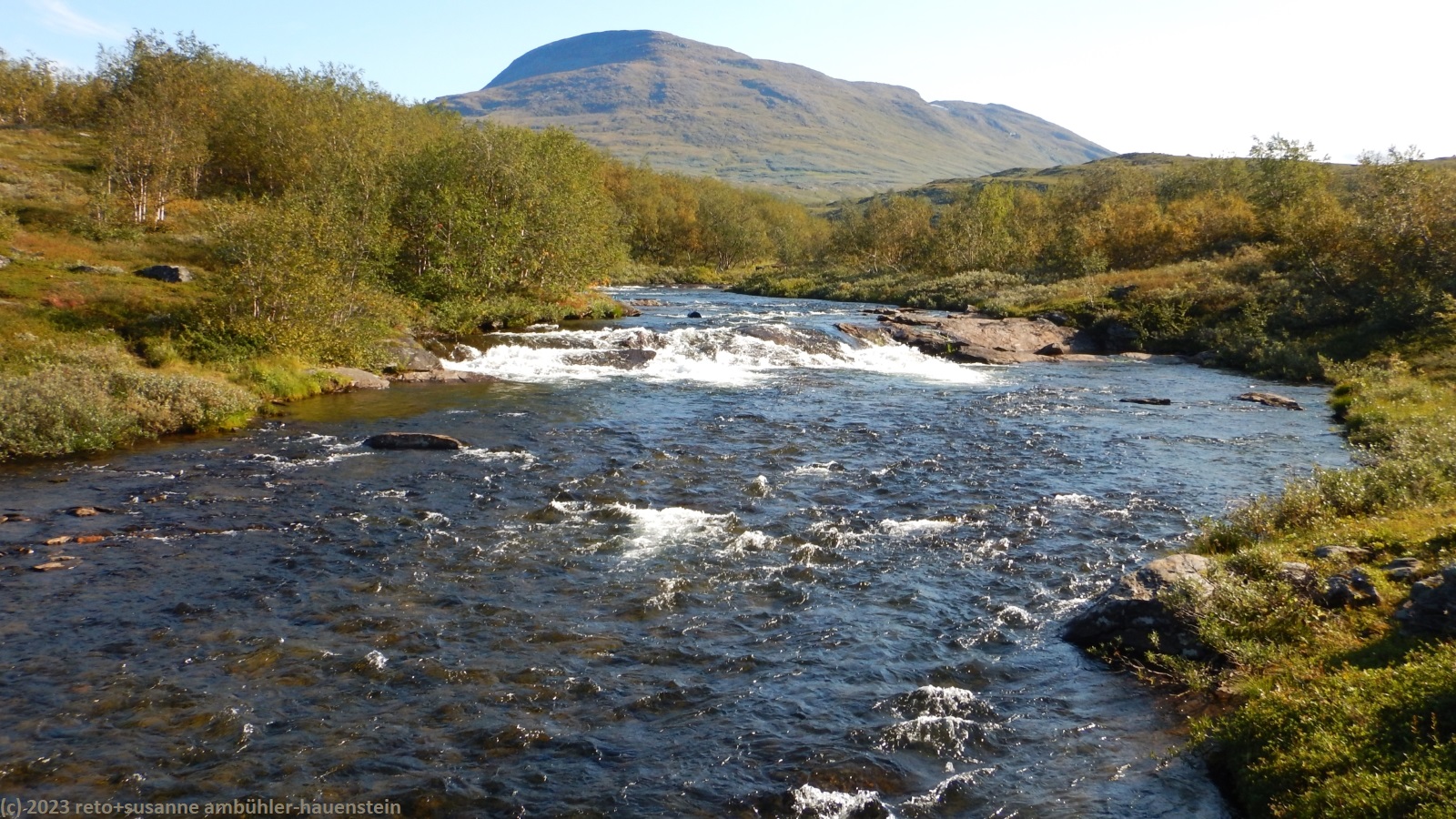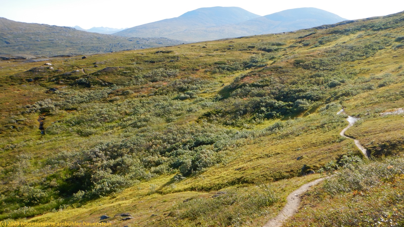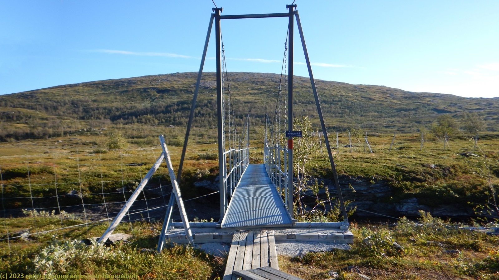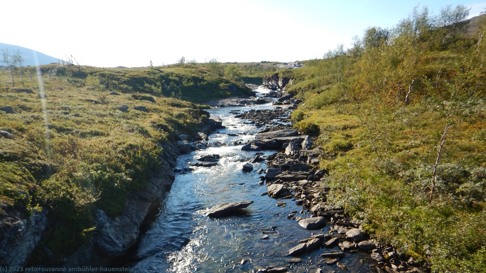 als wir um 7 uhr erwachen ist der himmel noch immer wolkenlos. auch in der nacht war es sternenklar. wir frühstücken in unserer gemütlichen hütte. danach packen wir unsere rucksäcke und machen sauber. um 8:45 uhr starten wir. heute liegt nur eine kurze etappe vor uns. auf den ersten 4 km steigt der weg meistens sanft an. an einigen stellen ist es ein bisschen steiler oder wir müssen zumindest einen grossen schritt machen. die aussicht ist fantastisch und wird mit jedem schritt noch spektakulärer. zum einen leuchtet der virihaure auch heute in einem unglaublichen blau, zum anderen tauchen unter uns immer wieder kleine seelein auf. dahinter ragen die mit schnee bedeckten gipfel in den stahlblauen himmel. was für ein tag in was für einer fantastischen landschaft ! als wir den höchsten punkt unserer wanderung erreicht haben, geht es durch eine wunderschöne felslandschaft, die mit kleinen tümpeln und sümpfen durchsetzt ist. auf halbem weg machen wir kurz pause. wir befinden uns in einer senke zwischen zwei hügeln. ein steifer wind bläst schon den ganzen tag. sobald man sich hinsetzt, wird es frisch. nun steigt der weg noch einmal etwas an, dann geht es für längere zeit der höhenlinie entlang. wir blicken jetzt ins tal des jållevare. der pfad senkt sich unter die baumgrenze und wir gehen durch einen lichten birkenwald. es folgen einige längere holzstege, danach nähern wir uns dem seeufer. rund um die bucht sind kleine häuser weit verstreut. um 12:20 uhr erreichen wir staloluokta.
