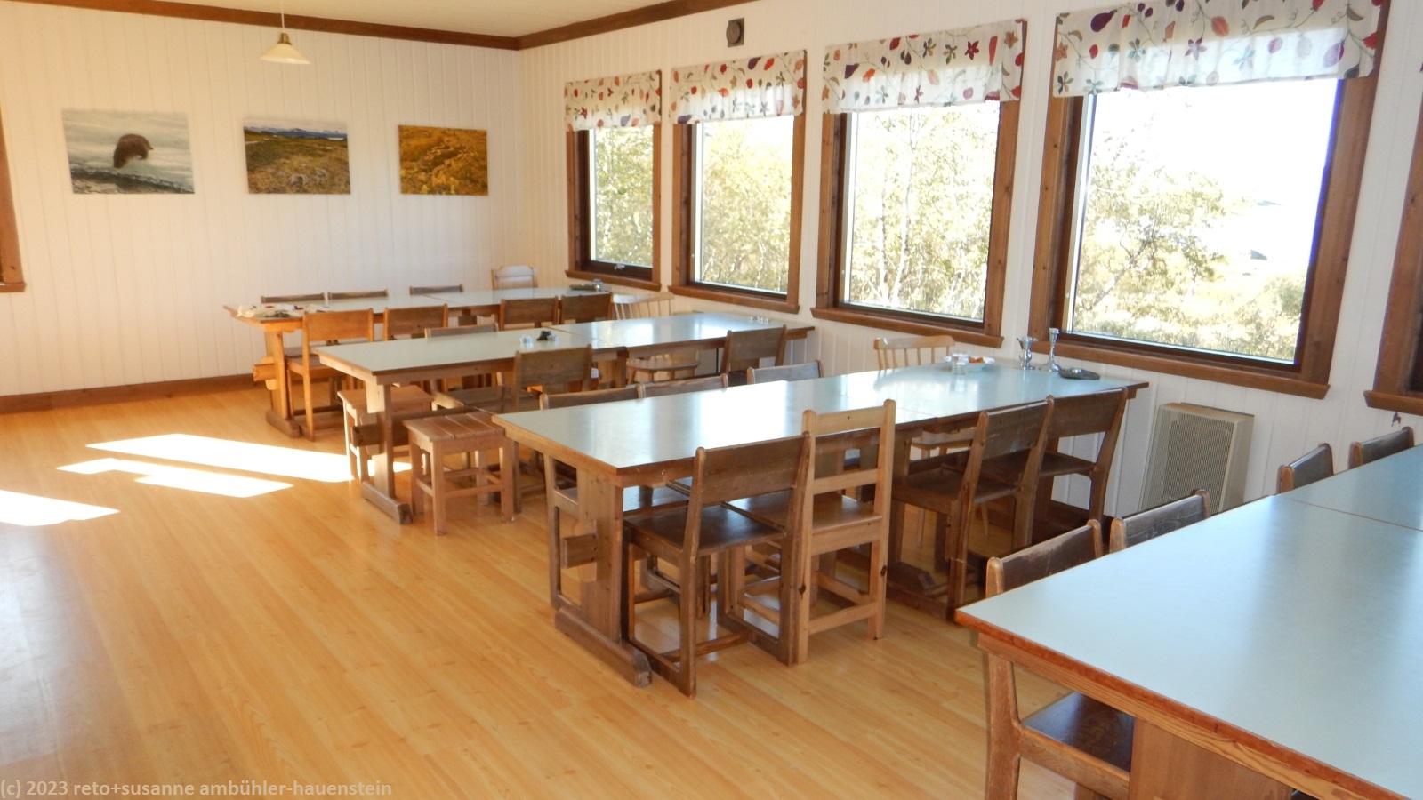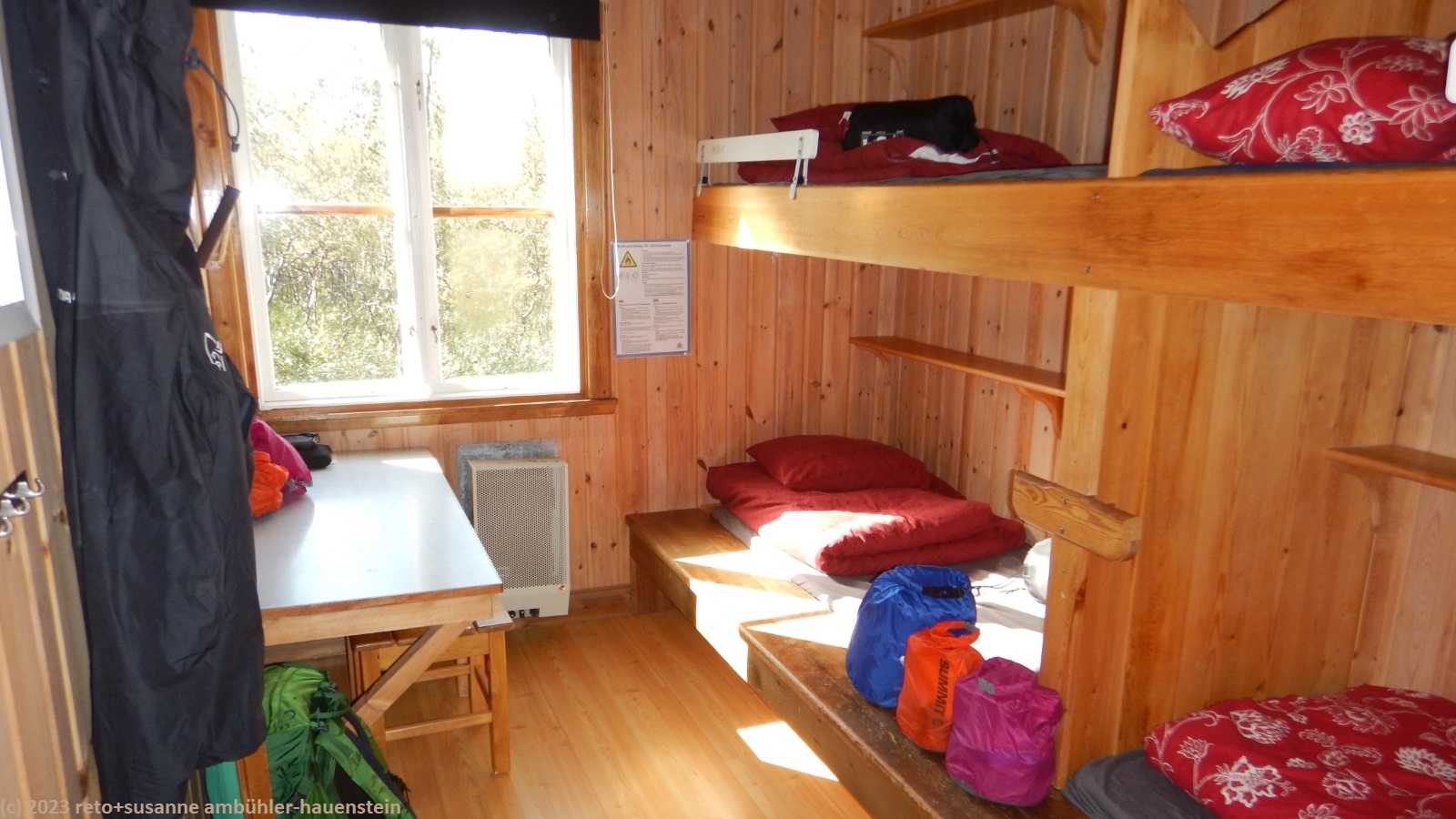 beim picknicktisch geniessen wir ein stück des fladenbrotes mit käse aus der tube sowie eine tasse tee. inzwischen treffen immer mehr gäste ein. heute müssen wir das zimmer mit zwei schwedinnen teilen. gegen 17 uhr setzen wir uns in den aufenthaltsraum. susanne bereitet das abendessen vor und macht sandwiches für morgen, ich schreibe tagebuch. in der küche herrscht reger betrieb, aber es geht sehr gesittet zu und her. kurz vor 18:30 uhr bereitet susanne das abendessen zu. wir geniessen dieses im aufenthaltsraum mit blick auf den see. es hat inzwischen ein bisschen mehr wolken, aber es ist immer noch sonnig. wir können uns kaum vorstellen, dass es morgen nicht mehr so schön und am dienstag regnerisch sein soll. um 20 uhr gehen wir zur sauna am fluss hinunter. von 18-19 uhr war sie offen für damen und von 19-20 uhr für herren. nun ist sie offen für alle. die meisten haben den saunabesuch bereits hinter sich. neben uns ist nur noch ein weiteres paar aus der schweiz anwesend. die sauna hat eine sehr angenehme temperatur. nach der ersten sitzung kühlen wir uns im kalten fluss ab. nach einer kurzen auszeit auf der bank im freien starten wir eine zweite sitzung. dieses mal erhalten wir gesellschaft von einem älteren schweden. er erzählt von seinem besuch in der schweiz vor zehn jahren und vom "green ribbon", einem langwanderweg in schweden, den er schon drei mal durchwandert hat. wir kühlen uns nochmals im fluss ab, dann setzen wir uns in den aufenthaltsraum und trinken noch eine tasse tee. gegen 22 uhr schlüpfen wir in unsere schlafsäcke.