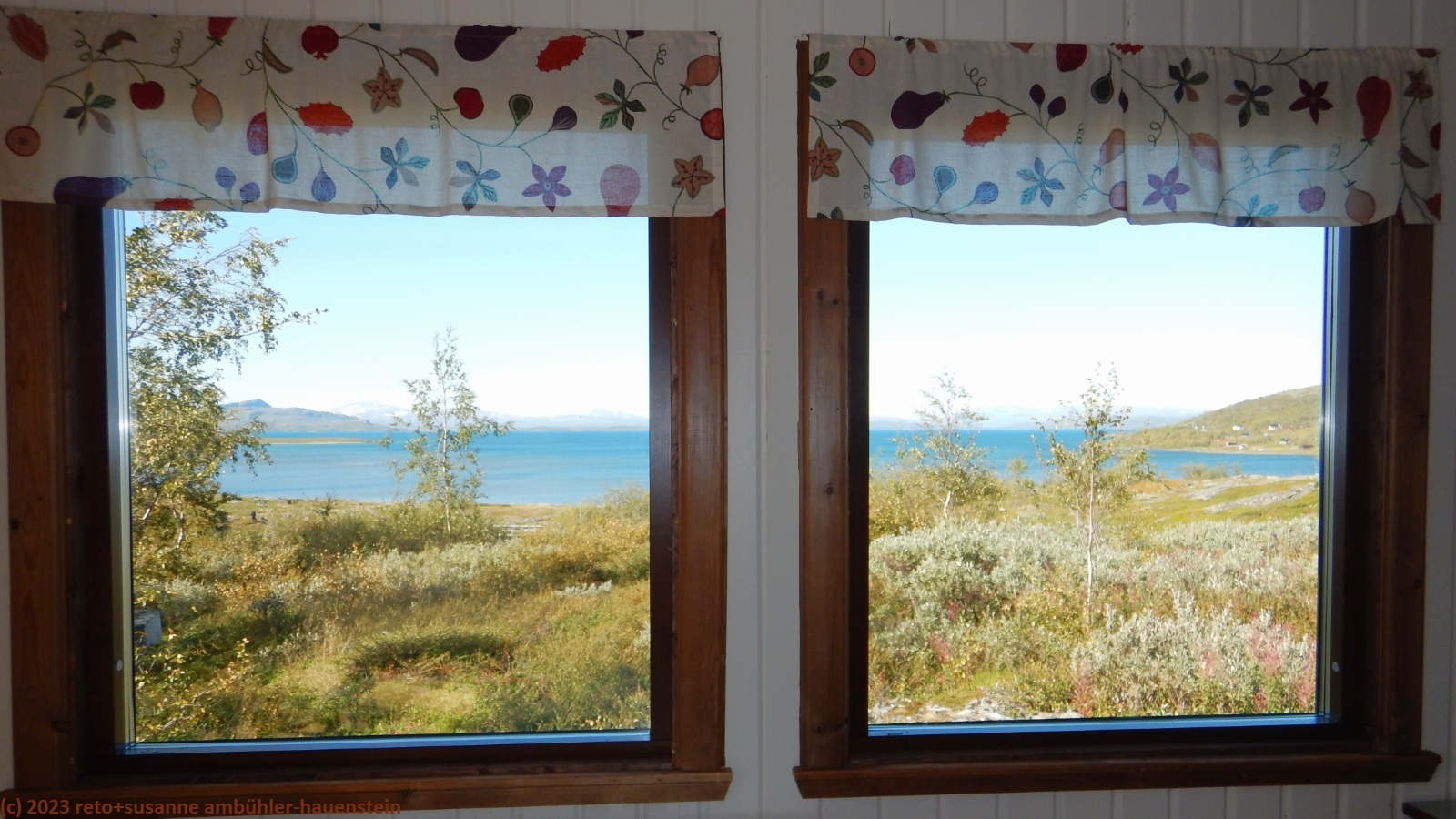 diesmal sind wir nicht ganz alleine. hier gibt es wieder nur ein gebäude mit gemeinsamer küche, einem aufenthaltsraum und mehreren 4-bett-zimmer. ausserdem gibt es "VIP"-zimmer mit eigener küche. wir finden die hüttenwartin und sie meint, wir sollen uns ein zimmer aussuchen. der empfang sei von 16 bis 18 uhr offen, wir sollen uns dann bei ihr melden. am picknicktisch mit wundervoller aussicht auf den virihaure und die umliegenden berge essen wir zu mittag. der himmel ist nach wie vor fast wolkenlos, aber es geht auch immer noch ein böiger wind. wir geniessen deshalb den kaffee im aufenthaltsraum, von dort hat man eine genauso fantastische aussicht.