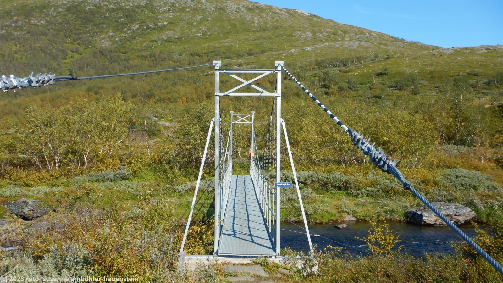 gegen 14 uhr machen wir uns im waschraum frisch. etwas später unternehmen wir einen spaziergang. wir überqueren den gieddejåhkå über eine hängebrücke. auf der anderen flussseite hat es plätze für zelte und ein toilettenhäuschen. rund um die hütte scheint zelten nicht erlaubt zu sein. auf dem rückweg folgen wir dem strand. er ist mit feinem, grauen kies bedeckt und sieht hervorragend zum baden aus. allerdings ist das wasser kalt und es wird bis weit hinaus nicht tief. auf der anderen seite der bucht kaufen wir köstliches fladenbrot und erkundigen uns, ob wir unseren helikopterflug noch irgendwie bestätigen müssen. die dame meint, wir sollen uns einfach zur angegebenen zeit beim entsprechend bezeichneten startplatz einfinden. auf dem rückweg zur fjällstuga kaufen wir bei einem kiosk einige lebensmittel ein.