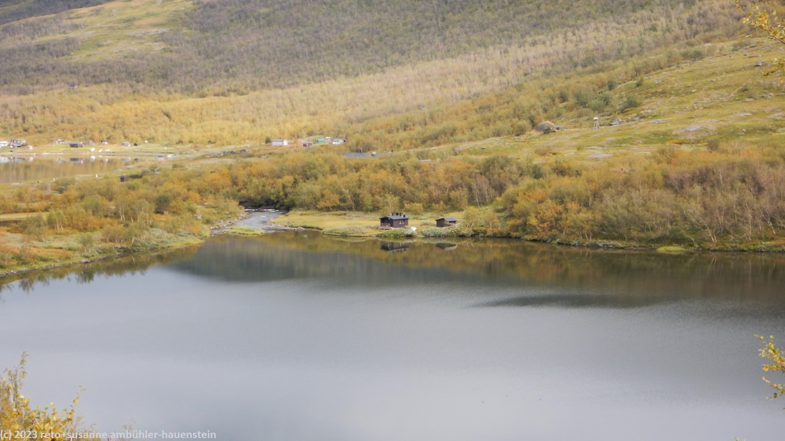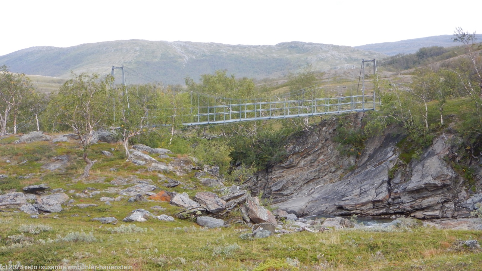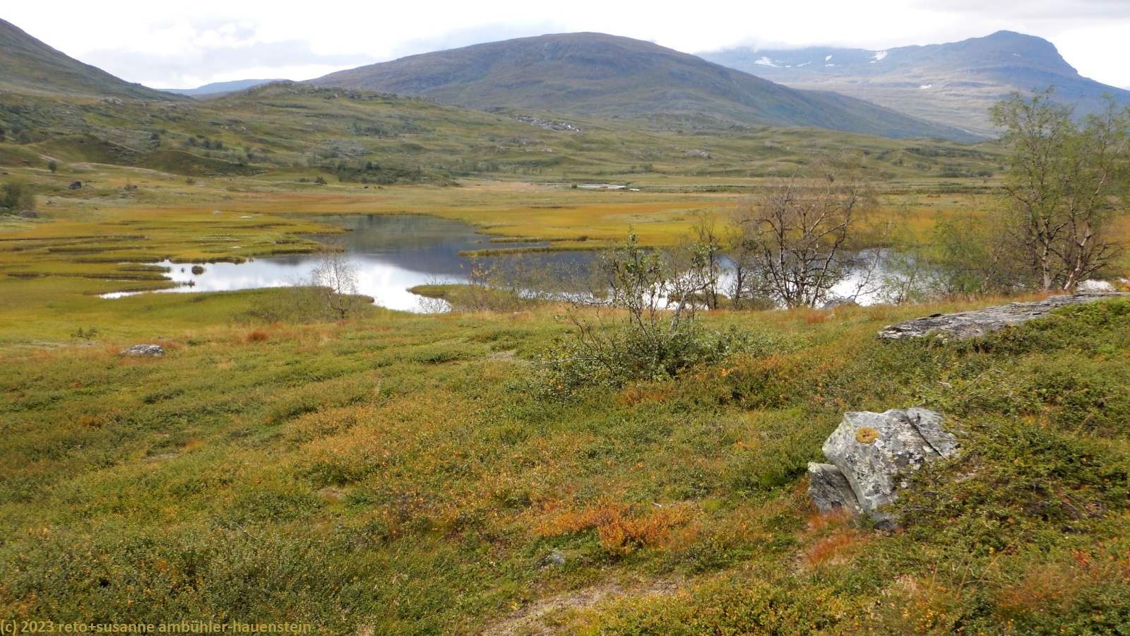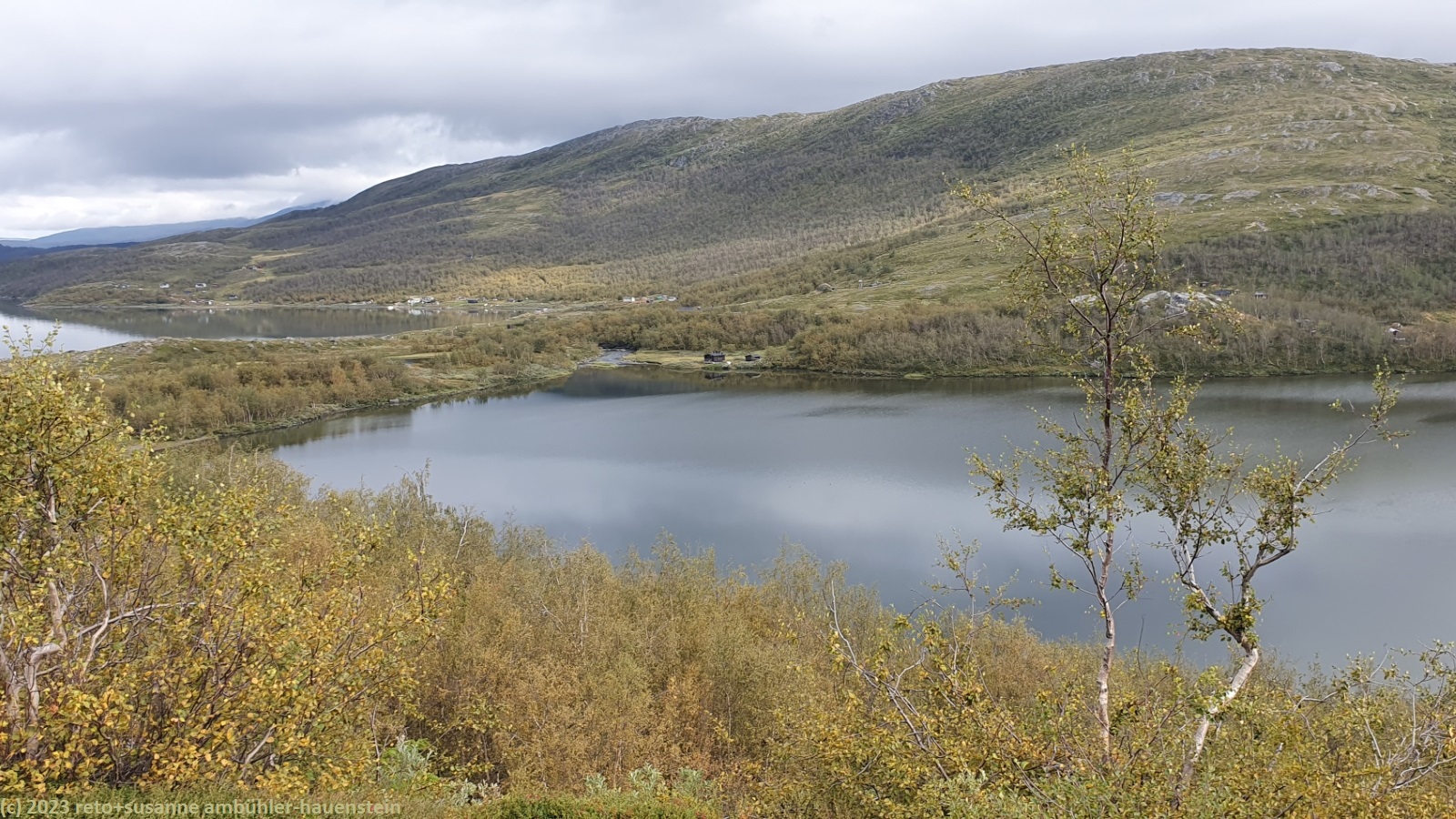 in der nacht hat es etwas geregnet, aber als wir um 7:20 uhr zur toilette gehen, ist es trocken. wir bleiben bis gegen 8 uhr in unseren schlafsäcken, dann stehen wir auf und frühstücken im aufenthaltsraum. hier ist es sehr ruhig. viele gäste sind schon aufgebrochen. nach dem frühstück reinigen wir einen teil des aufenthaltsraumes, sowie die beiden waschräume. an jeder zimmertür hängt ein plan, welches zimmer welchen teil des hauses reinigen soll. aber abgesehen davon, dass der plan nur in schwedisch verfasst ist, liest ihn ganz offensichtlich kaum jemand. auch wir haben ihn übersehen, bis uns ein anderer gast darauf aufmerksam gemacht hat. unser zimmer ist für den waschraum der männer zuständig, aber da niemand den plan beachtet, hapert es sehr mit der umsetzung. das wetter ist deutlich freundlicher als angesagt, was vermutlich daran liegt, dass der wind von süden auf norden gedreht hat. kurz nach 10:15 uhr brechen wir zu einer kurzwanderung auf. wir folgen dem nordkalottleden bis zur hängebrücke über den viejejåhkå. als wir losmarschieren ist es immer noch windstill. nach der hängebrücke bei unserer stuga geht es auf der anderen flussseite sanft aufwärts durch einen kleinen birkenwald. die blätter sind nun schon deutlich sichtbar gelb gefärbt. als wir über die baumgrenze kommen, sehen wir viele kleine seelein in einem ausgedehnten sumpfgebiet. um 11:15 uhr sind wir bei der hängebrücke. wir erklimmen einen kleinen hügel und geniessen die aussicht, dann machen wir uns auf den rückweg. nun wird es öfters sonnig, aber plötzlich ist ein frischer nordwind aufgekommen. kurz vor 12:15 uhr sind wir wieder in staloluokta.
