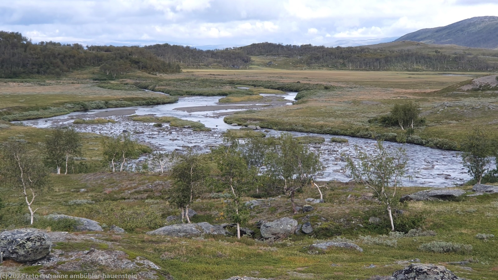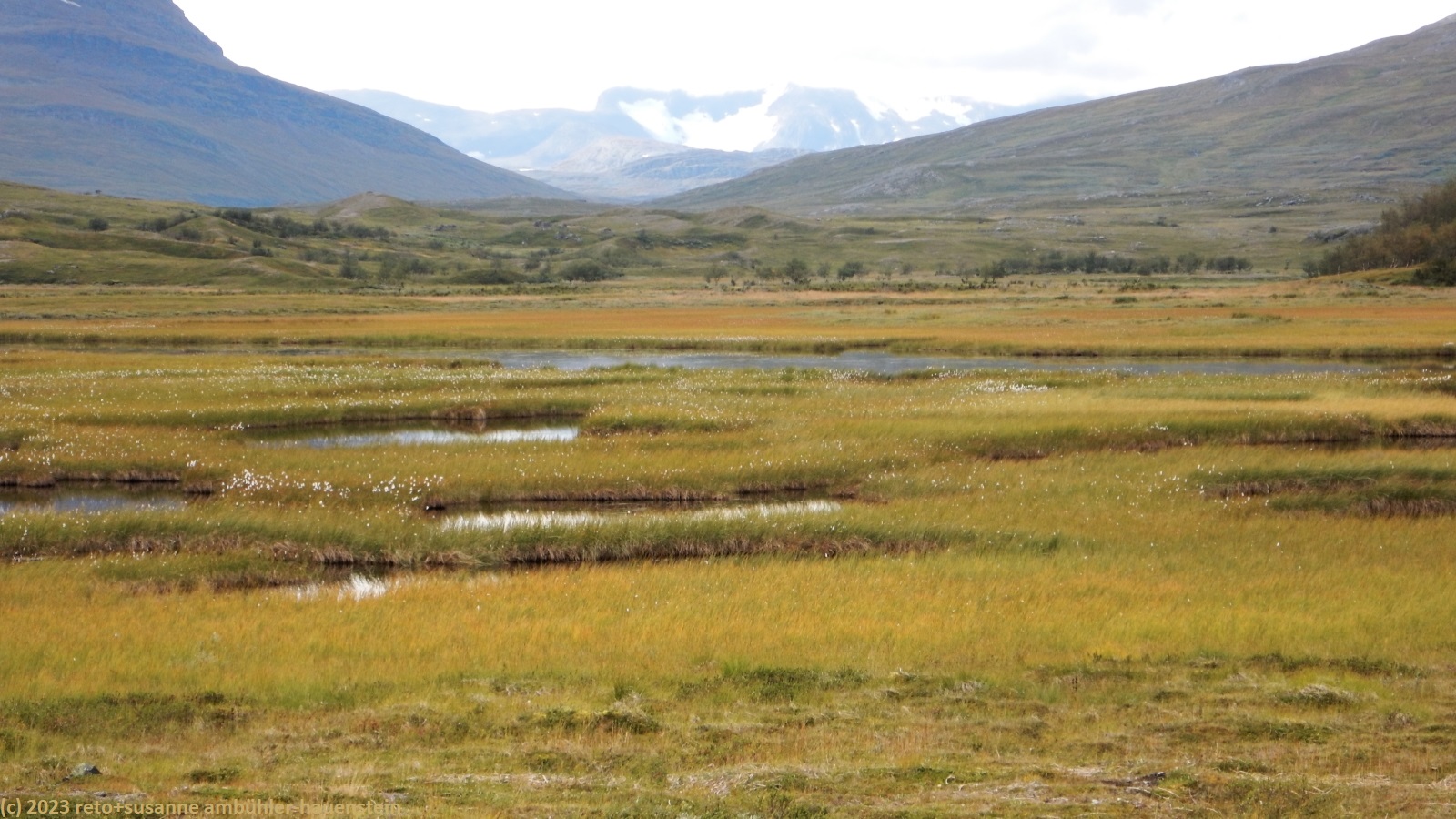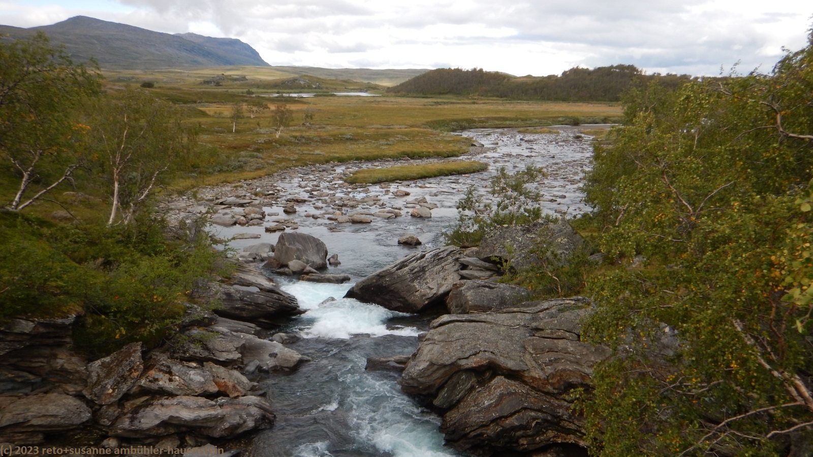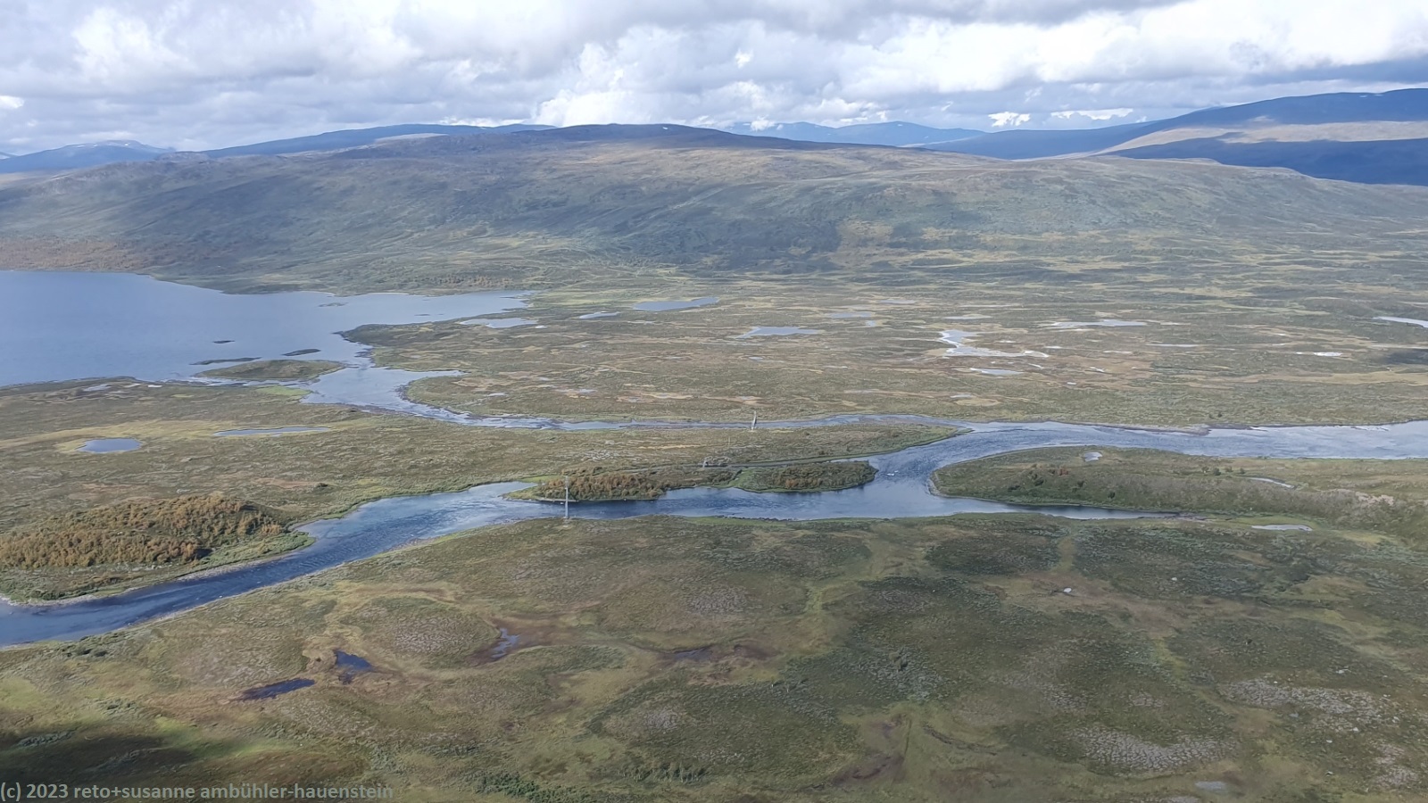 in der nacht hat es etwas geregnet, aber als wir um 7:20 uhr zur toilette gehen, ist es trocken. wir bleiben bis gegen 8 uhr in unseren schlafsäcken, dann stehen wir auf und frühstücken im aufenthaltsraum. hier ist es sehr ruhig. viele gäste sind schon aufgebrochen. nach dem frühstück reinigen wir einen teil des aufenthaltsraumes, sowie die beiden waschräume. an jeder zimmertür hängt ein plan, welches zimmer welchen teil des hauses reinigen soll. aber abgesehen davon, dass der plan nur in schwedisch verfasst ist, liest ihn ganz offensichtlich kaum jemand. auch wir haben ihn übersehen, bis uns ein anderer gast darauf aufmerksam gemacht hat. unser zimmer ist für den waschraum der männer zuständig, aber da niemand den plan beachtet, hapert es sehr mit der umsetzung. das wetter ist deutlich freundlicher als angesagt, was vermutlich daran liegt, dass der wind von süden auf norden gedreht hat. kurz nach 10:15 uhr brechen wir zu einer kurzwanderung auf. wir folgen dem nordkalottleden bis zur hängebrücke über den viejejåhkå. als wir losmarschieren ist es immer noch windstill. nach der hängebrücke bei unserer stuga geht es auf der anderen flussseite sanft aufwärts durch einen kleinen birkenwald. die blätter sind nun schon deutlich sichtbar gelb gefärbt. als wir über die baumgrenze kommen, sehen wir viele kleine seelein in einem ausgedehnten sumpfgebiet. um 11:15 uhr sind wir bei der hängebrücke. wir erklimmen einen kleinen hügel und geniessen die aussicht, dann machen wir uns auf den rückweg. nun wird es öfters sonnig, aber plötzlich ist ein frischer nordwind aufgekommen. kurz vor 12:15 uhr sind wir wieder in staloluokta.