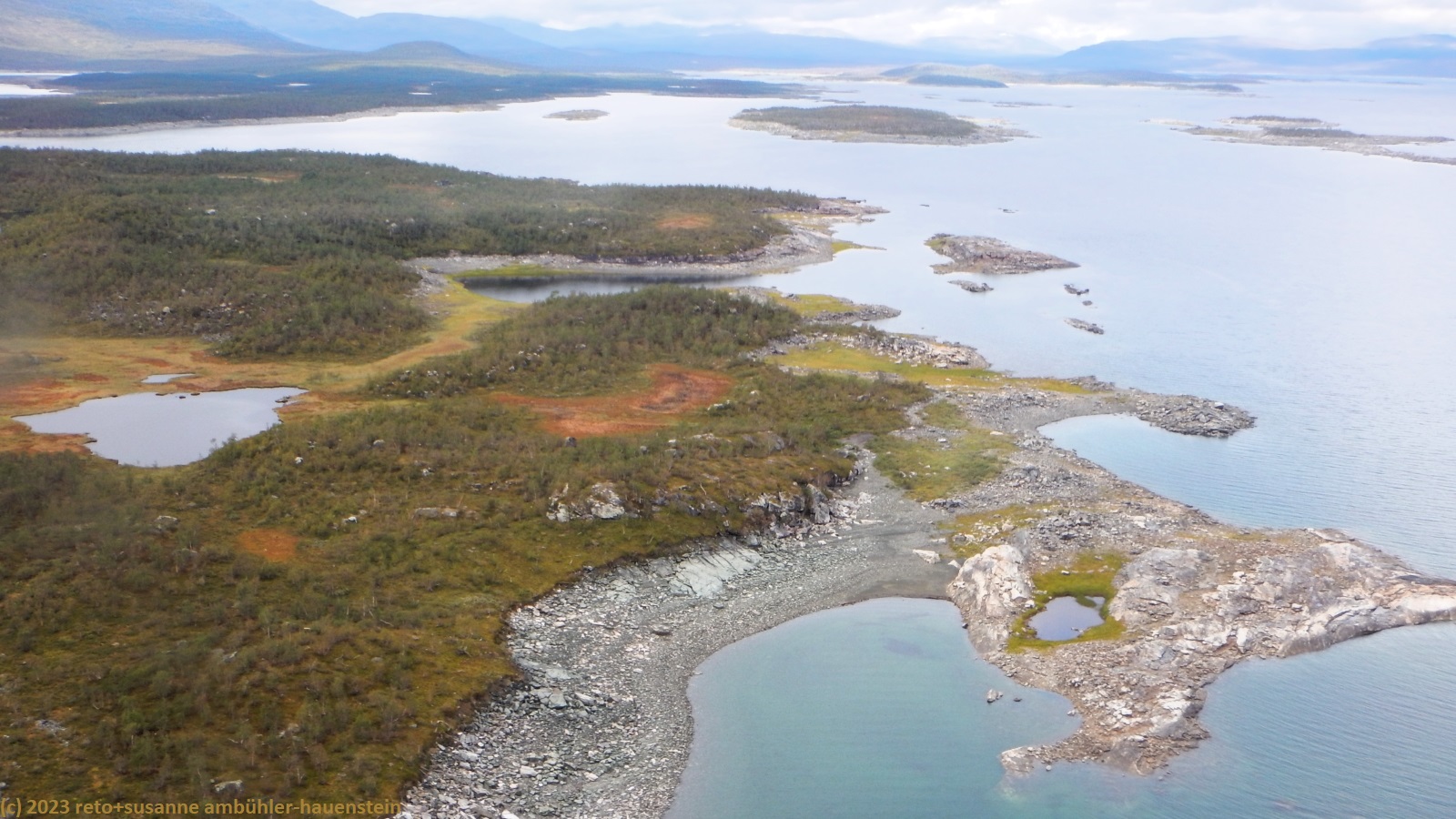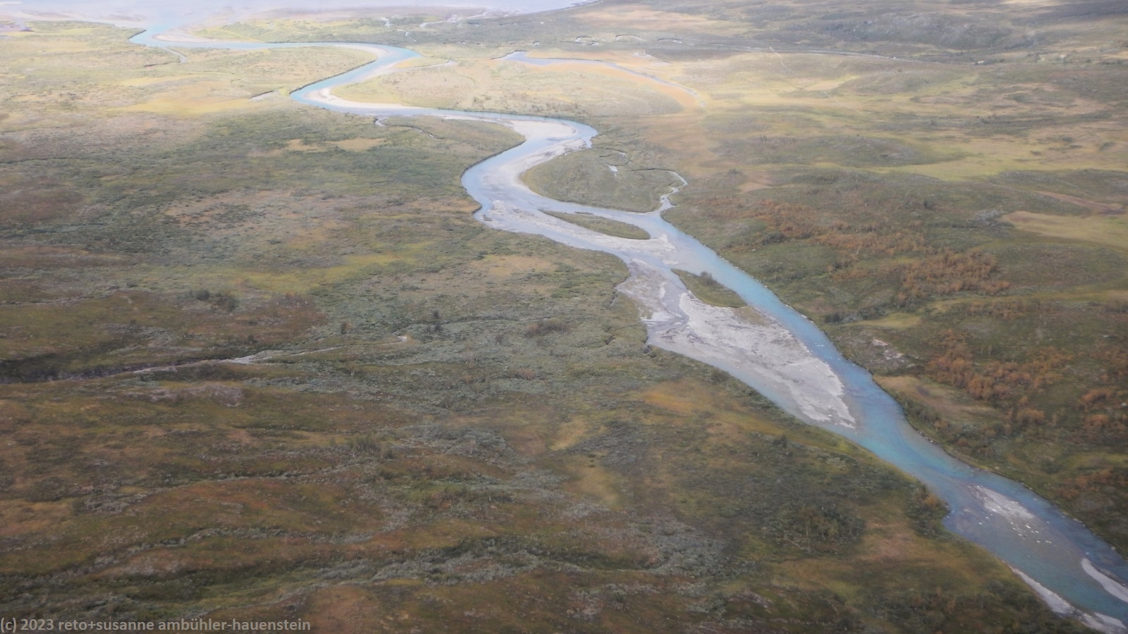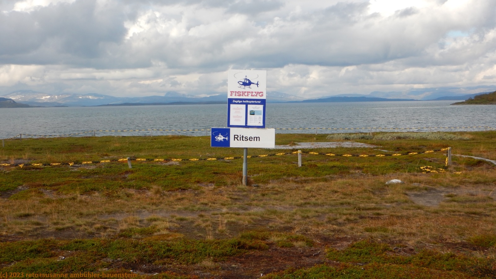 wir geniessen das mittagessen im freien, dann warten wir auf den heli. dieser kommt mit einigen minuten verspätung. wir erfahren, dass der flug gestern gar nicht wegen dem wind, sondern wegen nebel um 2.5h verspätet war. dies bleibt uns heute glücklicherweise erspart. zusammen mit einer flughelferin, zwei schwedinnen und uns als passagiere heben wir um 13:35 uhr ab. wie gewohnt fliegt der heli sehr tief. noch einmal haben wir gelegenheit, die tolle landschaft zu sehen, nun aus der vogelperspektive. bei einer kleinen siedlung am ufer des kutjaure machen wir eine zwischenlandung, um zwei pakete aufzunehmen. das wetter ist weiterhin recht freundlich, wenn auch ziemlich wolkig. um 14:15 uhr landen wir in ritsem.