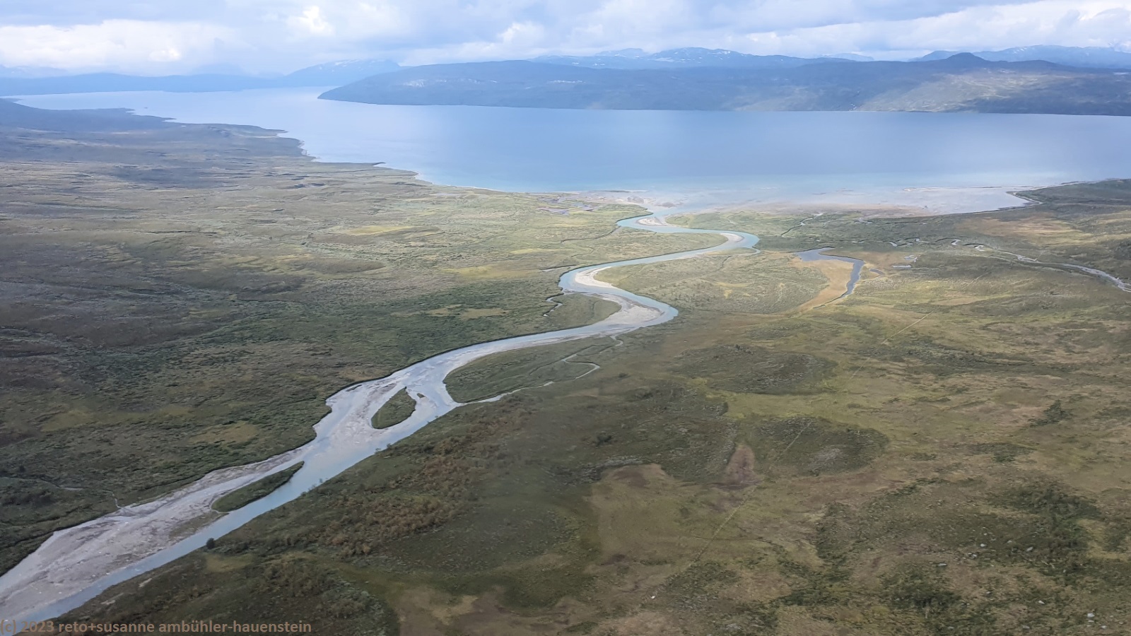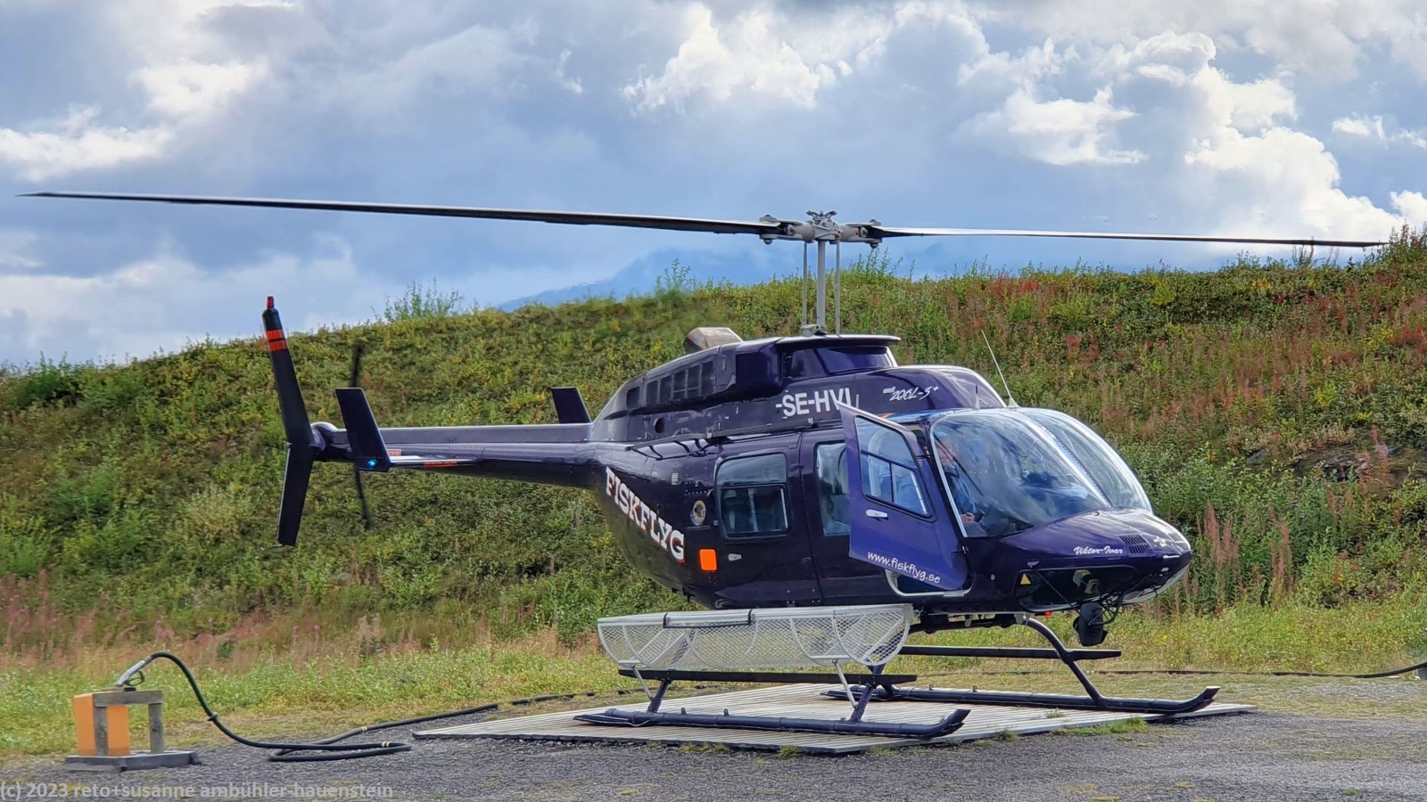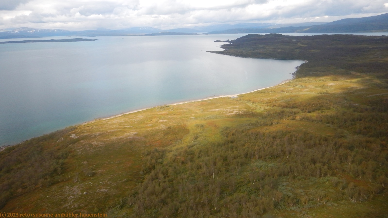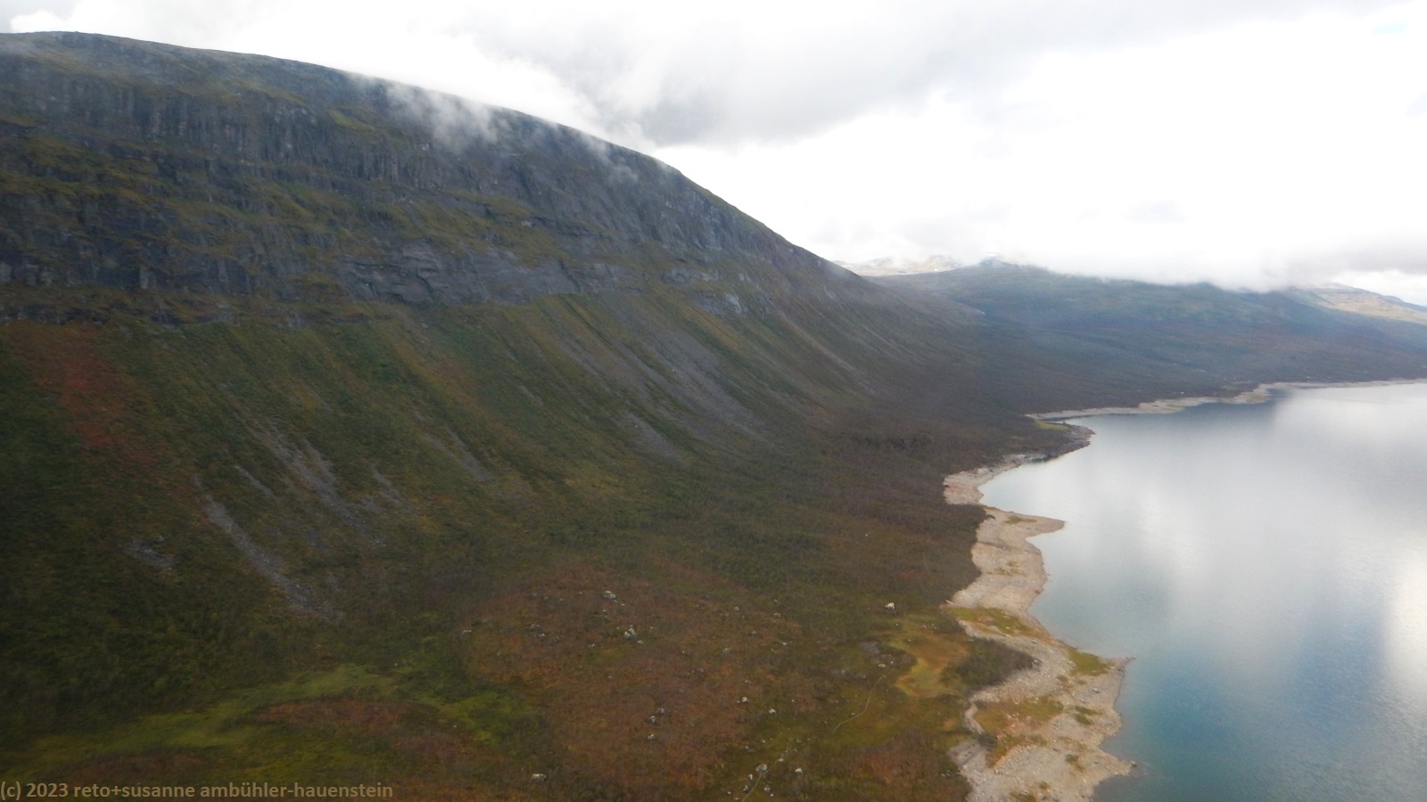 wir geniessen das mittagessen im freien, dann warten wir auf den heli. dieser kommt mit einigen minuten verspätung. wir erfahren, dass der flug gestern gar nicht wegen dem wind, sondern wegen nebel um 2.5h verspätet war. dies bleibt uns heute glücklicherweise erspart. zusammen mit einer flughelferin, zwei schwedinnen und uns als passagiere heben wir um 13:35 uhr ab. wie gewohnt fliegt der heli sehr tief. noch einmal haben wir gelegenheit, die tolle landschaft zu sehen, nun aus der vogelperspektive. bei einer kleinen siedlung am ufer des kutjaure machen wir eine zwischenlandung, um zwei pakete aufzunehmen. das wetter ist weiterhin recht freundlich, wenn auch ziemlich wolkig. um 14:15 uhr landen wir in ritsem.