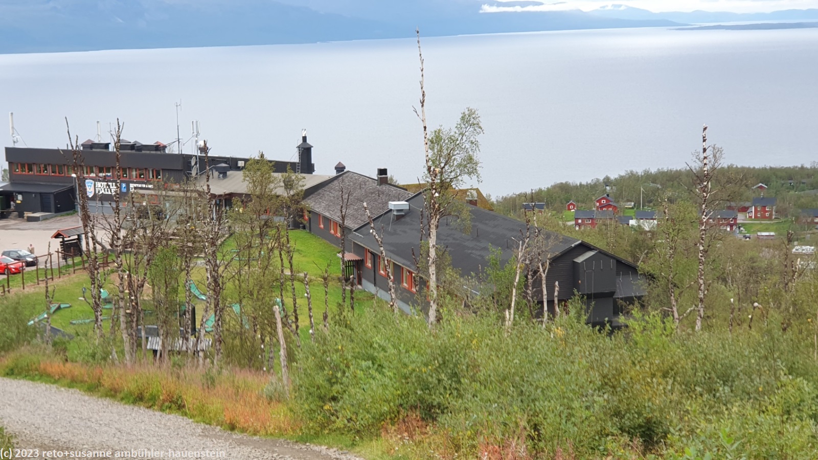 nach dem duschen geniessen wir ein köstliches abendessen im jogi. kurz vor 19 uhr erklimmen wir ein drittes mal heute den aufstieg zum hotel. im verkaufsladen beim eingang telefonieren wir mit unserem jüngsten. wir erfahren, dass zuhause alles in ordnung ist und wir wünschen ihm schöne ferien. etwas später unterhalten wir uns mit unseren anderen zwei kindern und tauschen allerlei neuigkeiten aus. gegen 22 uhr sind wir wieder im jogi. wir erledigen noch diversen kram und schlüpfen kurz nach 23 uhr unter die bettdecke. wenn alles nach plan läuft, war dies unser letzter tag in schweden auf dieser reise, morgen soll es nach norwegen weitergehen.
