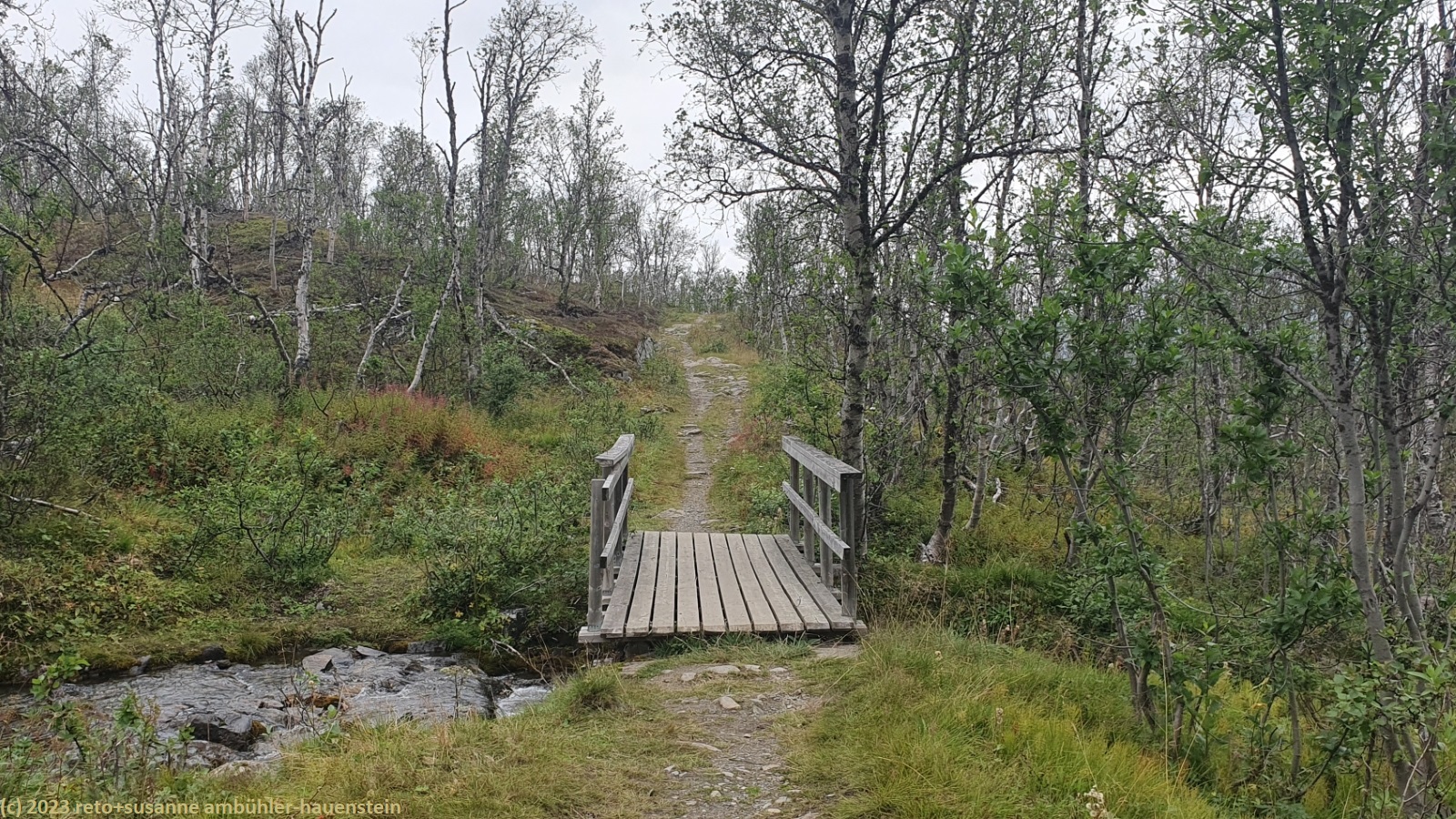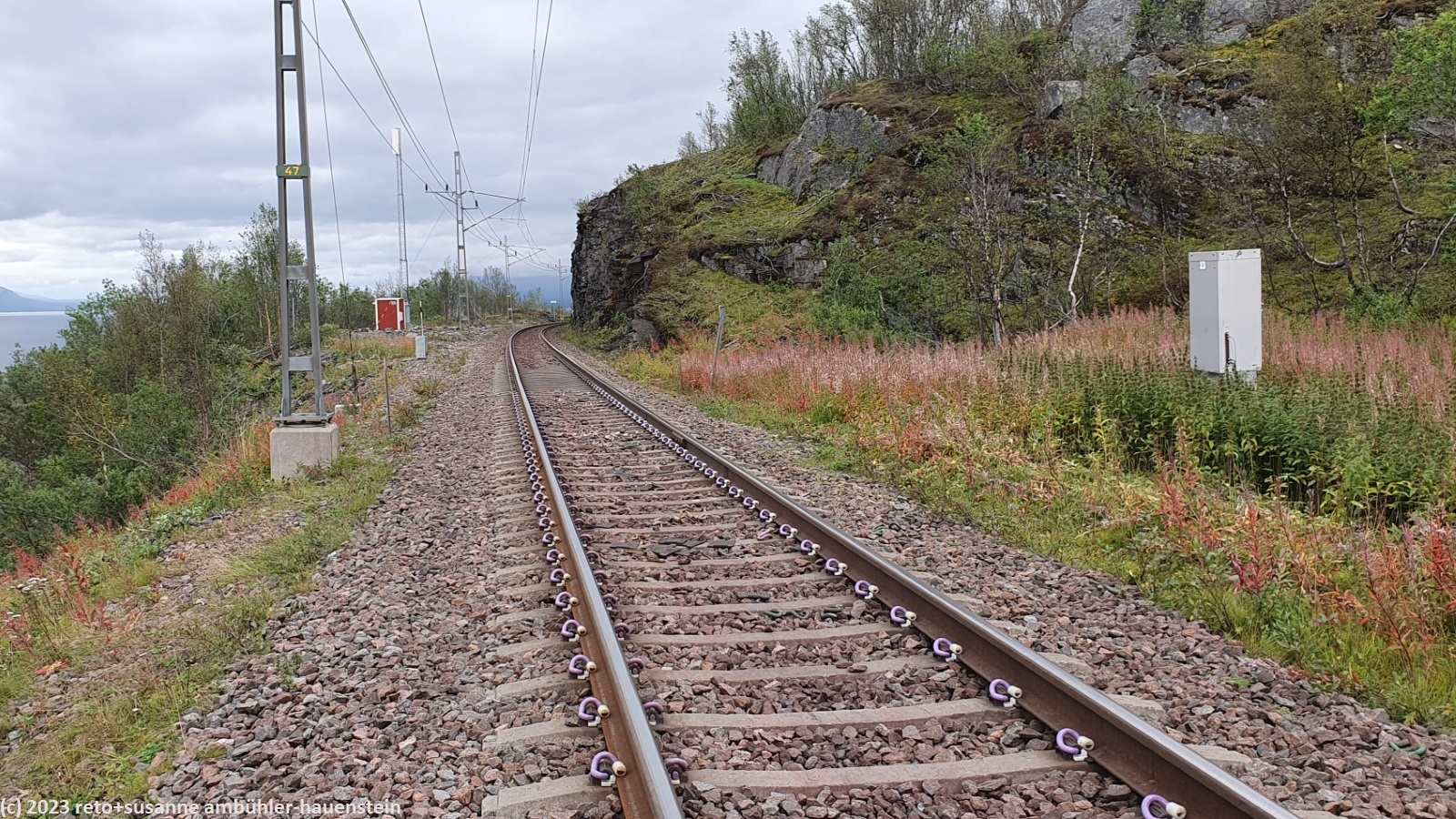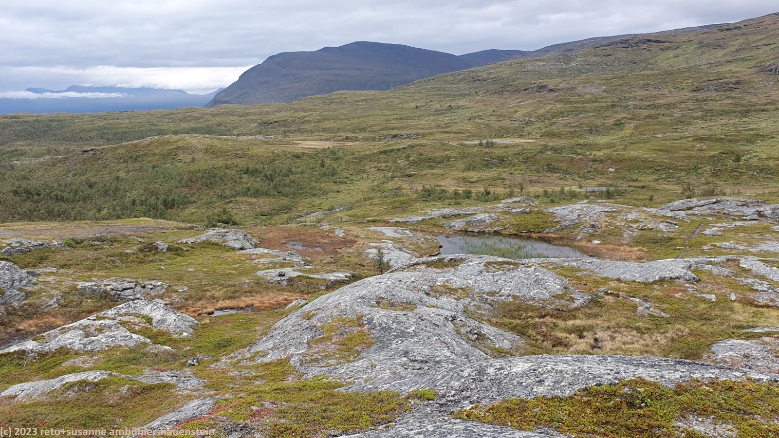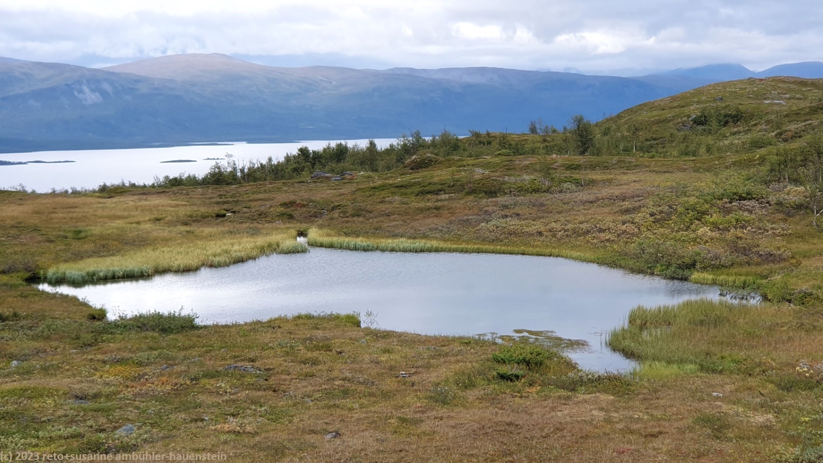 wir schlafen erneut bis kurz vor 9 uhr. in der nacht hat es etwas geregnet, aber nun ist es trocken und das bleibt auch den ganzen tag so. trotzdem ist der himmel grau verhangen und es ist kühl. wir frühstücken daher im jogi. danach erklimmen wir den steilen pfad durch den wald zum fjällhotel hinauf und setzen uns in die lobby. wir nutzen das freie Wi-Fi um emails zu schreiben, vorallem aber, um die nächsten tage zu planen. wir stellen fest, dass manche fähren in norwegen schon bald nicht mehr verkehren. daher müssen wir etwas schneller reisen als gewünscht. für übermorgen buchen wir eine walsafari in andenes. kurz nach mittag kehren wir in unseren jogi zurück und essen etwas. danach starten wir zu einer kleinen rundwanderung. erneut erklimmen wir die steigung zum hotel hinauf und folgen dann einem weg richtung kratersjö. der pfad führt 3 km über das offene fjäll. der kleine see ist zwar ziemlich rund, ist aber wohl kaum ein echter krater. in der kleinen schutzhütte esse ich einen stengel, danach geht es zum grossen torneträsk hinunter. susanne möchte aber nicht dem weg folgen, sondern über die etwas erhöhten felsen talwärts gehen. irgendwann treffen wir dann doch wieder auf den weg. dieser kreuzt wenig später die bahnlinie kiruna - narvik. auf dieser wird vorwiegend eisenerz aus der mine von kiruna transportiert, es gibt aber auch personenzüge. nun folgen wir dem rallervägen zurück nach björkliden. dabei gehen wir zwischen bahnlinie und E6 durch einen schönen wald. beim bahnhof björkliden überqueren wir die geleise und sind direkt beim campingplatz.