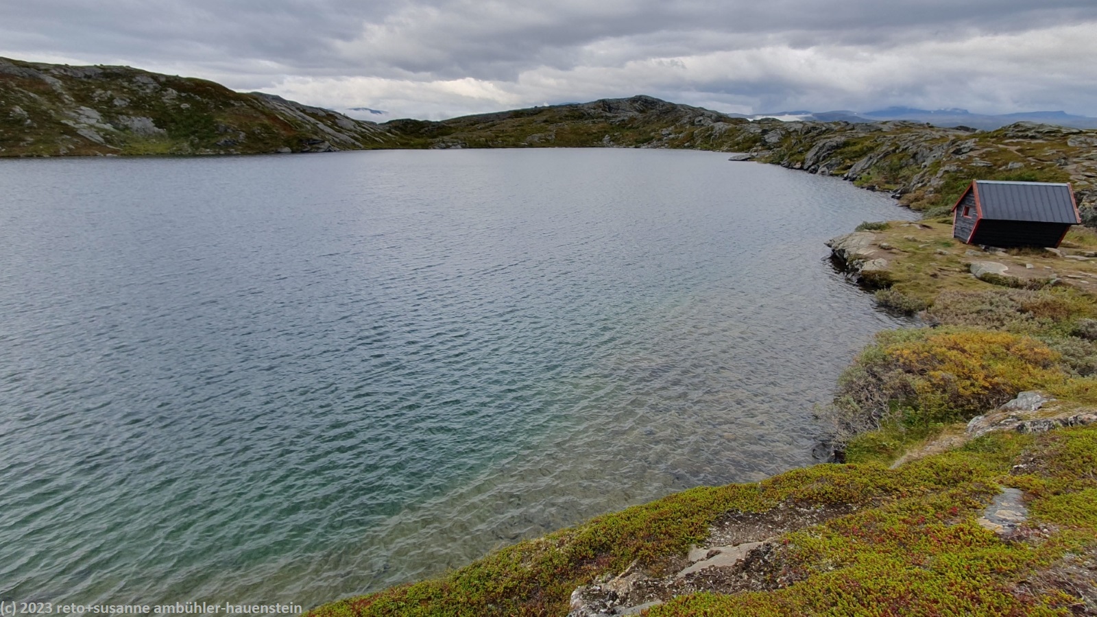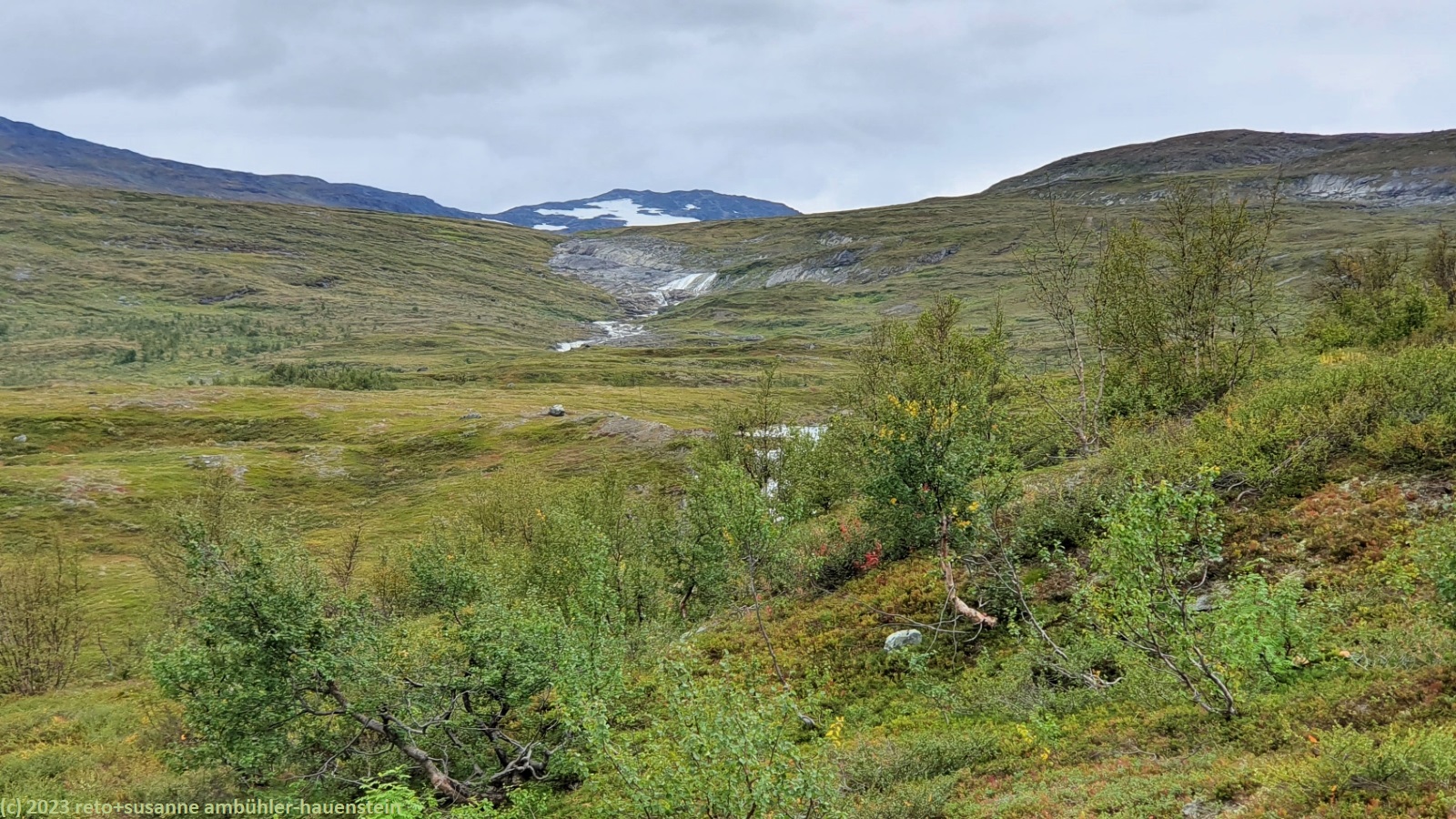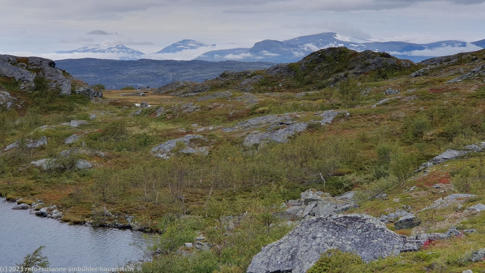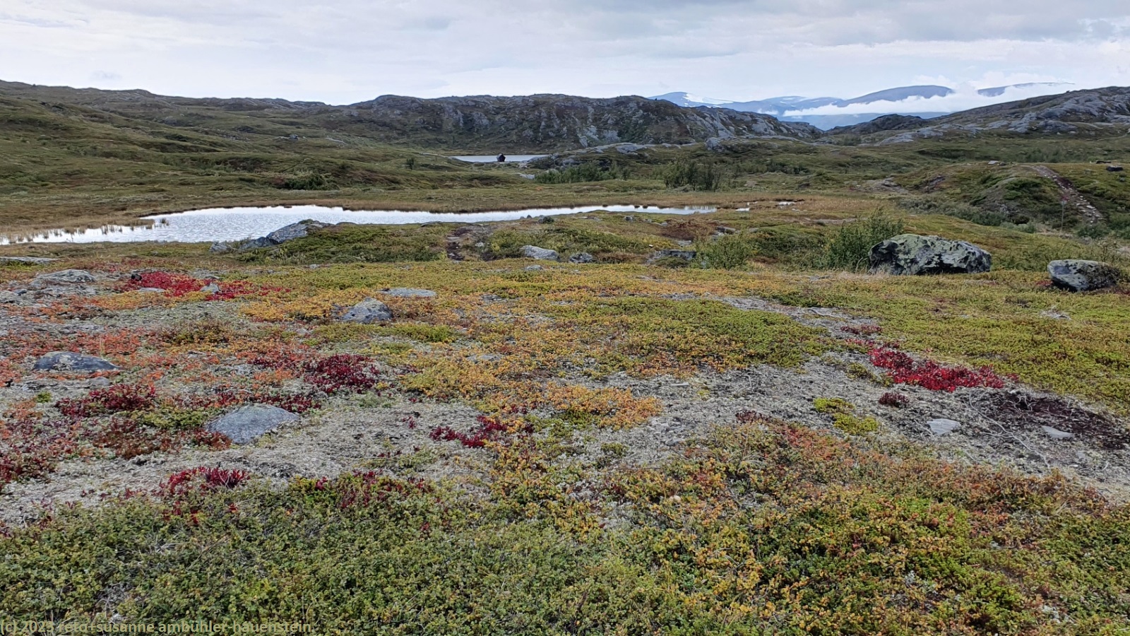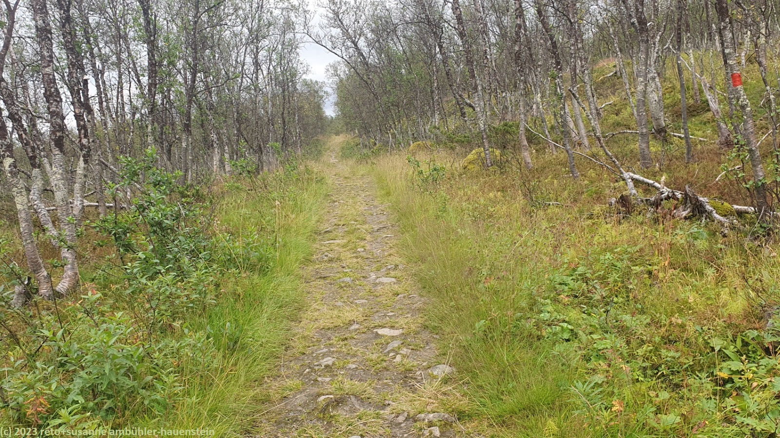 wir schlafen erneut bis kurz vor 9 uhr. in der nacht hat es etwas geregnet, aber nun ist es trocken und das bleibt auch den ganzen tag so. trotzdem ist der himmel grau verhangen und es ist kühl. wir frühstücken daher im jogi. danach erklimmen wir den steilen pfad durch den wald zum fjällhotel hinauf und setzen uns in die lobby. wir nutzen das freie Wi-Fi um emails zu schreiben, vorallem aber, um die nächsten tage zu planen. wir stellen fest, dass manche fähren in norwegen schon bald nicht mehr verkehren. daher müssen wir etwas schneller reisen als gewünscht. für übermorgen buchen wir eine walsafari in andenes. kurz nach mittag kehren wir in unseren jogi zurück und essen etwas. danach starten wir zu einer kleinen rundwanderung. erneut erklimmen wir die steigung zum hotel hinauf und folgen dann einem weg richtung kratersjö. der pfad führt 3 km über das offene fjäll. der kleine see ist zwar ziemlich rund, ist aber wohl kaum ein echter krater. in der kleinen schutzhütte esse ich einen stengel, danach geht es zum grossen torneträsk hinunter. susanne möchte aber nicht dem weg folgen, sondern über die etwas erhöhten felsen talwärts gehen. irgendwann treffen wir dann doch wieder auf den weg. dieser kreuzt wenig später die bahnlinie kiruna - narvik. auf dieser wird vorwiegend eisenerz aus der mine von kiruna transportiert, es gibt aber auch personenzüge. nun folgen wir dem rallervägen zurück nach björkliden. dabei gehen wir zwischen bahnlinie und E6 durch einen schönen wald. beim bahnhof björkliden überqueren wir die geleise und sind direkt beim campingplatz.
