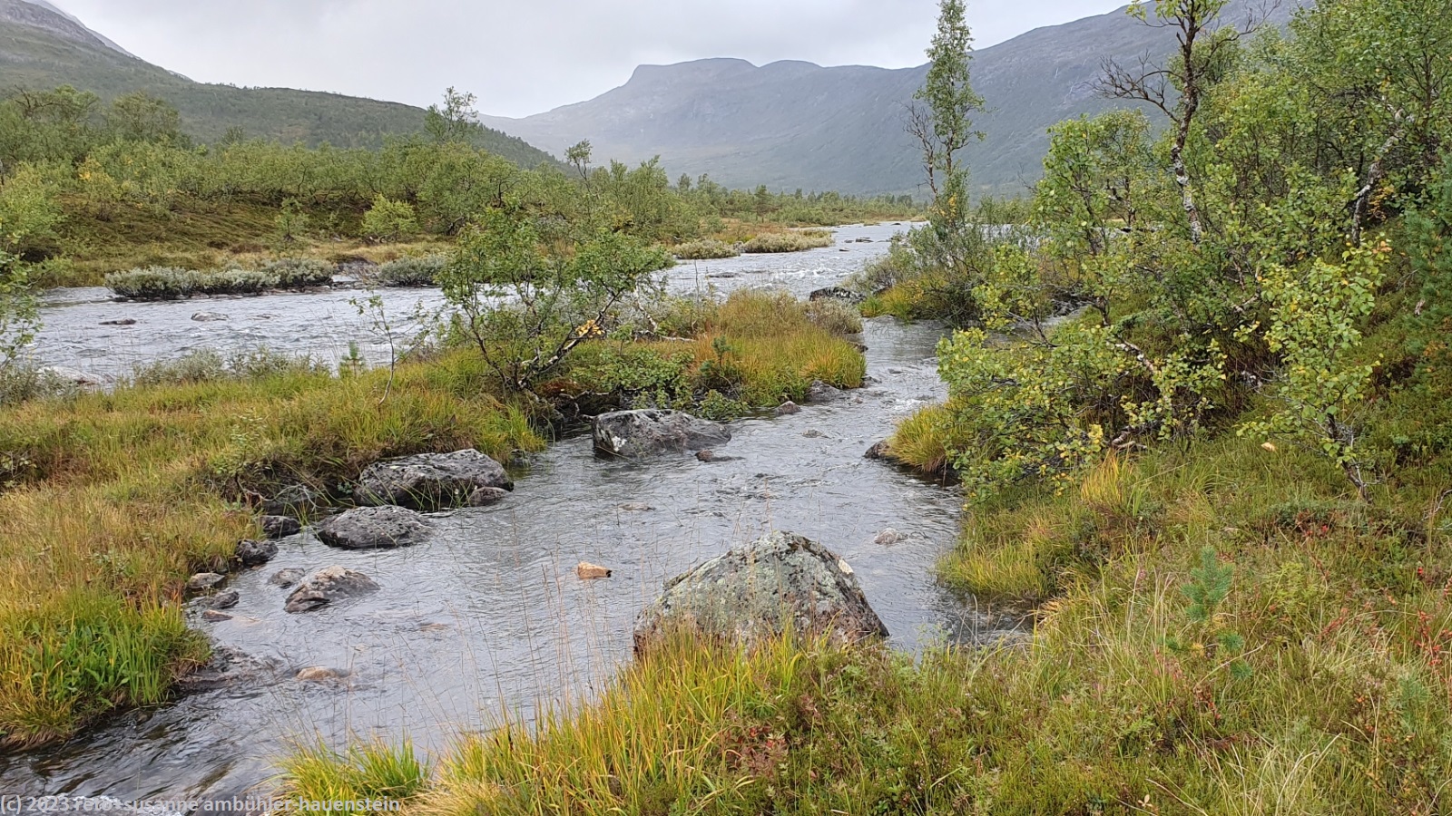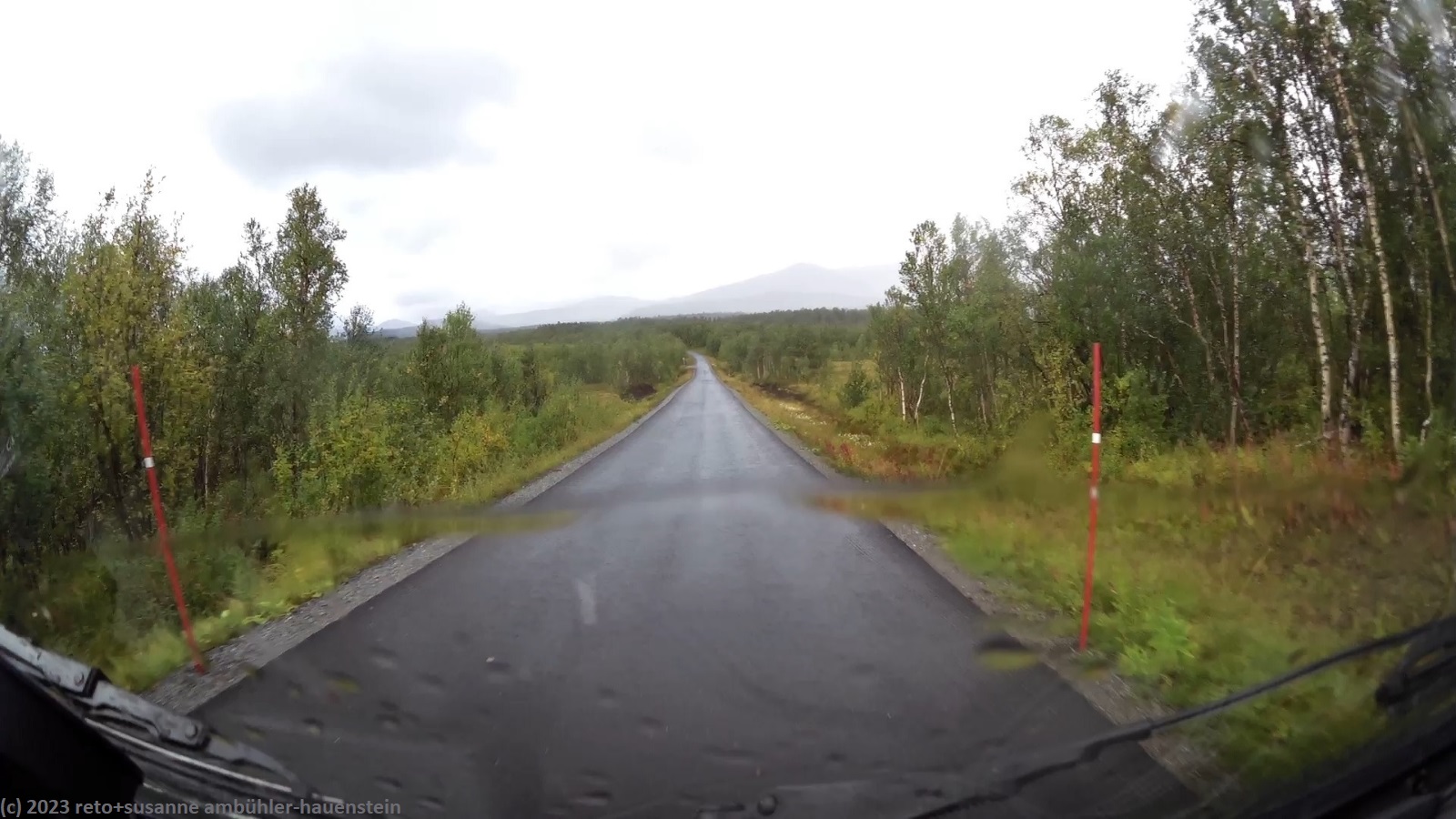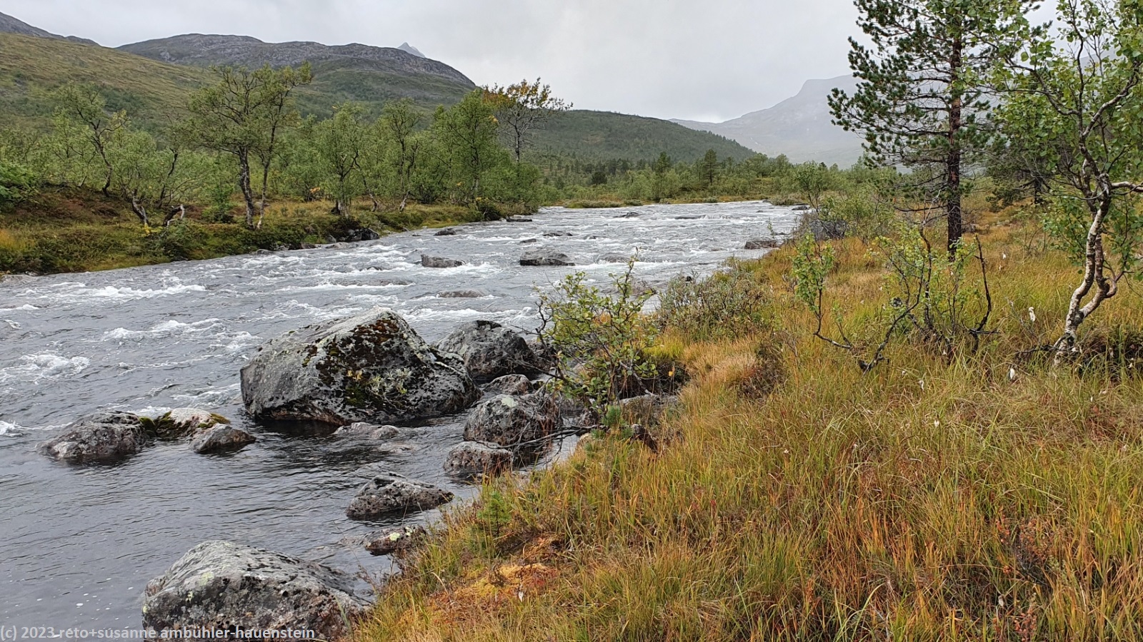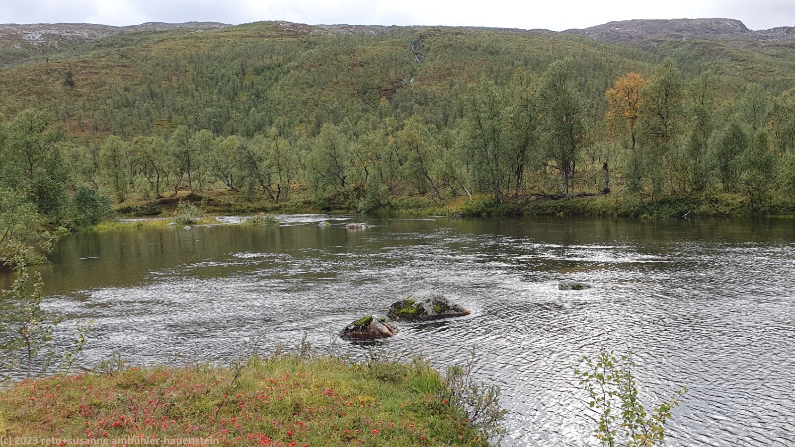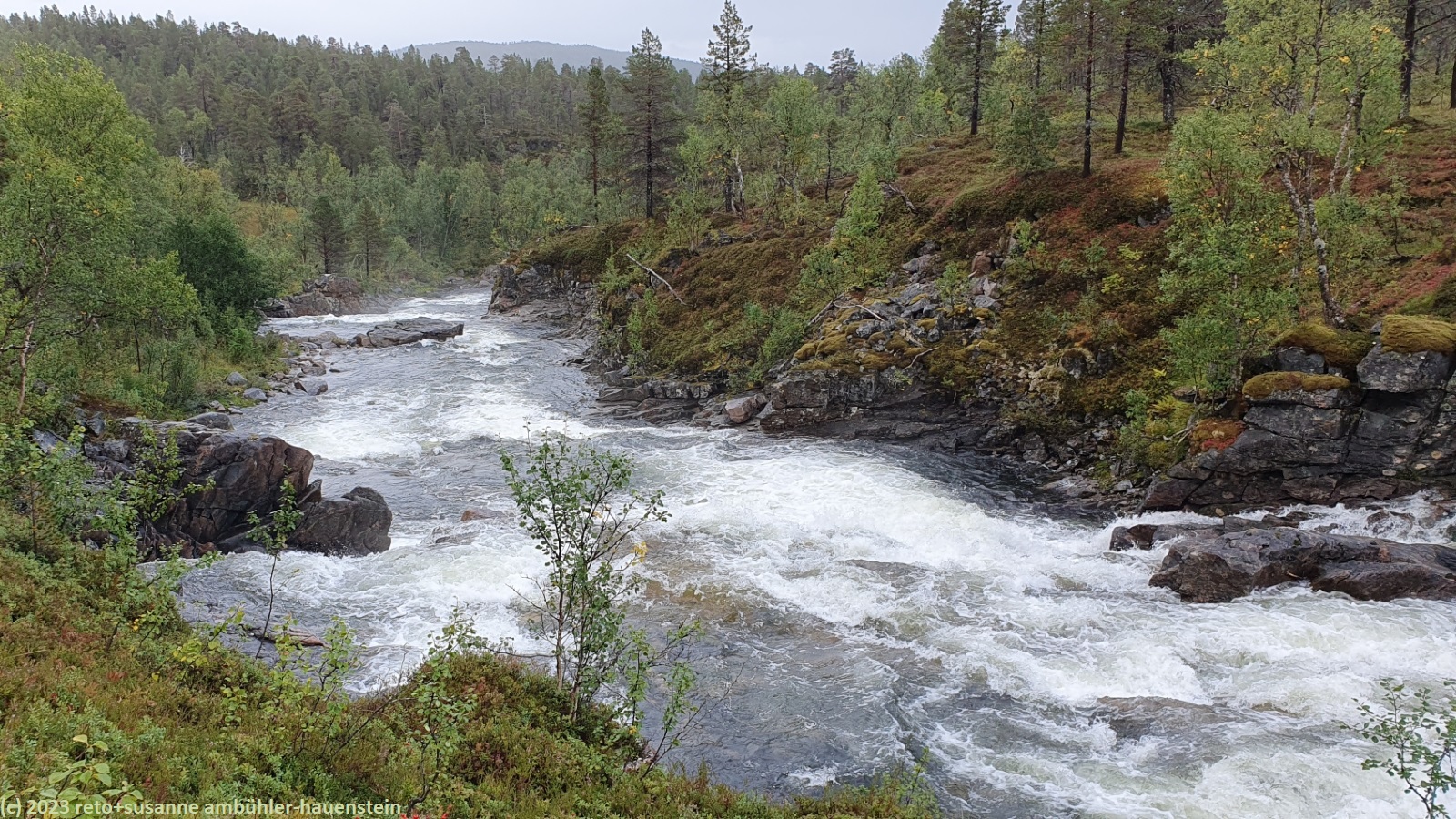 in der hütte sitzt ein junger mann, der kurz aufschaut, als wir den raum betreten und uns dann weitgehend ignoriert. in der hütte hat es drei betten, einen tisch und drei stühle. zwei der letzteren hat der junge mann in beschlag genommen und er macht keine anstalten, einen davon frei zu geben. wir ziehen die schuhe und die nassen kleider aus, setzen uns auf die kleine kommode neben dem bett und geniessen unsere brote aus dem rucksack. der kleine ofen verstrahlt eine unglaubliche wärme. etwa eine halbe stunde nach uns trifft ein deutsches ehepaar ein. auch sie werden vom jungen mann völlig ignoriert. der mann schnappt sich den freien stuhl, die frau setzt sich auf die kommode gegenüber. wir plaudern ein wenig darüber, was wir auf unseren reisen gemacht haben. kurz vor 15:30 uhr ziehen wir unsere regensachen wieder an und machen uns auf den rückweg. die deutschen haben gemeint, der weg am fluss entlang sei sehr schön. dieser ist zwar nicht markiert, aber auf der karte auf meinem navi eingezeichnet. wir finden den pfad und folgen ihm flussabwärts. der ånderelva entleert den åndervatnet, ist erstaunlich breit und führt viel wasser. nach etwa 1.5 km hat es mehrere wasserfälle. der lärm des wassers ist weitherum hörbar. wenig später dreht der pfad vom fluss weg und trifft schon bald auf den weg, auf dem wir gekommen sind. der restliche rückweg führt über ebendiesen. schon vor der mittagspause und am anfang des rückweges gab es je eine längere, trockene phase. nun aber lässt sich der regen ein, genau wie schon gestern nachmittag. um 17:30 uhr sind wir wieder beim jogi.