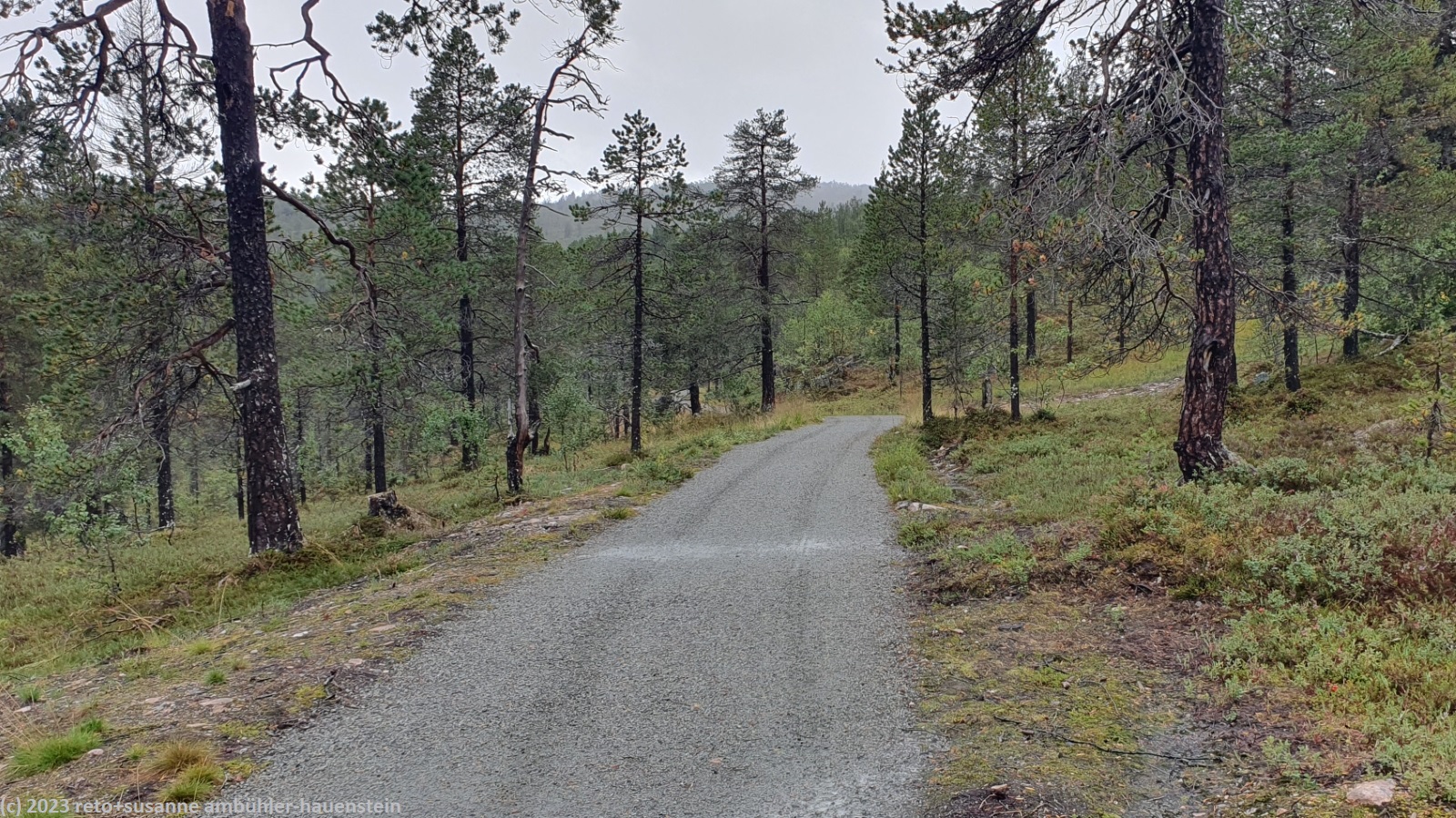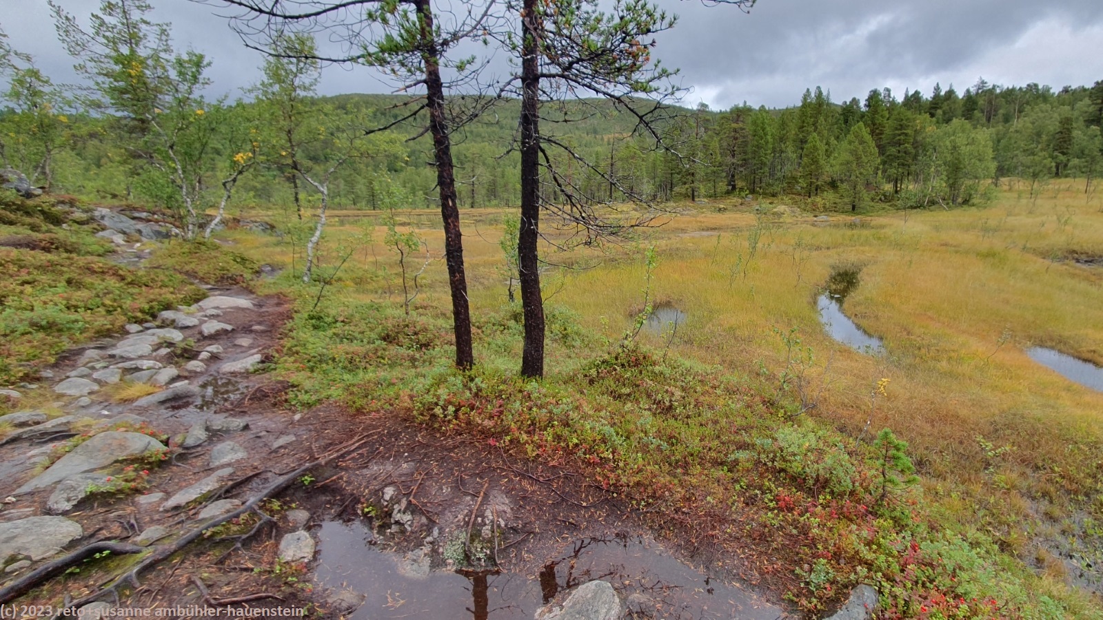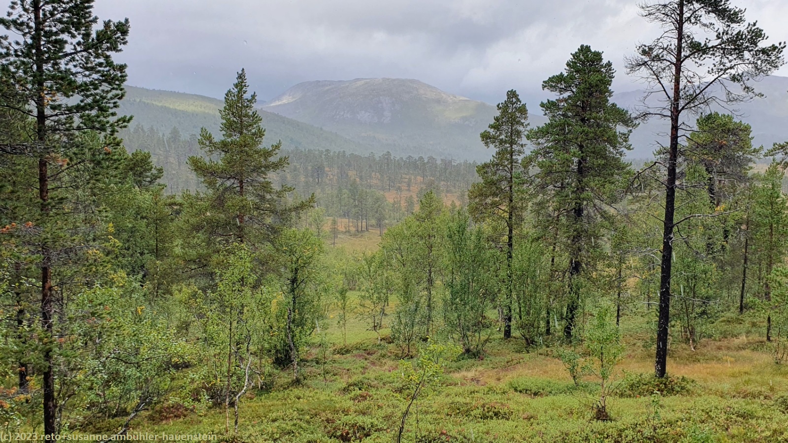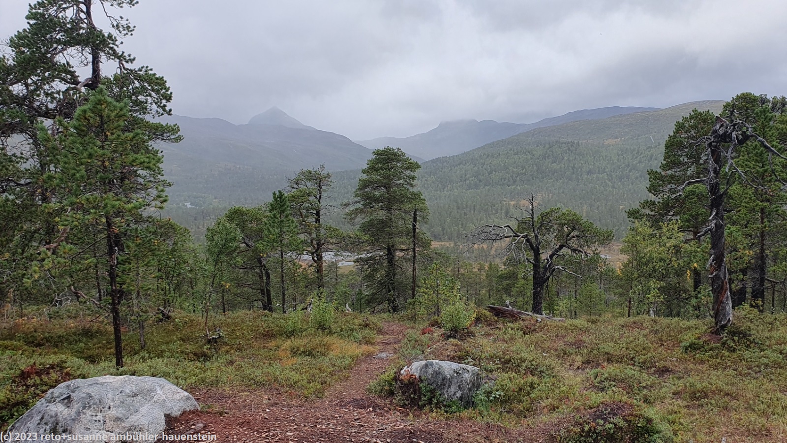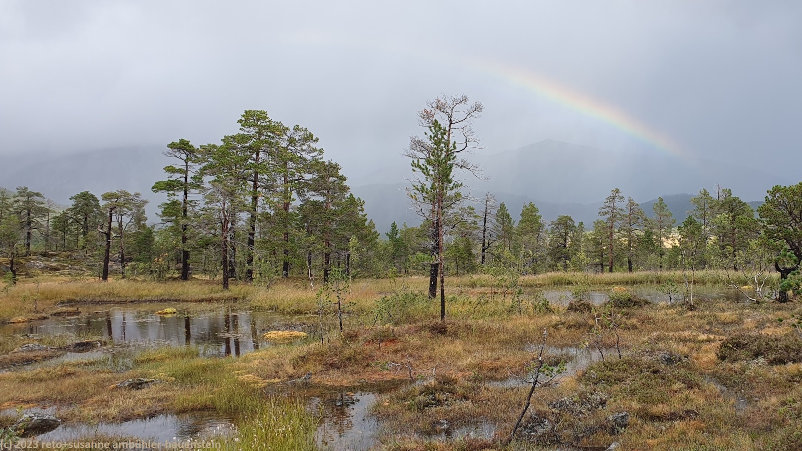 da weiterhin mit viel niederschlag zu rechnen ist, ziehen wir regenhosen und regenjacken an und nehmen unsere kleinen schirme mit. die ersten zwei kilometer des weges sind kinderwagen- und rollstuhltauglich ausgebaut. kurz vor ende des ausgebauten weges hat es eine baustelle. hier entsteht offenbar ein haus für den nationalpark. nun ist der weg bedeutend holpriger. wir machen einen abstecher zum utkikkdpunkt ånderdalen. der pfad ist stellenweise mit holzspänen bedeckt, wohl um die auswirkung der nässe etwas einzudämmen. beim aussichtspunkt hat es einen unterstand. auf grund des wetters ist der ausblick etwas trüb. es wechseln sich zwar trockene und regnerische phasen in unregelmässigen abständen ab, aber hier beim aussichtspunkt schüttet es gerade wieder heftig. das gute an diesem wetter ist, man braucht bloss ein paar minuten zu warten und dann ist auch der heftigste regenguss vorüber. allerdings gilt auch das umgekehrte. ganz selten dringen für ein paar sekunden einige sonnenstrahlen durch die wolkendecke und zaubern einen wunderschönen regenbogen in den himmel. vom aussichtspunkt gehen wir zurück zum wanderweg richtung ândervatnet und folgen diesem westwärts. der pfad ist sehr, sehr nass. glücklicherweise hat es bei den sumpfgebieten holzstege, so bleiben unsere füsse einigermassen trocken. erstaunlicherweise sind trotz des wetters einige leute unterwegs. um 14:30 uhr erreichen wir unser ziel, die schutzhütte am östlichen ufer des åndervatnet.