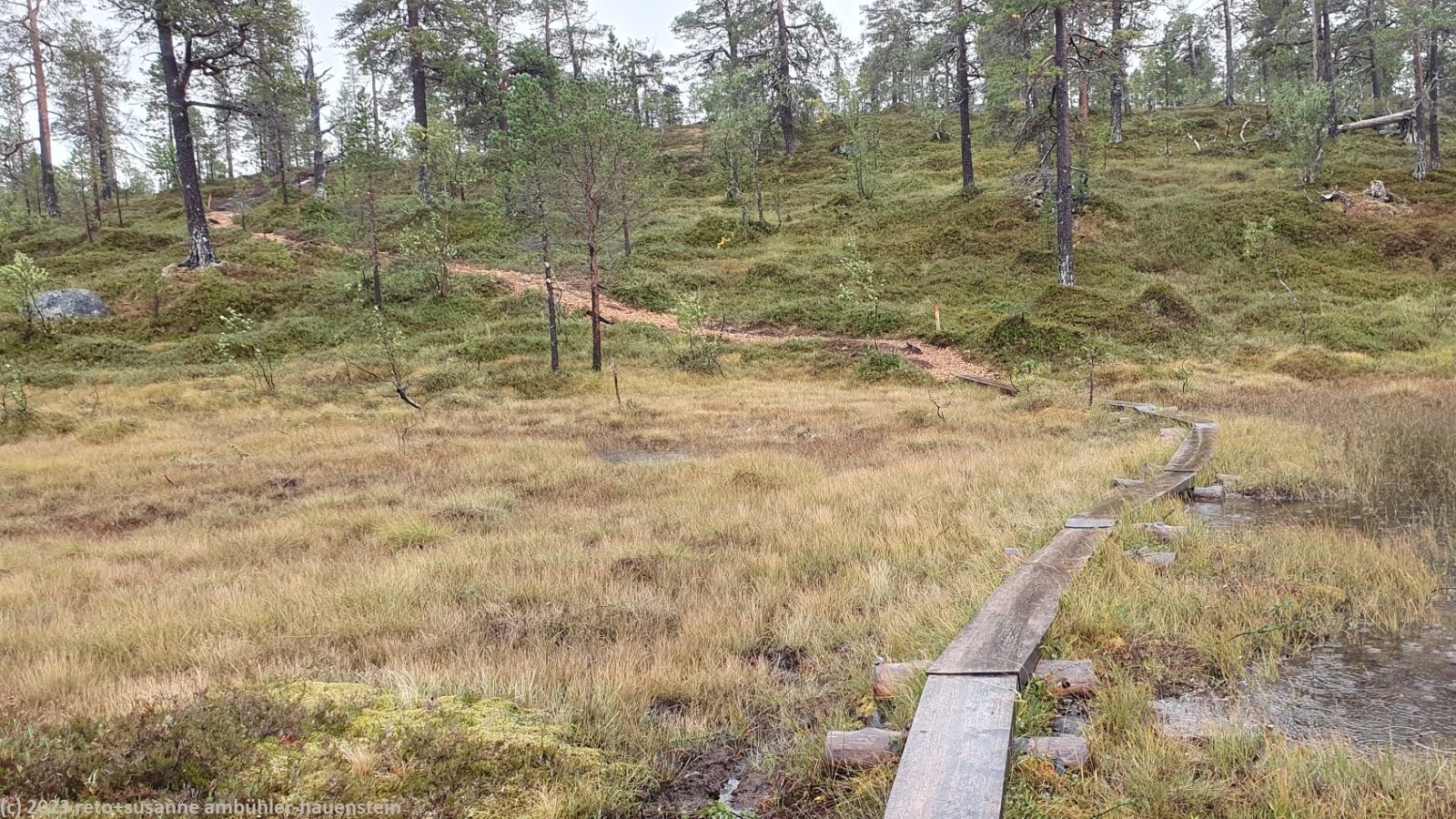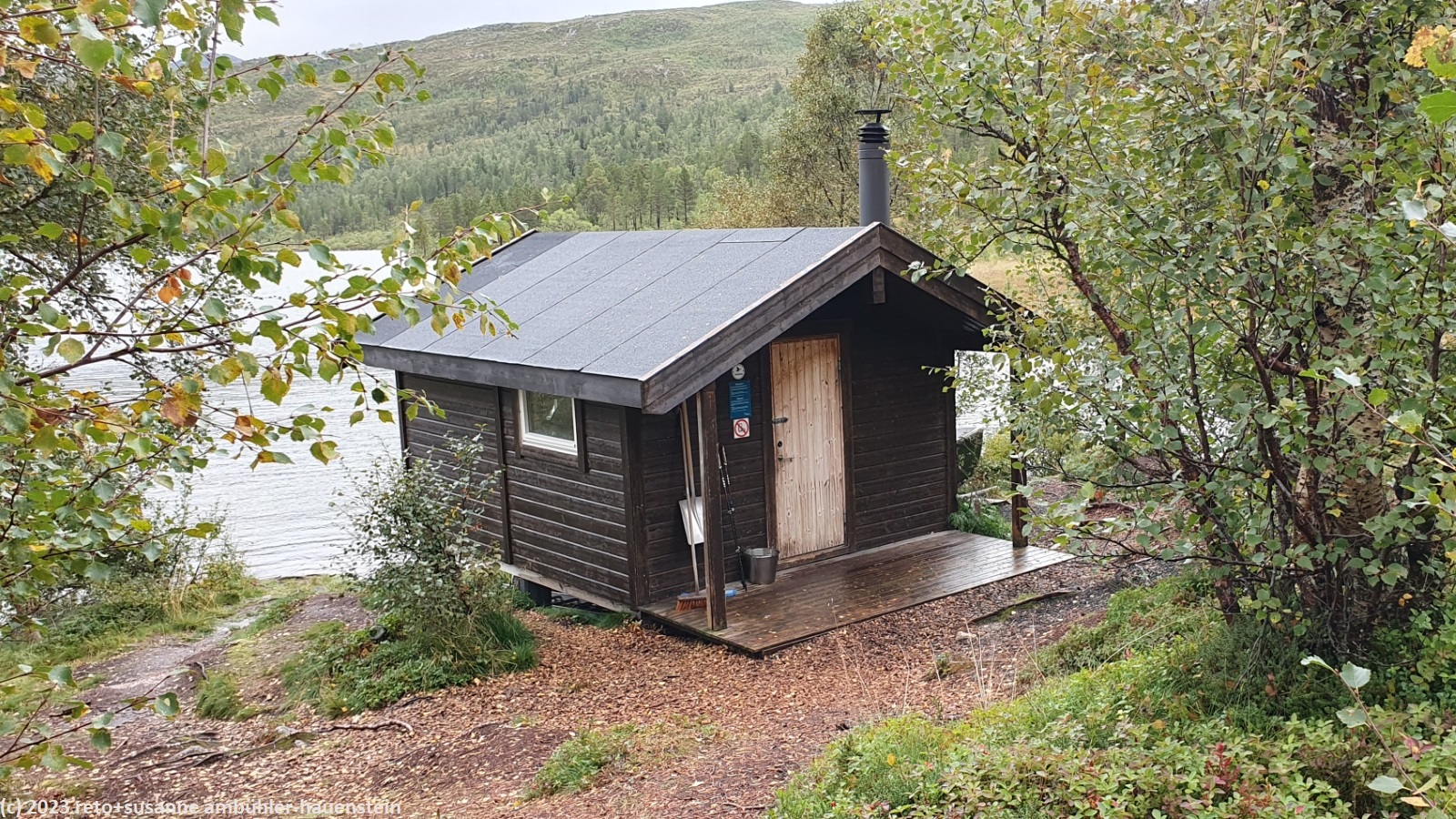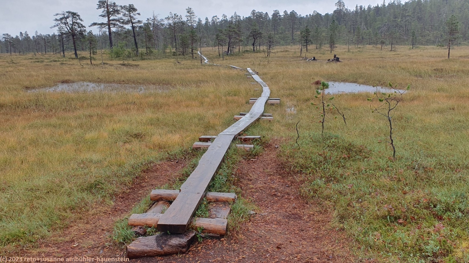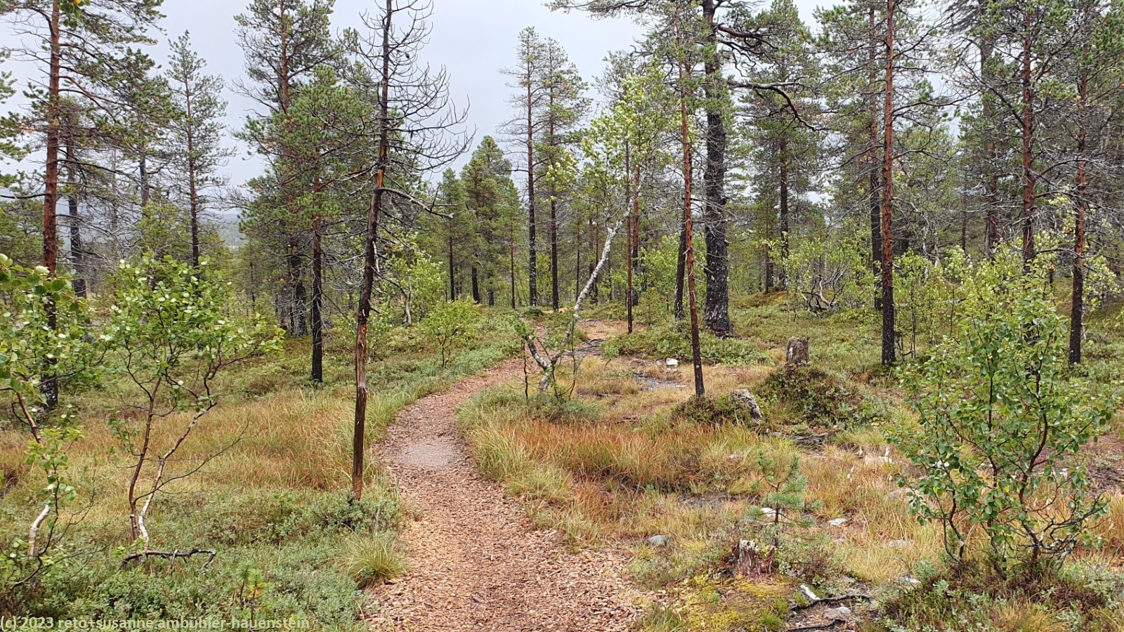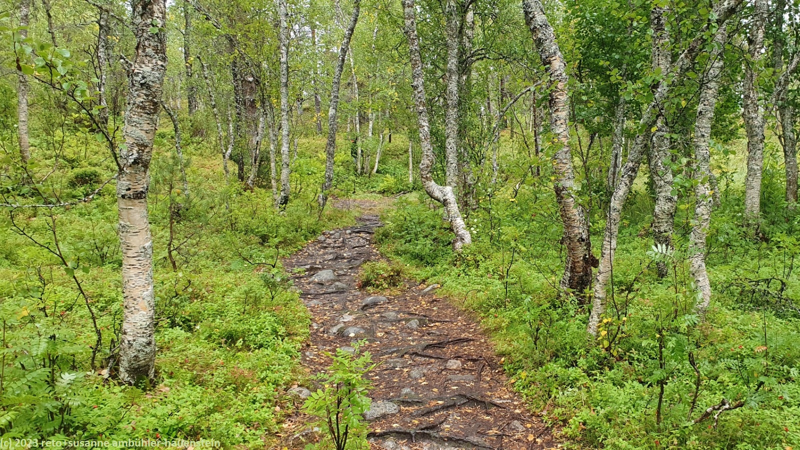da weiterhin mit viel niederschlag zu rechnen ist, ziehen wir regenhosen und regenjacken an und nehmen unsere kleinen schirme mit. die ersten zwei kilometer des weges sind kinderwagen- und rollstuhltauglich ausgebaut. kurz vor ende des ausgebauten weges hat es eine baustelle. hier entsteht offenbar ein haus für den nationalpark. nun ist der weg bedeutend holpriger. wir machen einen abstecher zum utkikkdpunkt ånderdalen. der pfad ist stellenweise mit holzspänen bedeckt, wohl um die auswirkung der nässe etwas einzudämmen. beim aussichtspunkt hat es einen unterstand. auf grund des wetters ist der ausblick etwas trüb. es wechseln sich zwar trockene und regnerische phasen in unregelmässigen abständen ab, aber hier beim aussichtspunkt schüttet es gerade wieder heftig. das gute an diesem wetter ist, man braucht bloss ein paar minuten zu warten und dann ist auch der heftigste regenguss vorüber. allerdings gilt auch das umgekehrte. ganz selten dringen für ein paar sekunden einige sonnenstrahlen durch die wolkendecke und zaubern einen wunderschönen regenbogen in den himmel. vom aussichtspunkt gehen wir zurück zum wanderweg richtung ândervatnet und folgen diesem westwärts. der pfad ist sehr, sehr nass. glücklicherweise hat es bei den sumpfgebieten holzstege, so bleiben unsere füsse einigermassen trocken. erstaunlicherweise sind trotz des wetters einige leute unterwegs. um 14:30 uhr erreichen wir unser ziel, die schutzhütte am östlichen ufer des åndervatnet.