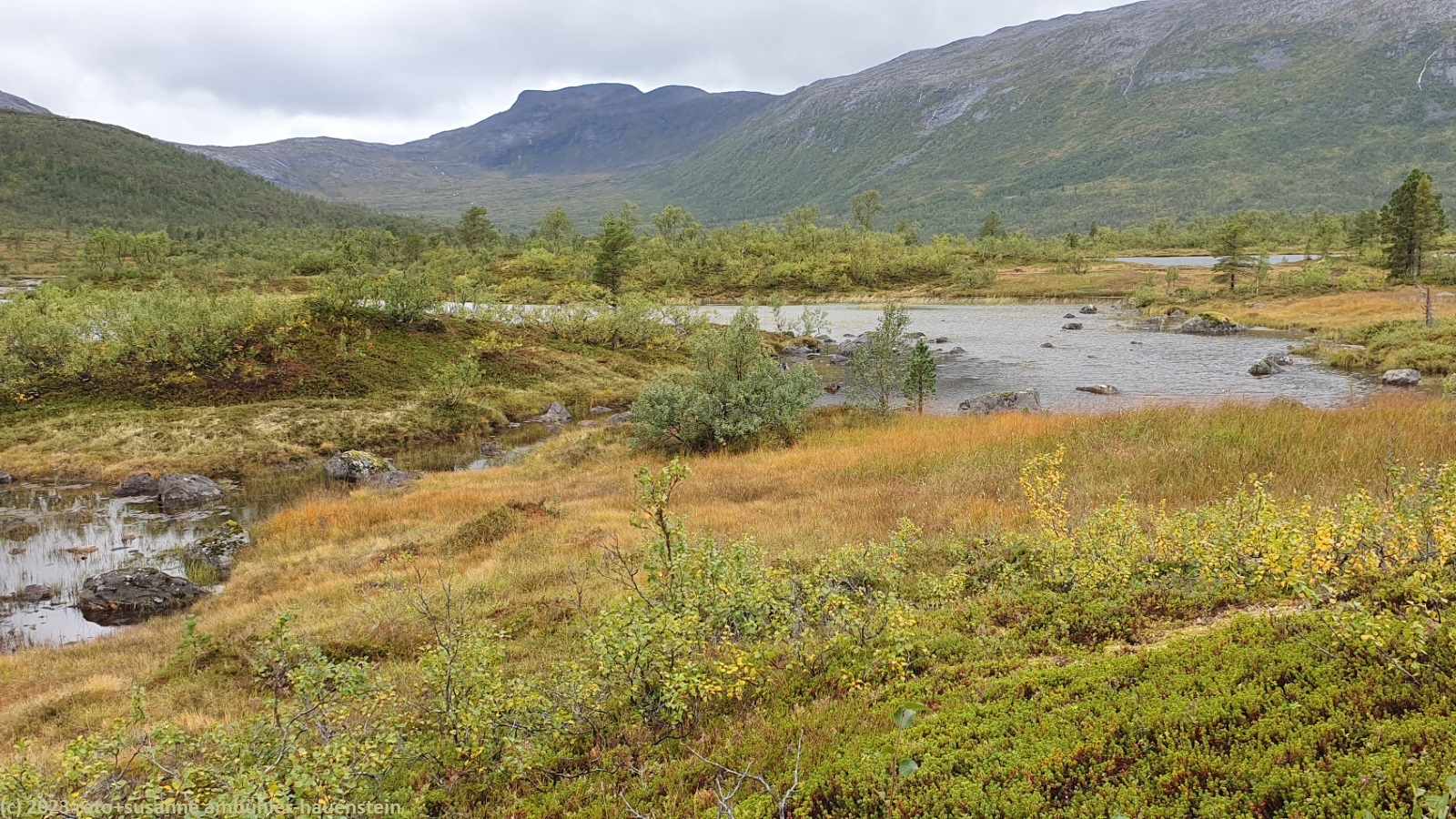 wir schlafen bis 9 uhr. in der nacht hat es erneut immer wieder wie aus kübeln gegossen. als wir erwachen, ist die eine ecke unserer matratze erneut nass. nach dem frühstück fahren wir zum parkplatz des ånderdalen nationalpark, wo unsere heutige wanderung beginnt. wie vorhergesagt, wird es ein sehr regnerischer tag. entsprechend kleiden wir uns. die wanderung zur schutzhütte am östlichen ufer des åndervatnet ist trotz des trüben wetters sehr schön und abwechslungsreich. um 14:30 uhr sind wir am ziel. in der hütte sitzt ein junger mann, welcher uns weitgehend ignoriert. er hat den ofen eingeheizt, es ist sehr warm in dem kleinen raum. wir hängen unsere nassen sachen zum trocknen auf und picknicken. etwa eine halbe stunde nach uns trifft ein weiteres paar ein. auch sie werden vom jungen mann ignoriert. wir unterhalten uns angeregt mit den beiden. kurz vor 15:30 uhr brechen wir wieder auf. auf dem rückweg folgen wir erst ein stück dem ånderelva, dann geht es über den gleichen weg zurück, den wir gekommen sind. um 17:30 uhr sind wir wieder beim jogi. zurück auf dem campingplatz duschen wir, danach geniessen wir das abendessen. den abend verbringen wir in der warmen küche. gegen 23:30 uhr gehen wir zu bett.