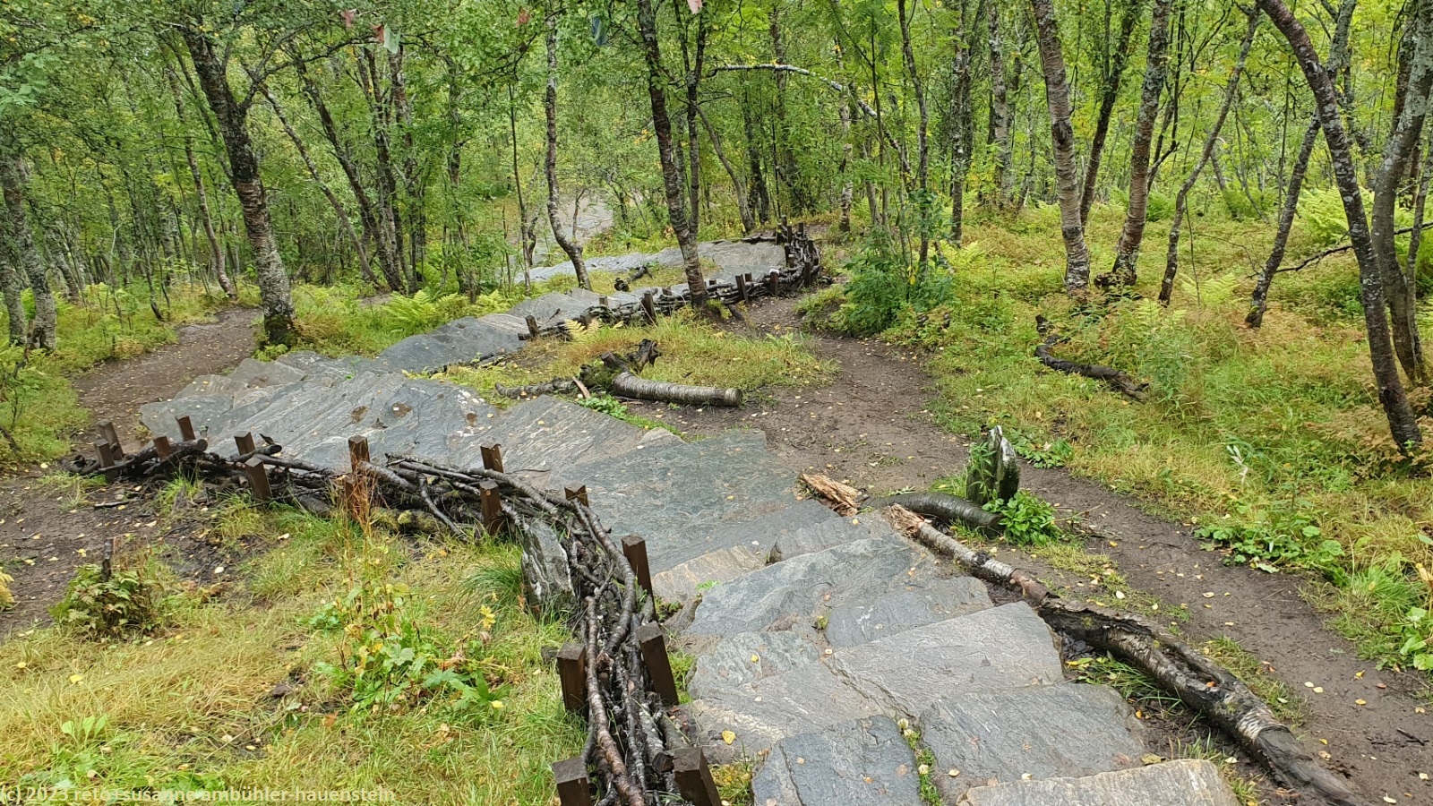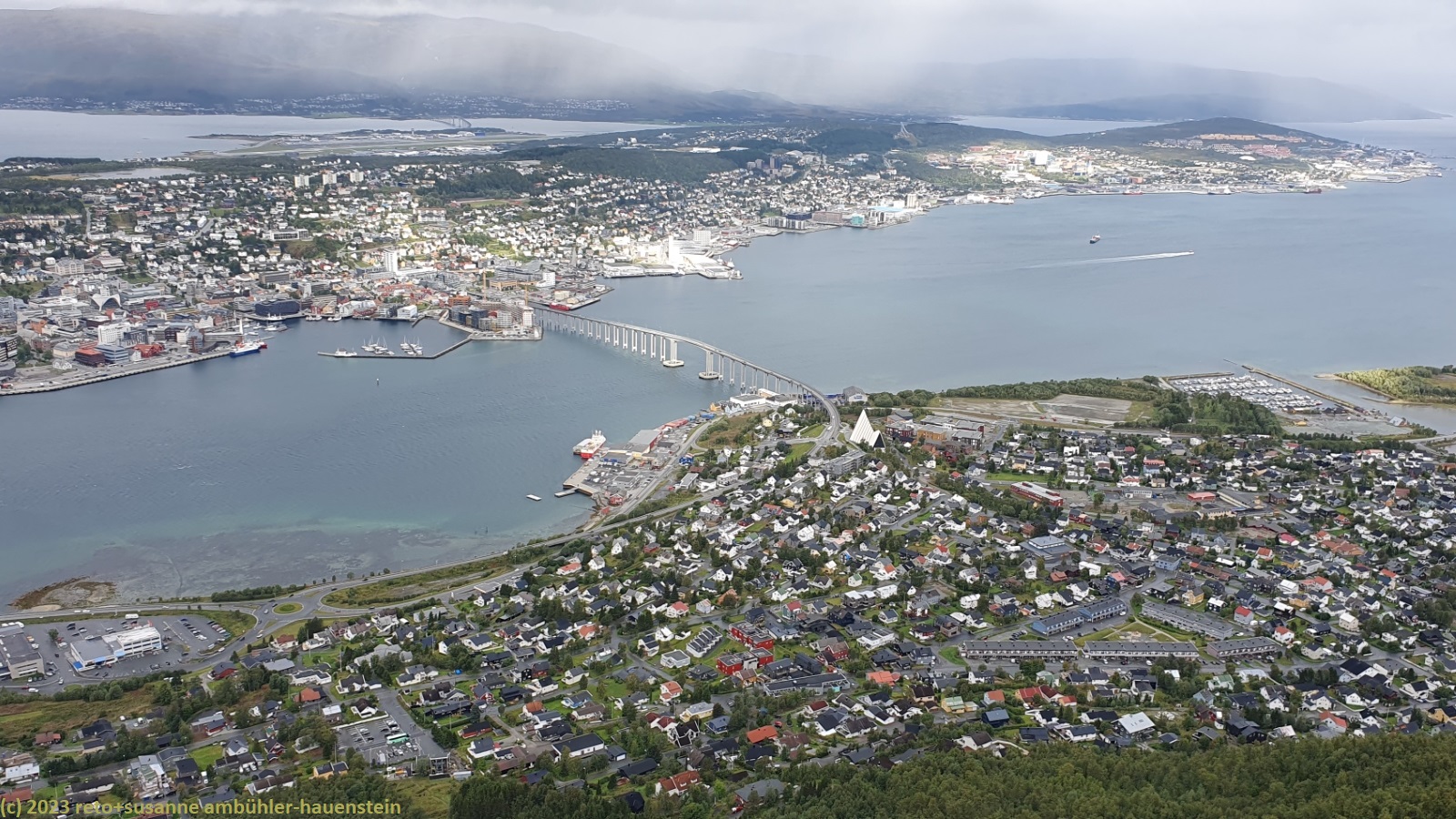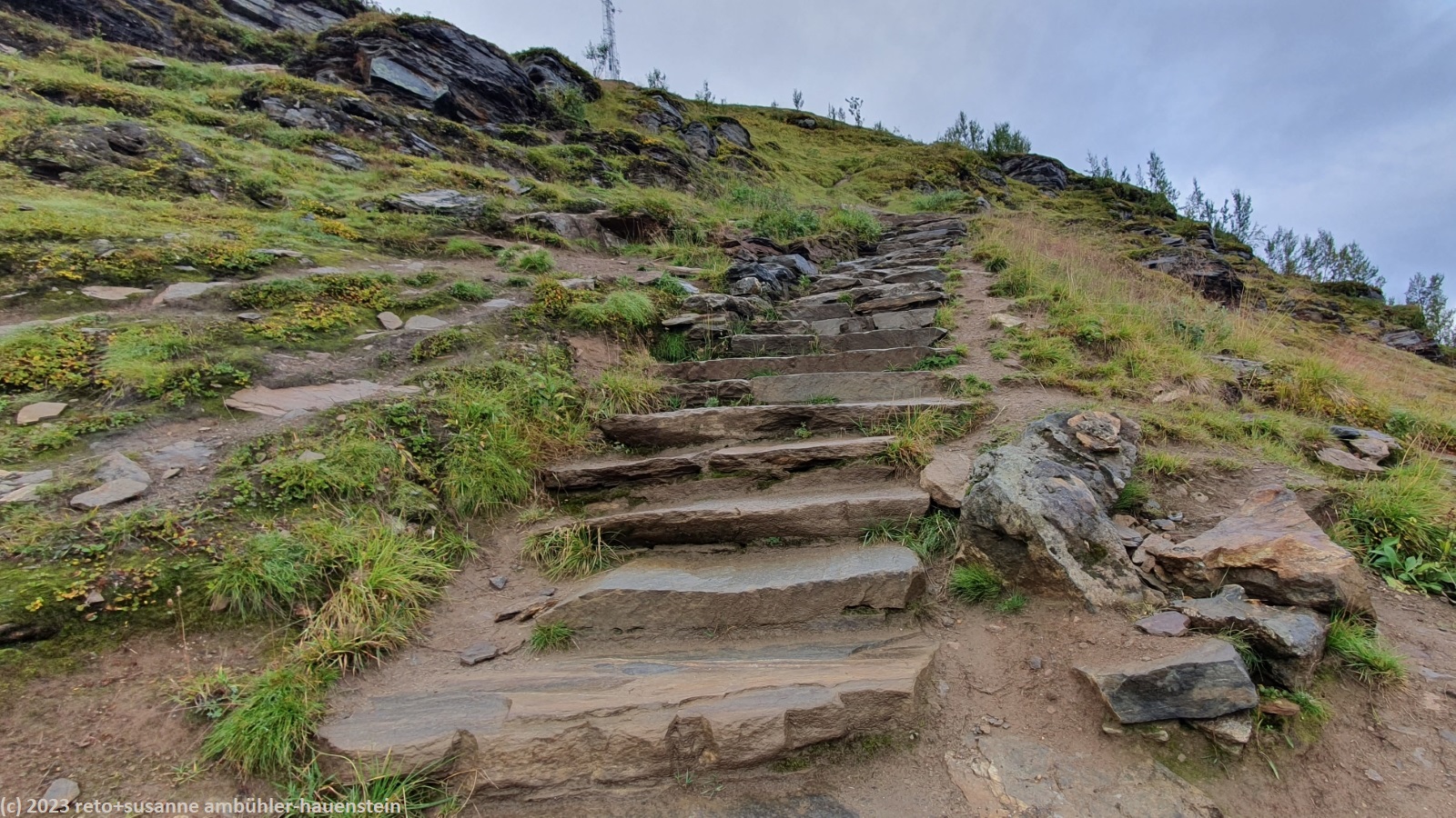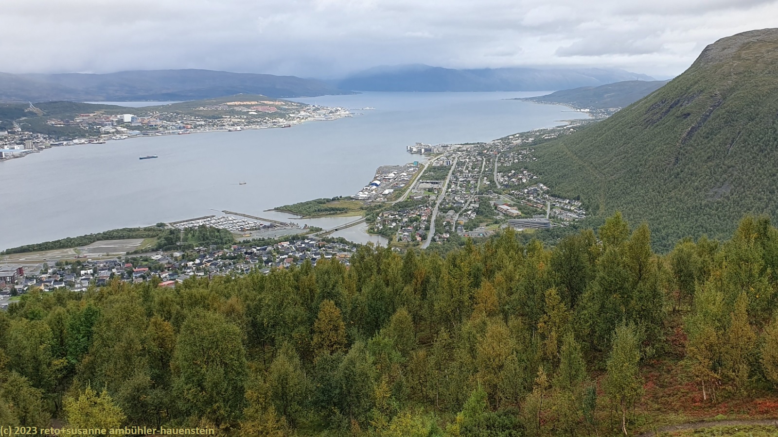 unser handy weckt uns auch heute um 8 uhr. es nieselt immer noch etwas und die temperatur liegt bei 12°C, da frühstücken wir lieber im jogi. gegen 09:45 uhr brechen wir zu unserer kurzwanderung auf. durch ein nettes einfamilienhäuserquartier gelangen wir zum fuss der sherpatrappa. diese führt auf den 400 meter hohen storsteinen hinauf, den hausberg von tromsø. die treppe besteht aus steinen und führt anfangs durch einen schönen, dichten birkenwald. der regen hat inzwischen aufgehört. während dem aufstieg kommen wir ordentlich ins schwitzen, damit haben wir heute nicht gerechnet. bei einer lücke im wald haben wir einen ersten schönen blick auf die stadt. alle hundert stufen ist die anzahl überwundener stufen eingraviert. etwa auf halbem weg kommen wir über die waldgrenze. auf der obersten stufe ist die zahl 1203 eingraviert. bei der bergstation der luftseilbahn hat es ein wunderschönes restaurant. wir stärken uns mit einem tee, bzw. kaffee und einem brötchen.