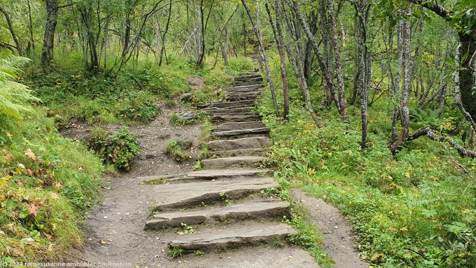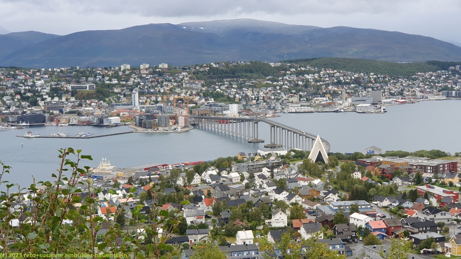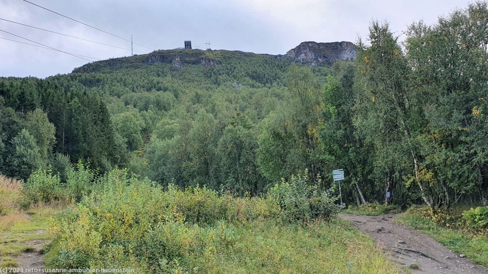 unser handy weckt uns auch heute um 8 uhr. es nieselt immer noch etwas und die temperatur liegt bei 12°C, da frühstücken wir lieber im jogi. gegen 09:45 uhr brechen wir zu unserer kurzwanderung auf. durch ein nettes einfamilienhäuserquartier gelangen wir zum fuss der sherpatrappa. diese führt auf den 400 meter hohen storsteinen hinauf, den hausberg von tromsø. die treppe besteht aus steinen und führt anfangs durch einen schönen, dichten birkenwald. der regen hat inzwischen aufgehört. während dem aufstieg kommen wir ordentlich ins schwitzen, damit haben wir heute nicht gerechnet. bei einer lücke im wald haben wir einen ersten schönen blick auf die stadt. alle hundert stufen ist die anzahl überwundener stufen eingraviert. etwa auf halbem weg kommen wir über die waldgrenze. auf der obersten stufe ist die zahl 1203 eingraviert. bei der bergstation der luftseilbahn hat es ein wunderschönes restaurant. wir stärken uns mit einem tee, bzw. kaffee und einem brötchen.