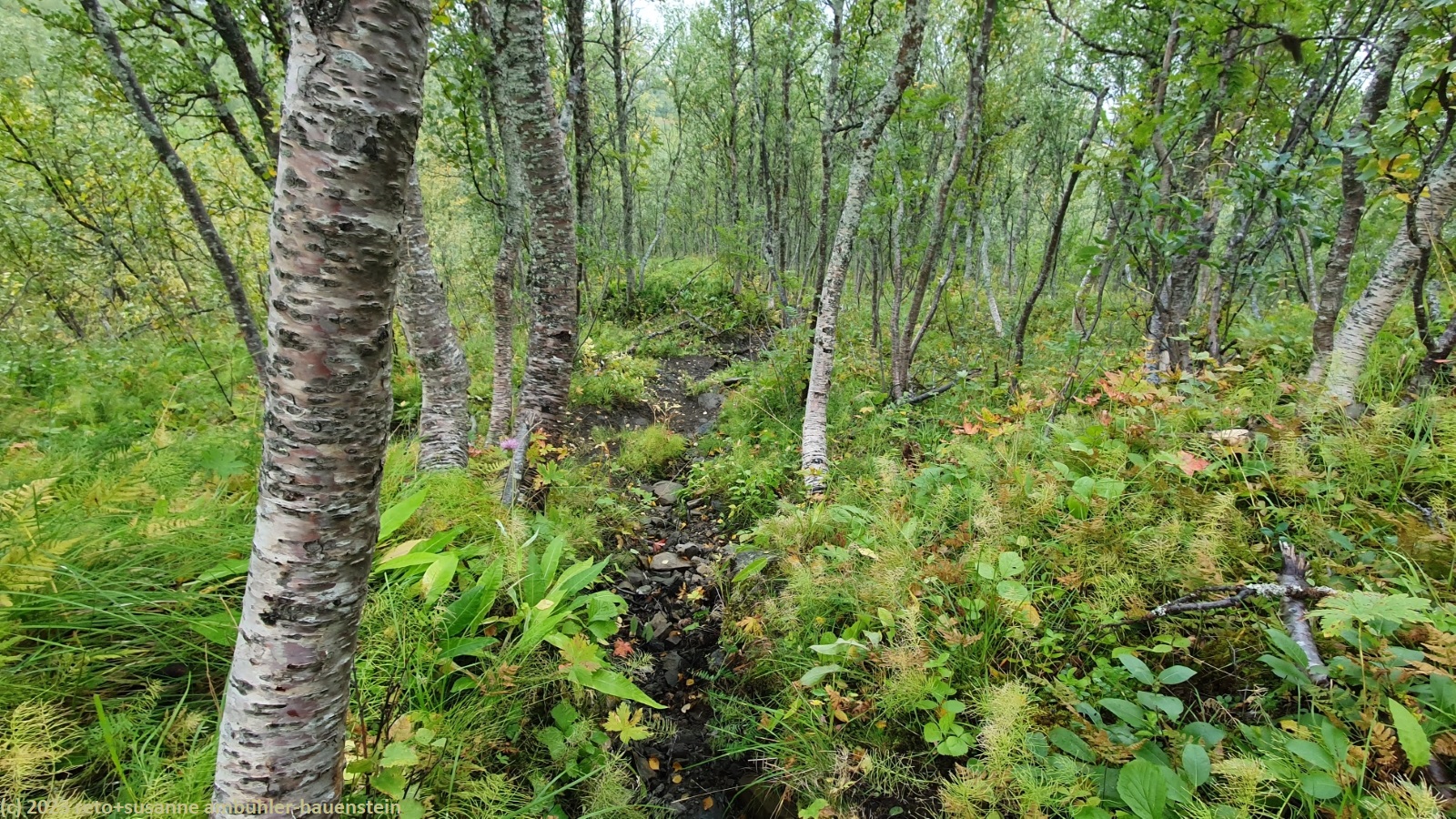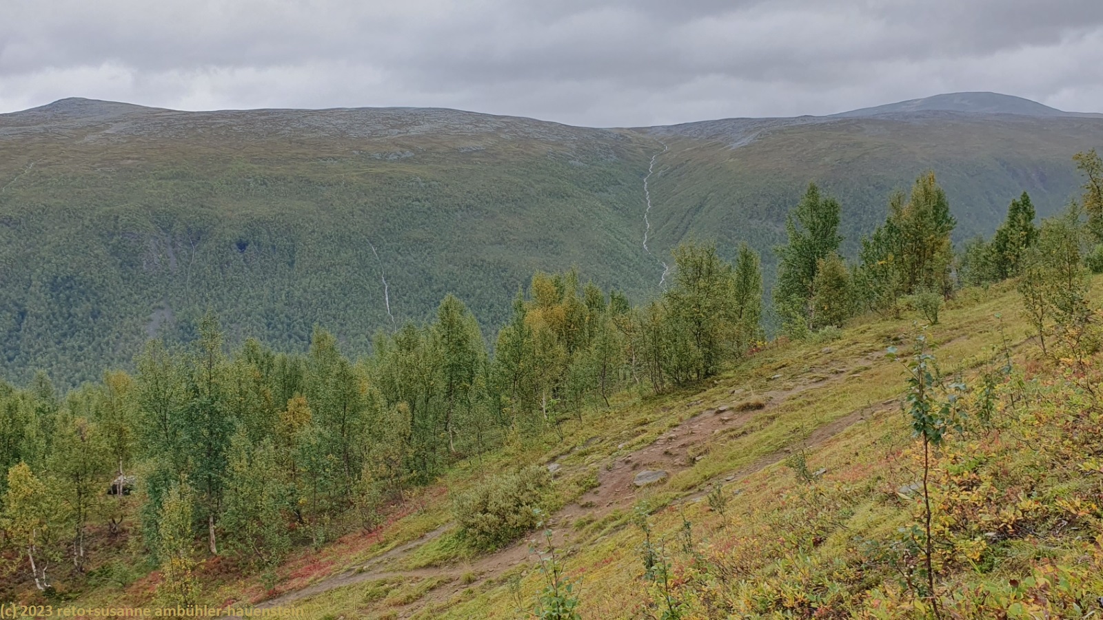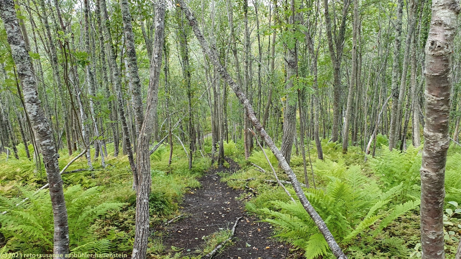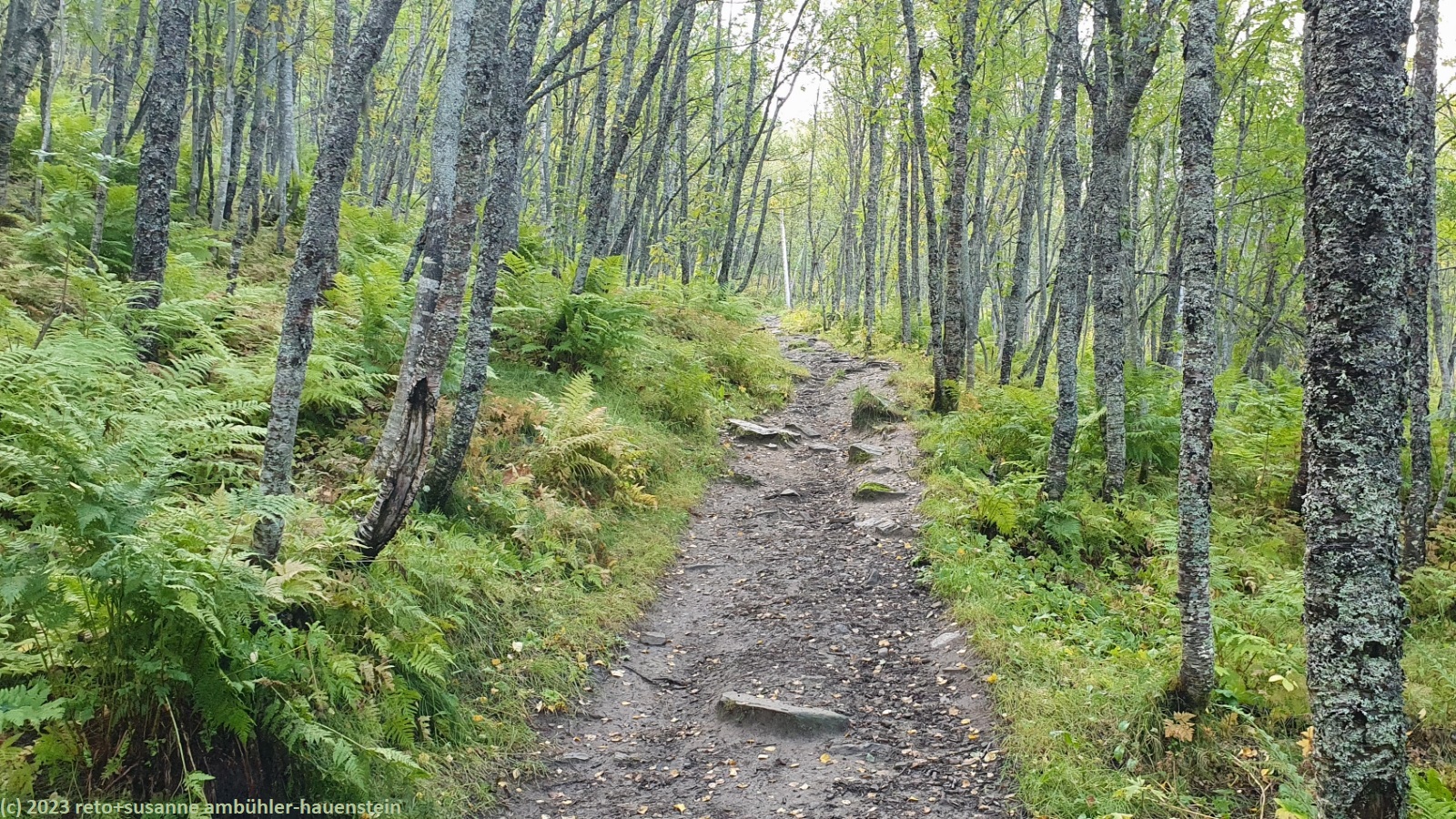 unser handy weckt uns auch heute um 8 uhr. es nieselt immer noch etwas und die temperatur liegt bei 12°C, da frühstücken wir lieber im jogi. gegen 09:45 uhr brechen wir zu unserer kurzwanderung auf. durch ein nettes einfamilienhäuserquartier gelangen wir zum fuss der sherpatrappa. diese führt auf den 400 meter hohen storsteinen hinauf, den hausberg von tromsø. die treppe besteht aus steinen und führt anfangs durch einen schönen, dichten birkenwald. der regen hat inzwischen aufgehört. während dem aufstieg kommen wir ordentlich ins schwitzen, damit haben wir heute nicht gerechnet. bei einer lücke im wald haben wir einen ersten schönen blick auf die stadt. alle hundert stufen ist die anzahl überwundener stufen eingraviert. etwa auf halbem weg kommen wir über die waldgrenze. auf der obersten stufe ist die zahl 1203 eingraviert. bei der bergstation der luftseilbahn hat es ein wunderschönes restaurant. wir stärken uns mit einem tee, bzw. kaffee und einem brötchen.